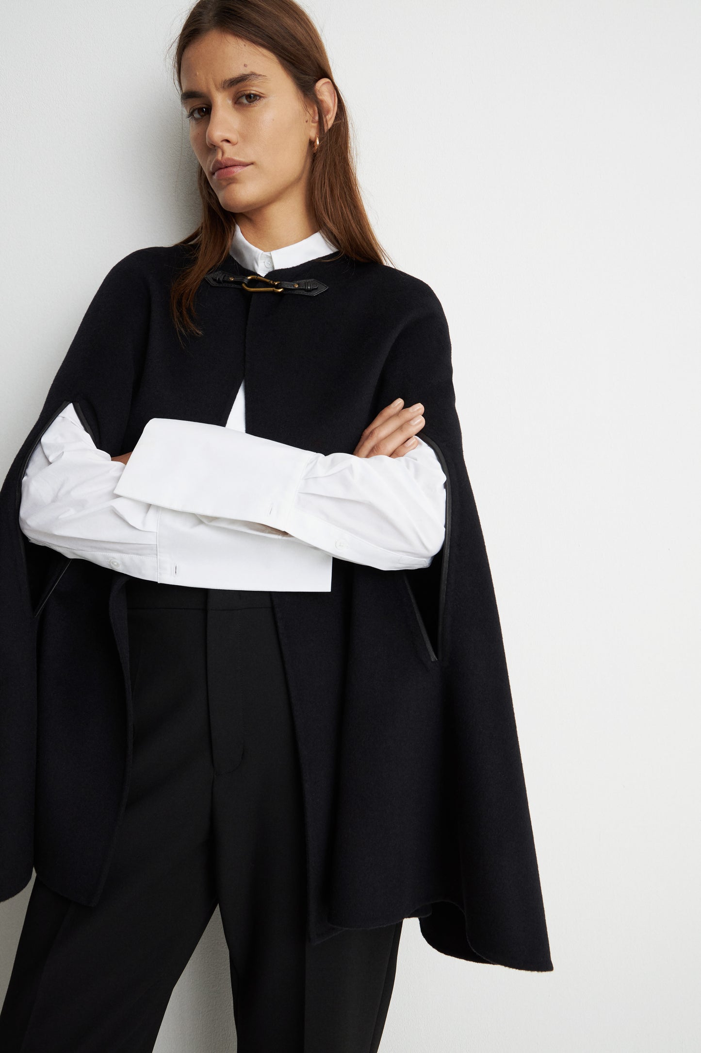 Leather-trimmed, A-line cape in soft wool blend and lyocell content. Round neck and vent appliqués. Features a lobster clasp fastening at front. Hand made.