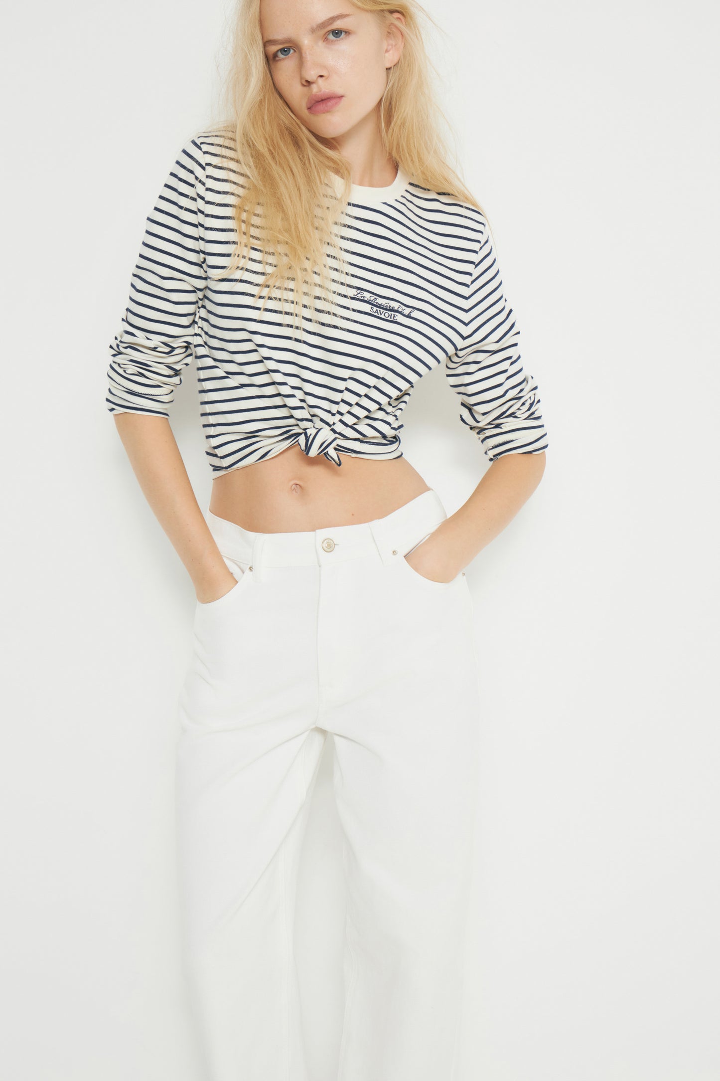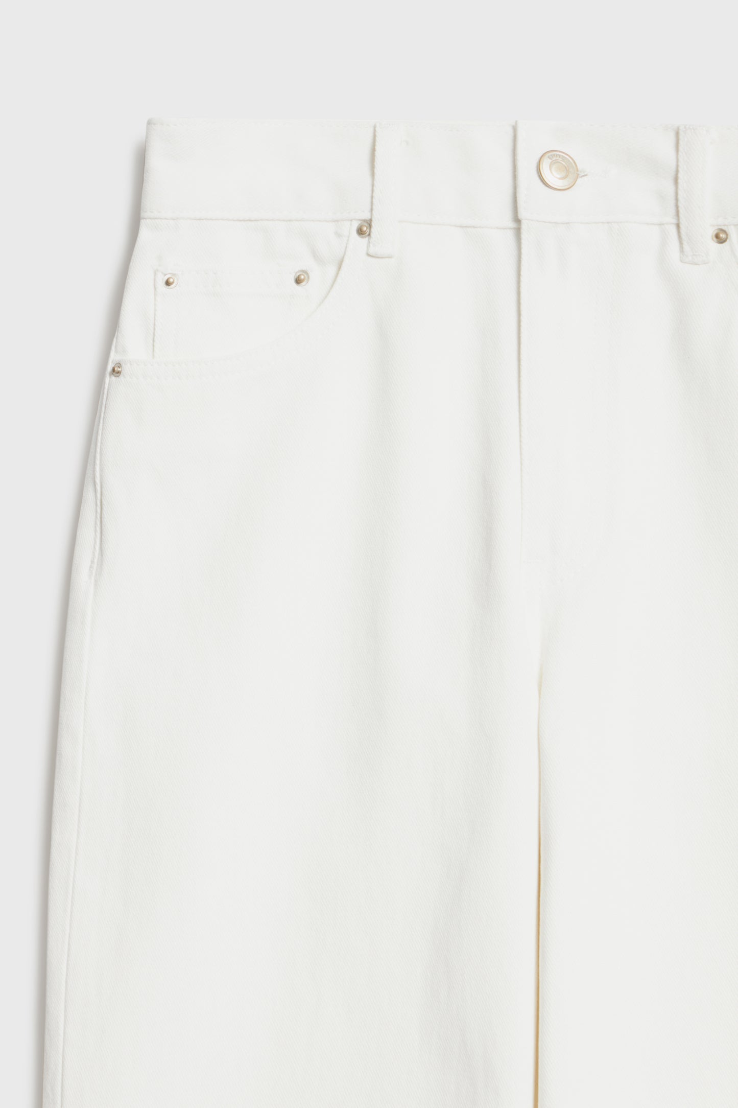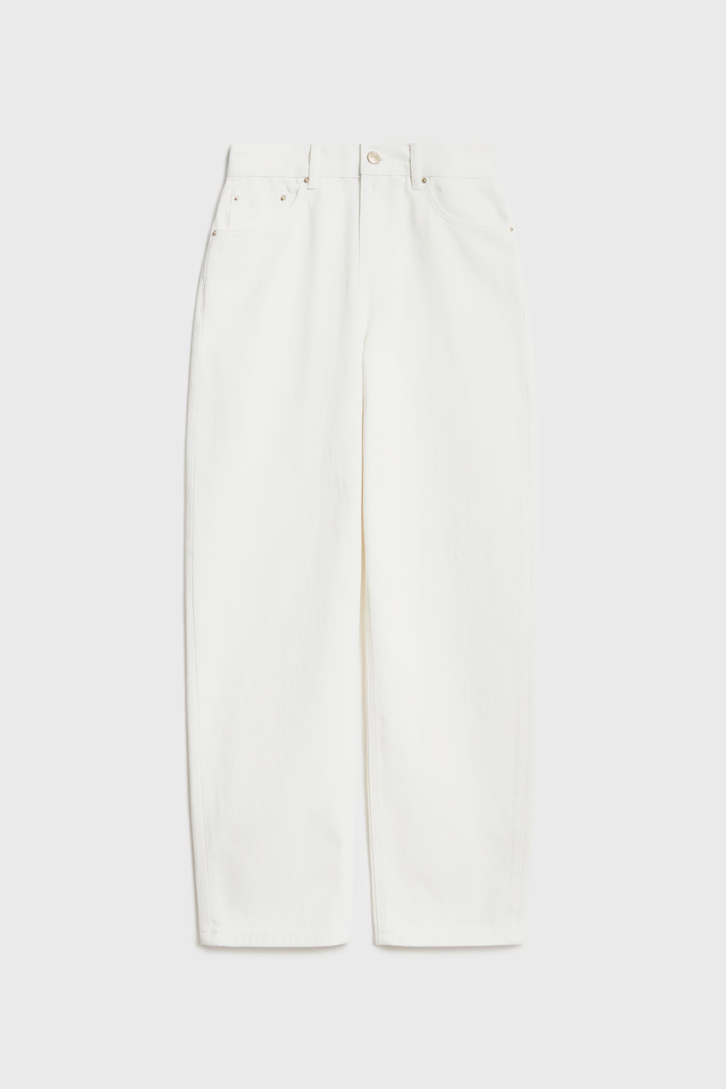 New style of classic mom-fit jeans cut. Staple with high-rise, slightly tapered hems, and five-pocket design. Crafted from cotton denim. Zip fly and metal top button fastening.