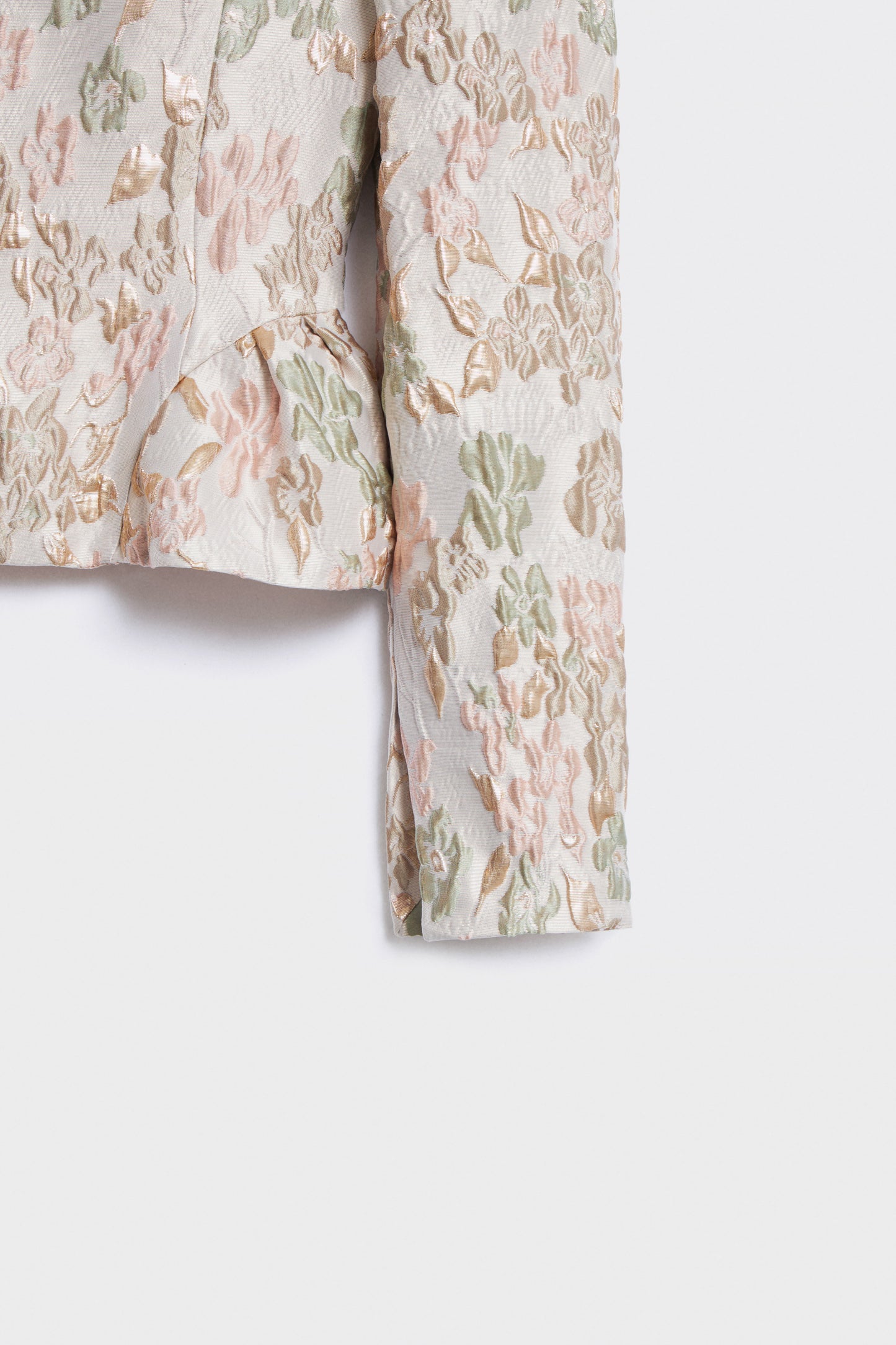Blouse in jacquard-weave fabric with a fitted waist. Long puff sleeves. Matching satin lining. Covered buttons down the front.