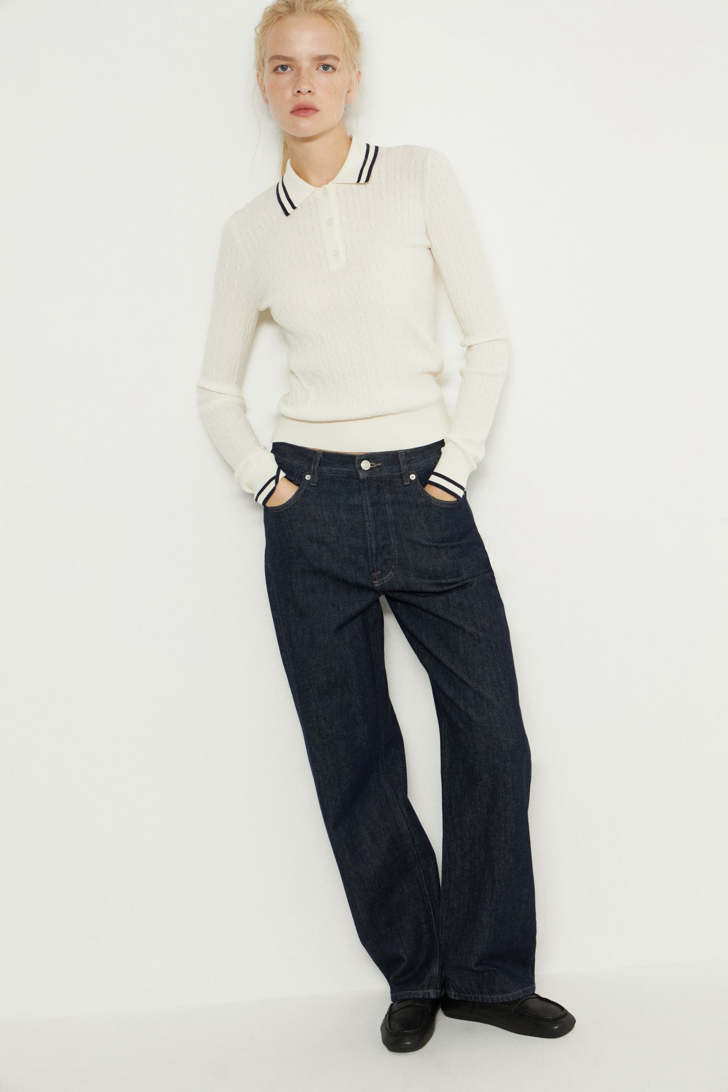Fitted jumper in a soft cable-knit made of lyocell blend. Contrast trim. Detailed with long sleeves and collar with a front button fastening.