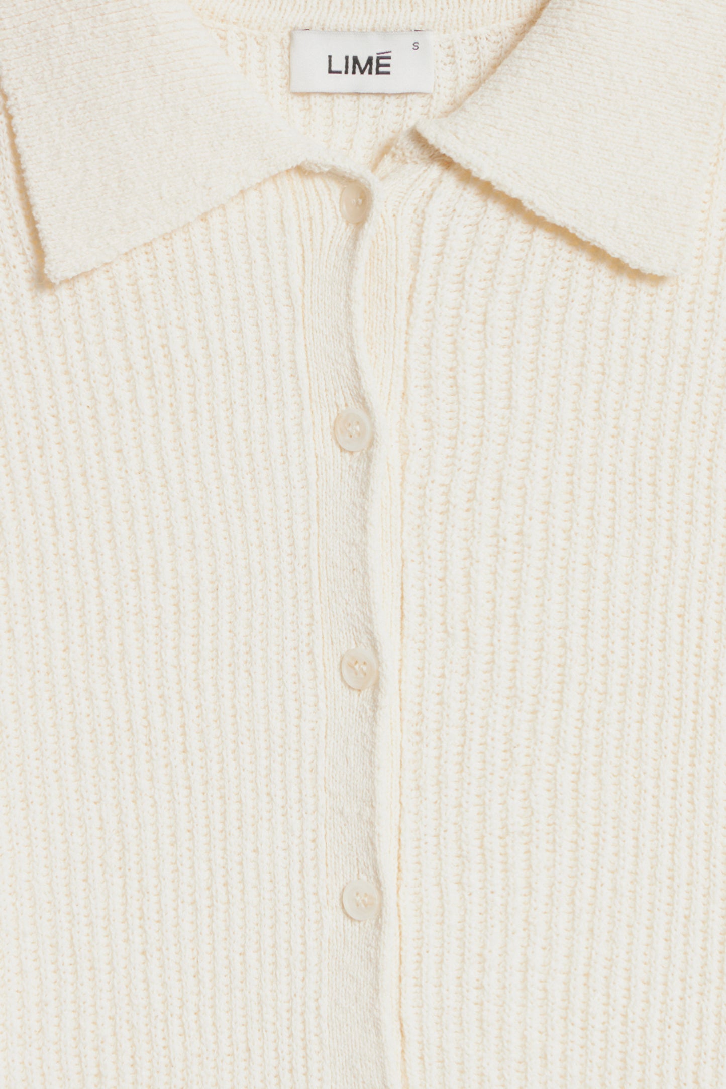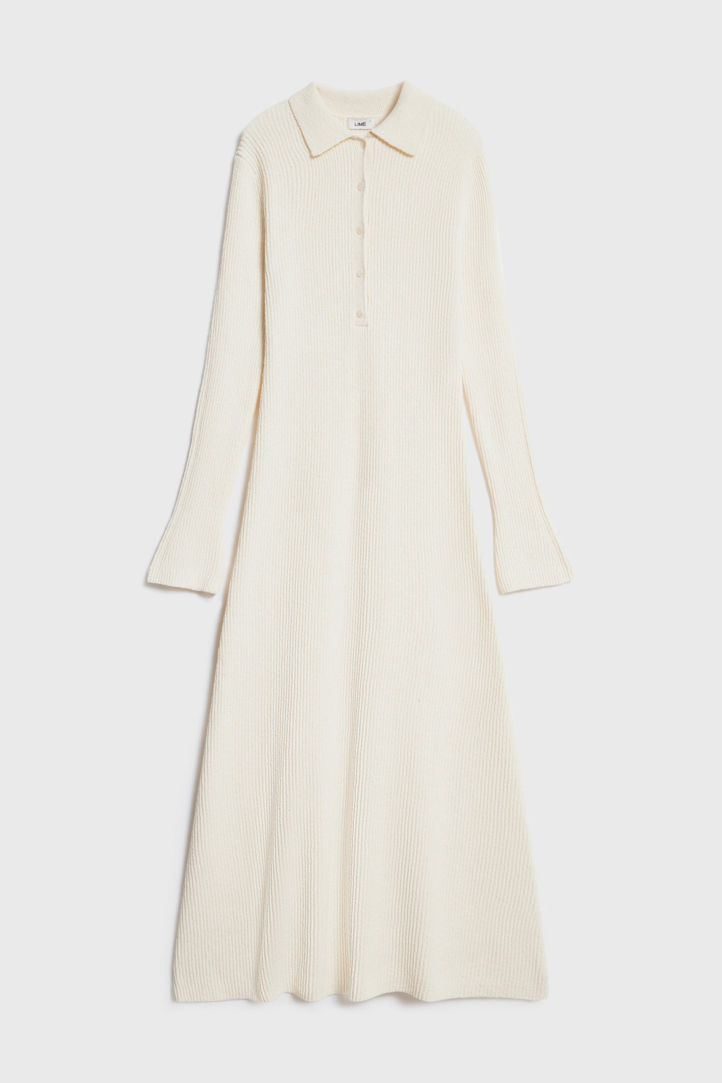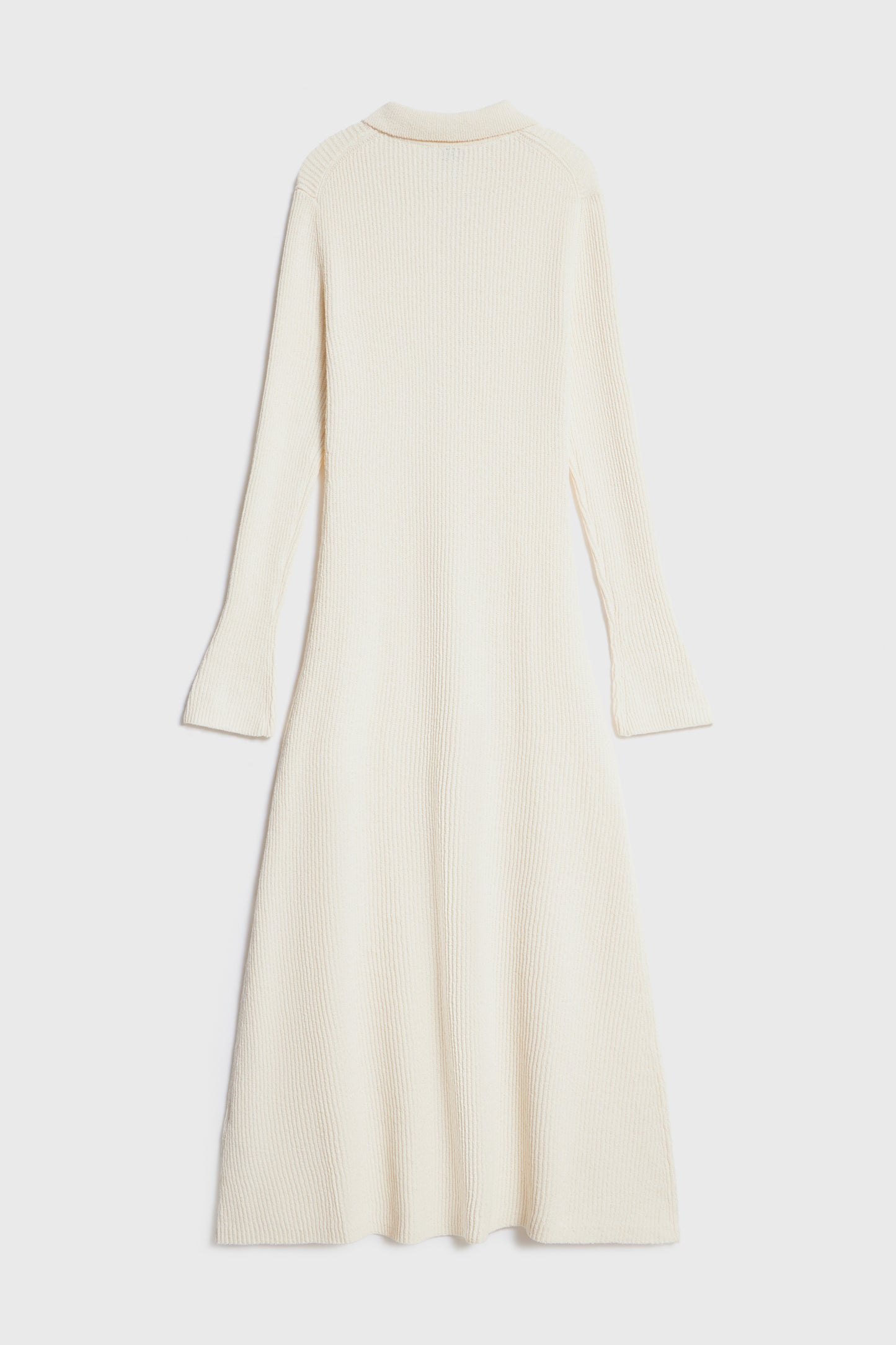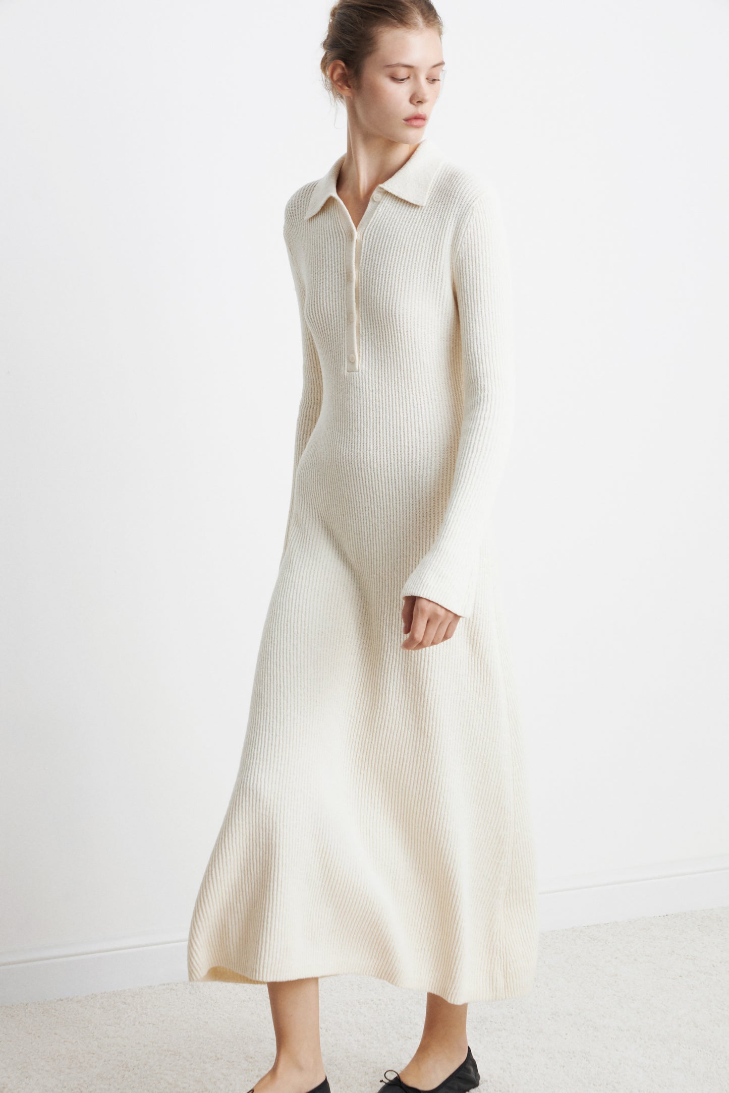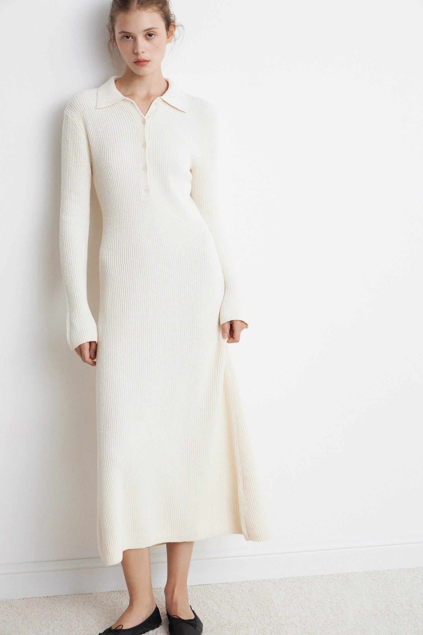 Long, fitted dress in a soft, ribbed fine knit cotton blend. Collar, short button placket, and long sleeves with flared cuffs.