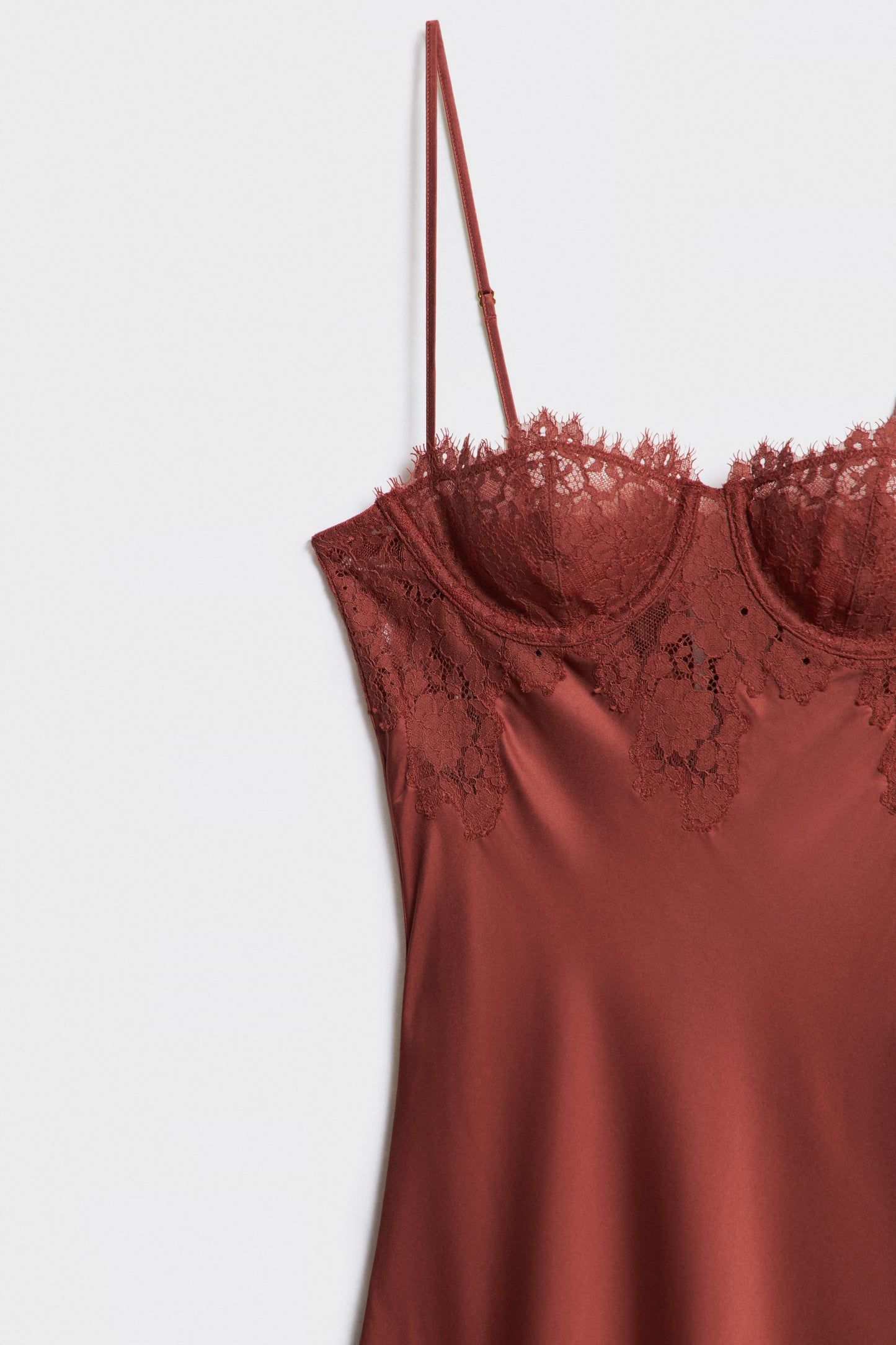 Slip dress made of viscose satin fabric with double-layered cups that give the bust a natural shape and light support. Lace trim at upper edge. Adjustable shoulder straps.