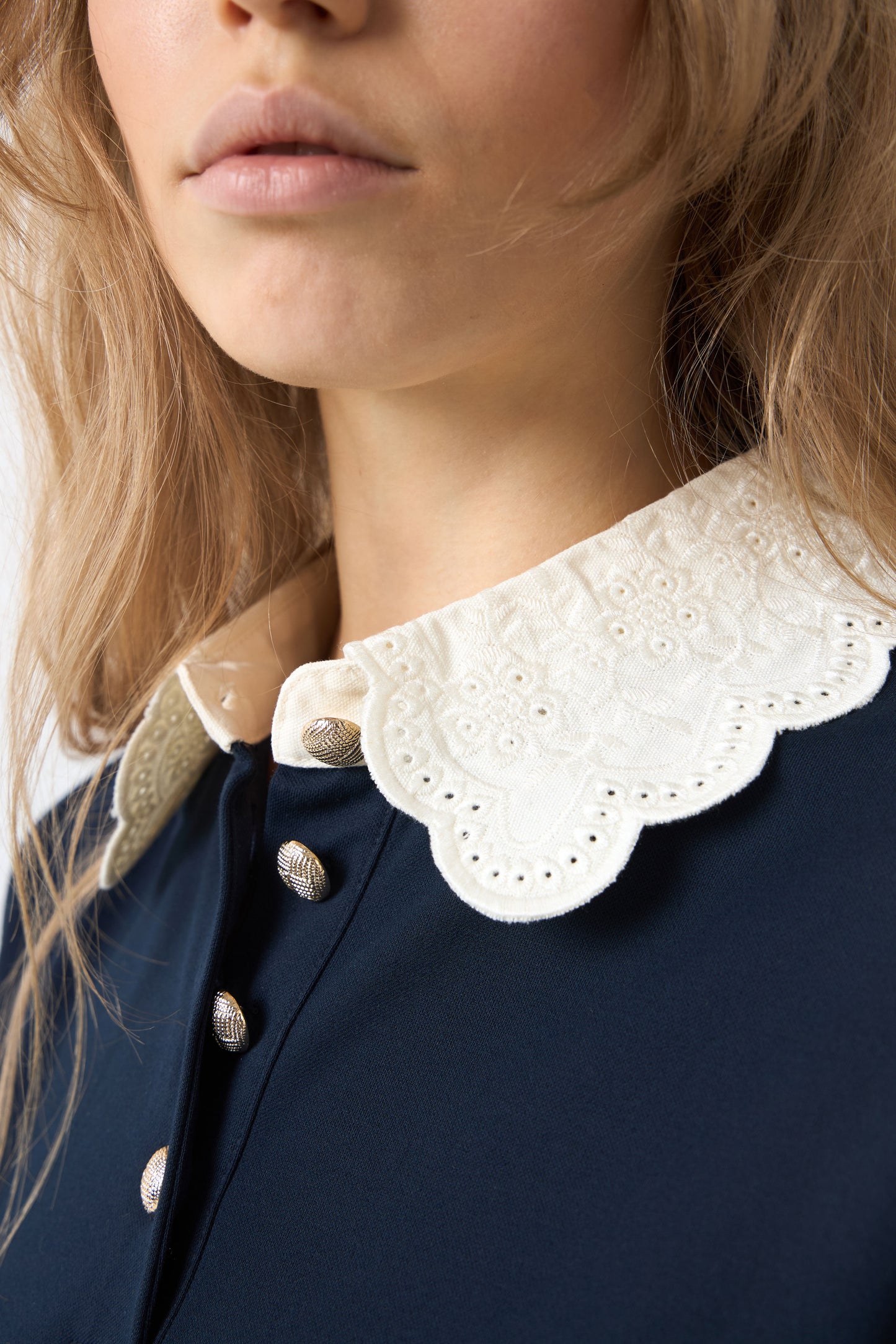 Regular-fit T-shirt in lightweight viscose blend jersey with a classic silhouette. Lace collar, placket with metal buttons, and short sleeves