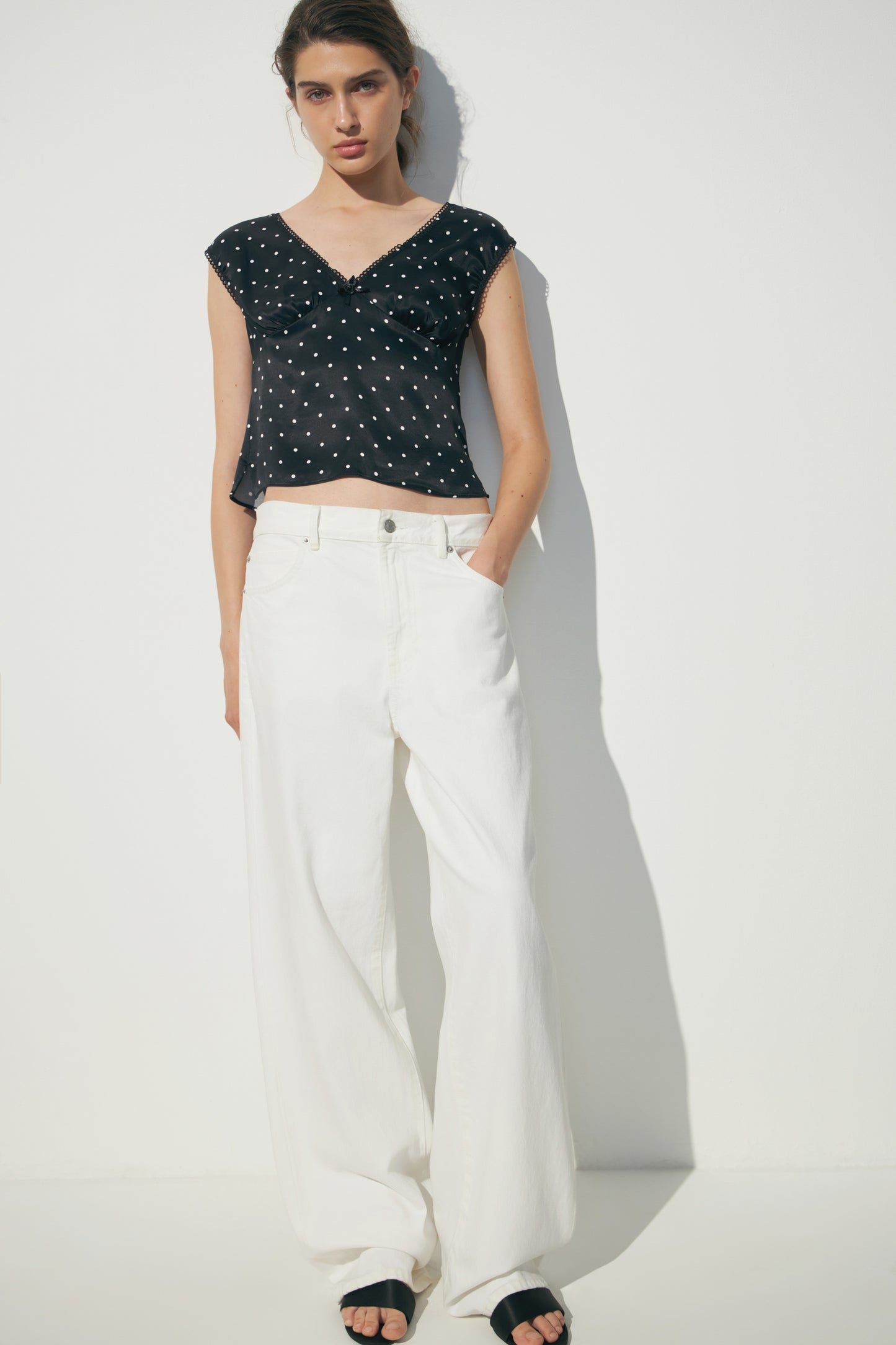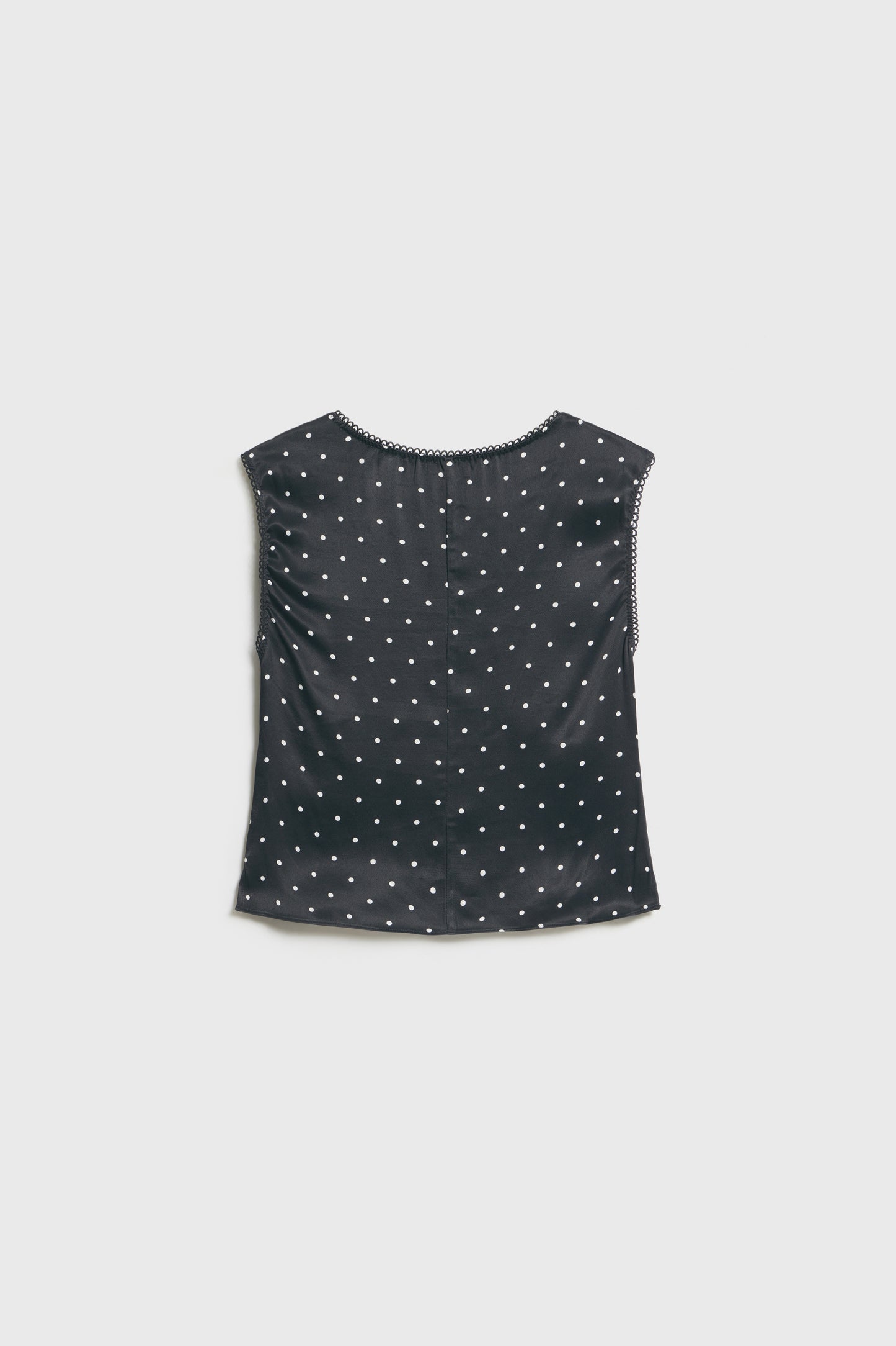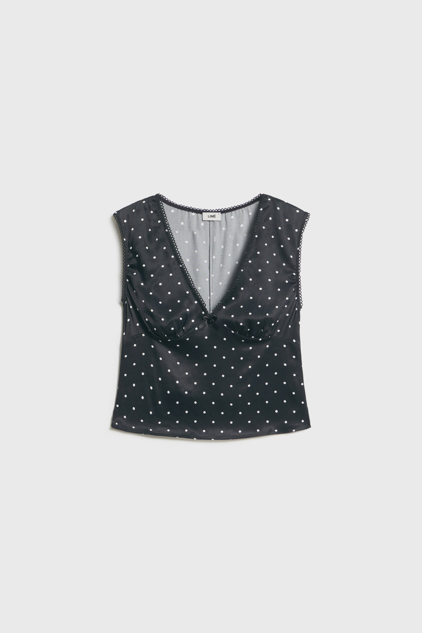 Short blouse in satin viscose with a printed design and picot trims. Low-cut V-neck, small rose and a bow below the bust.