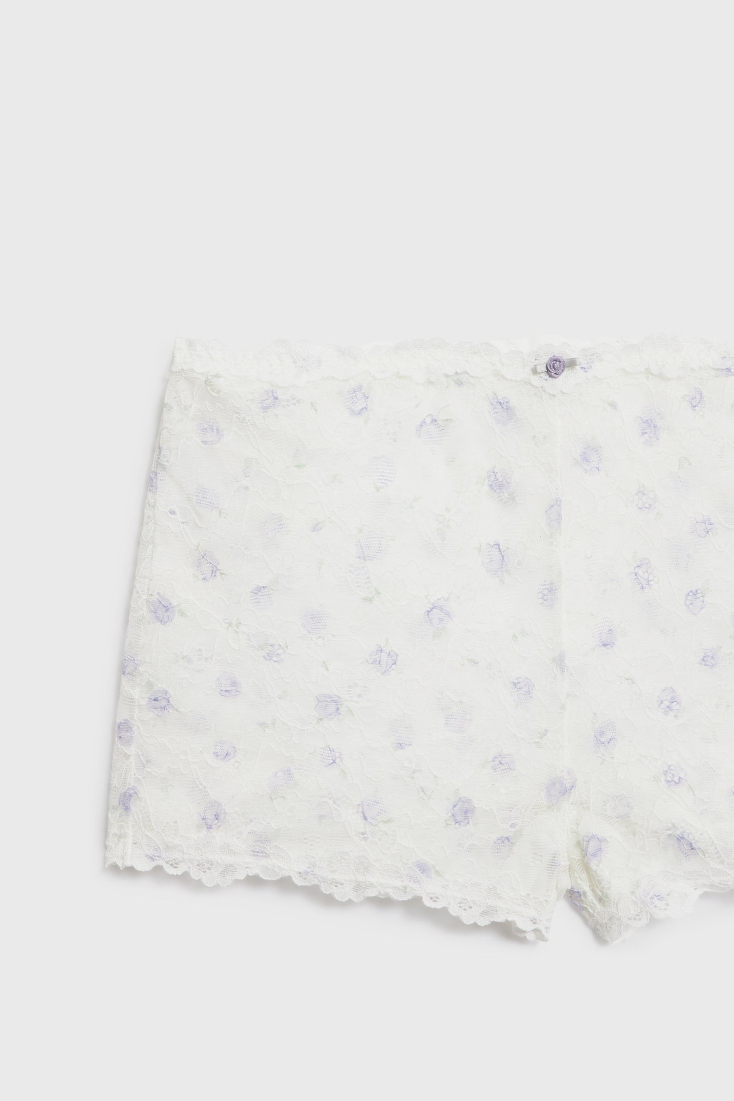Short shorts in lace with small rose and bow at front. The garment has soft hygiene gusset.
