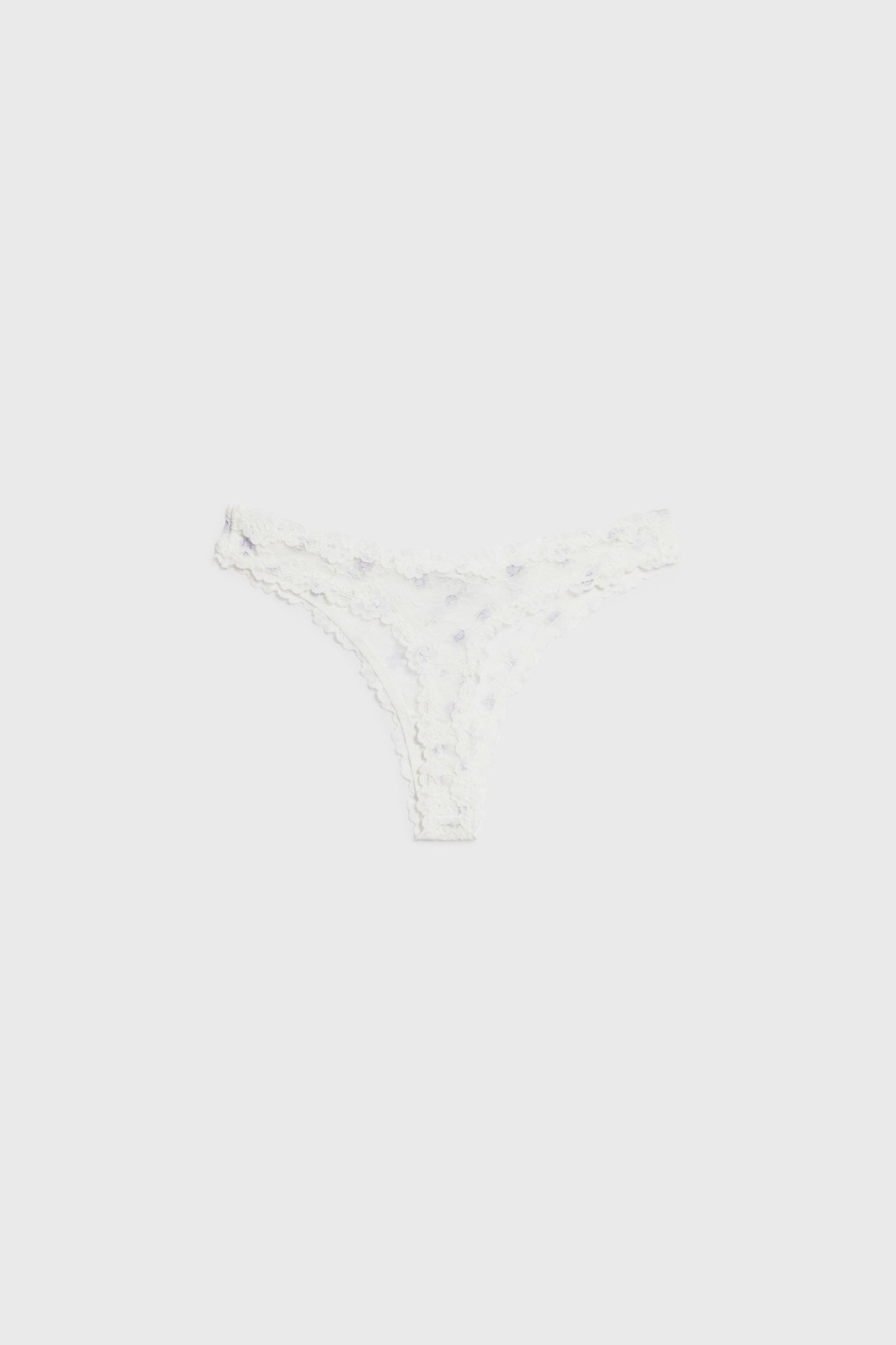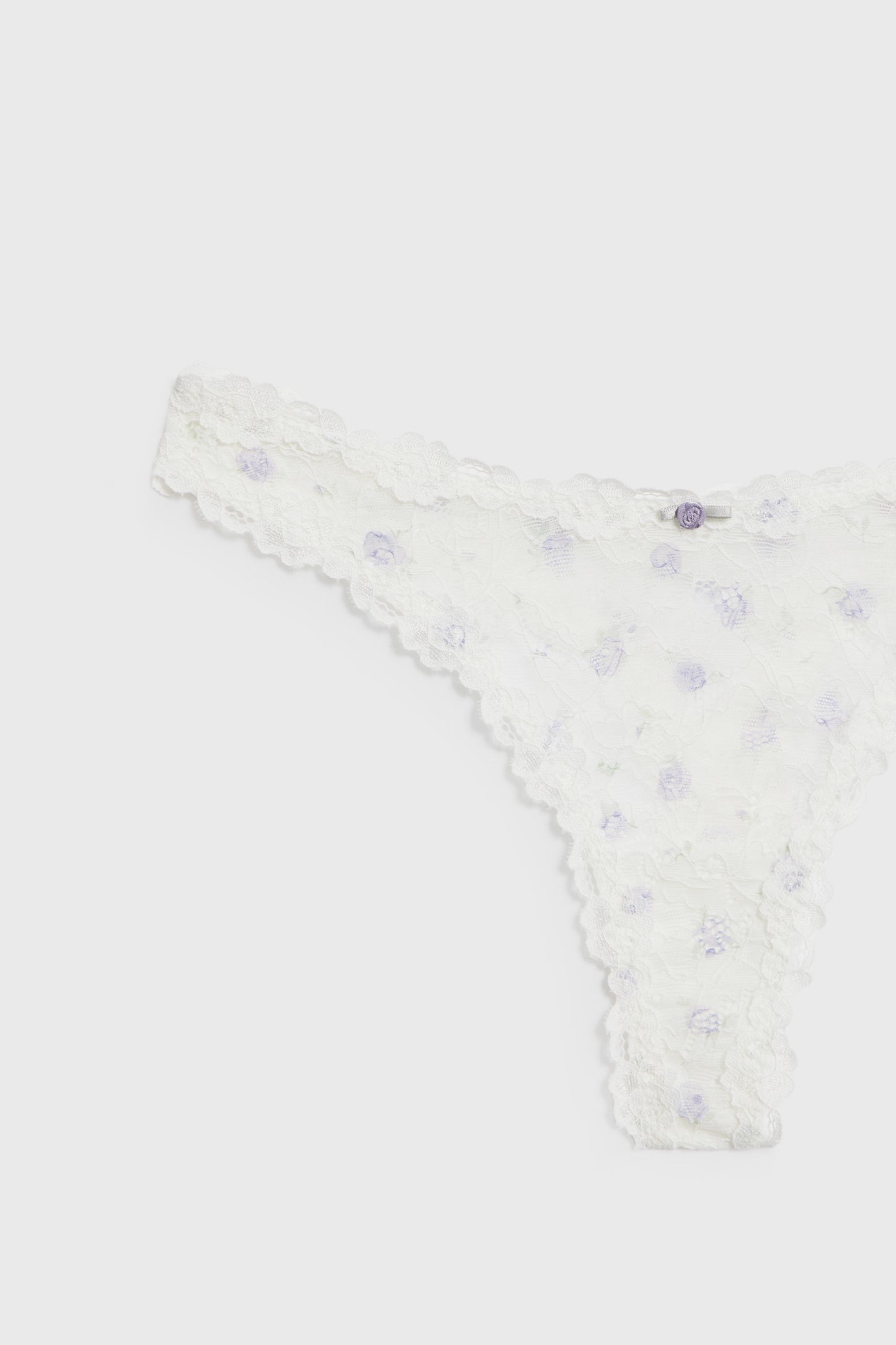 Thong briefs in lace with a small rose and bow at front. The garment has soft hygiene gusset.
