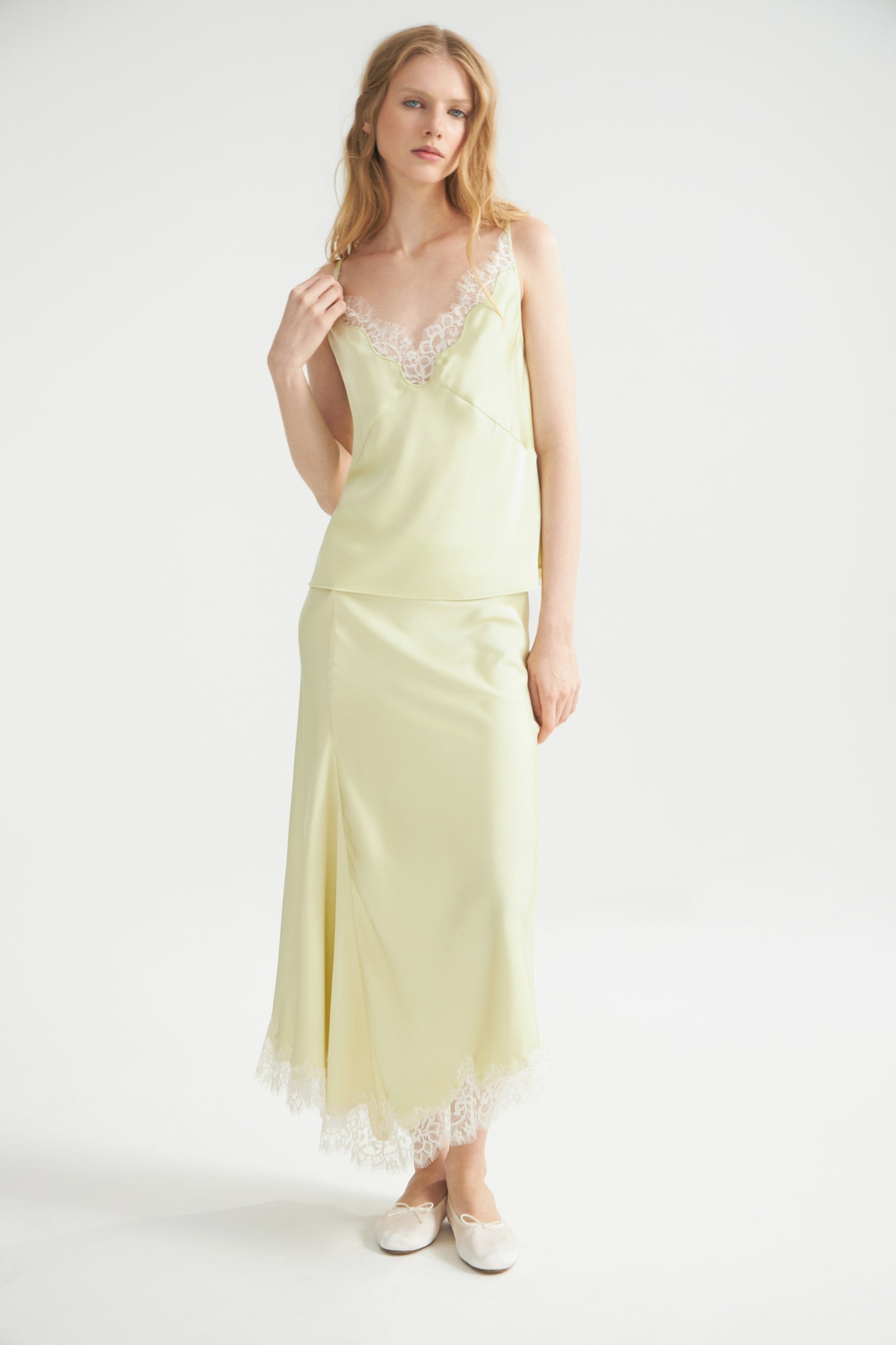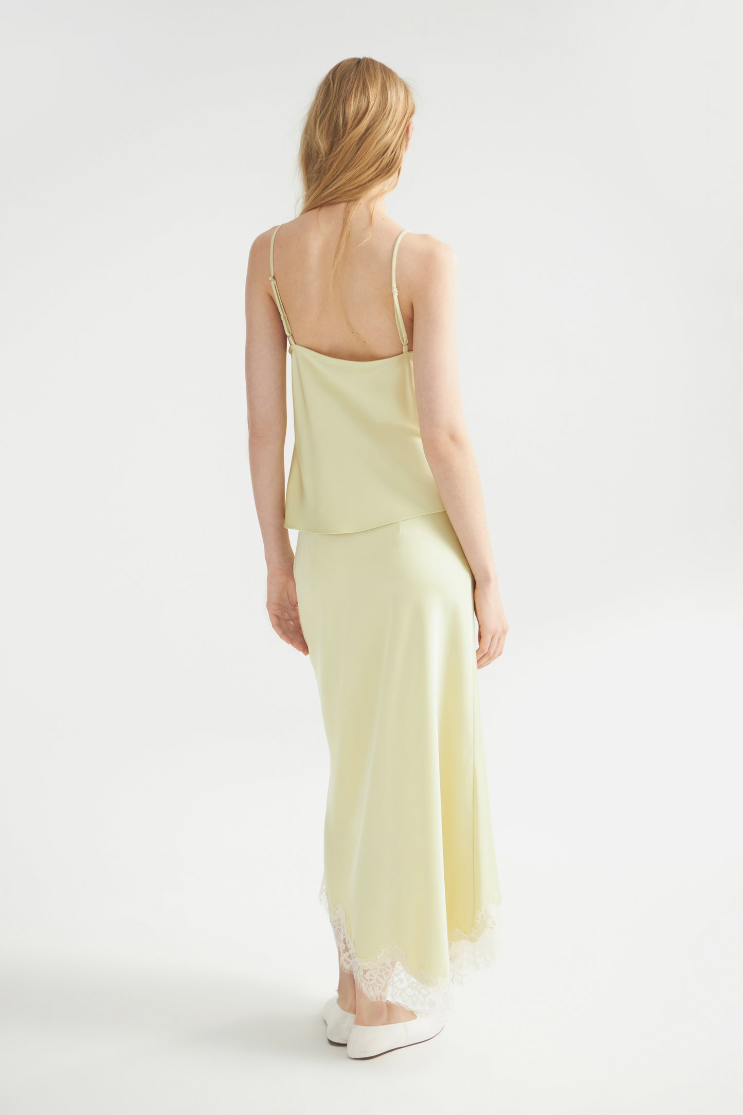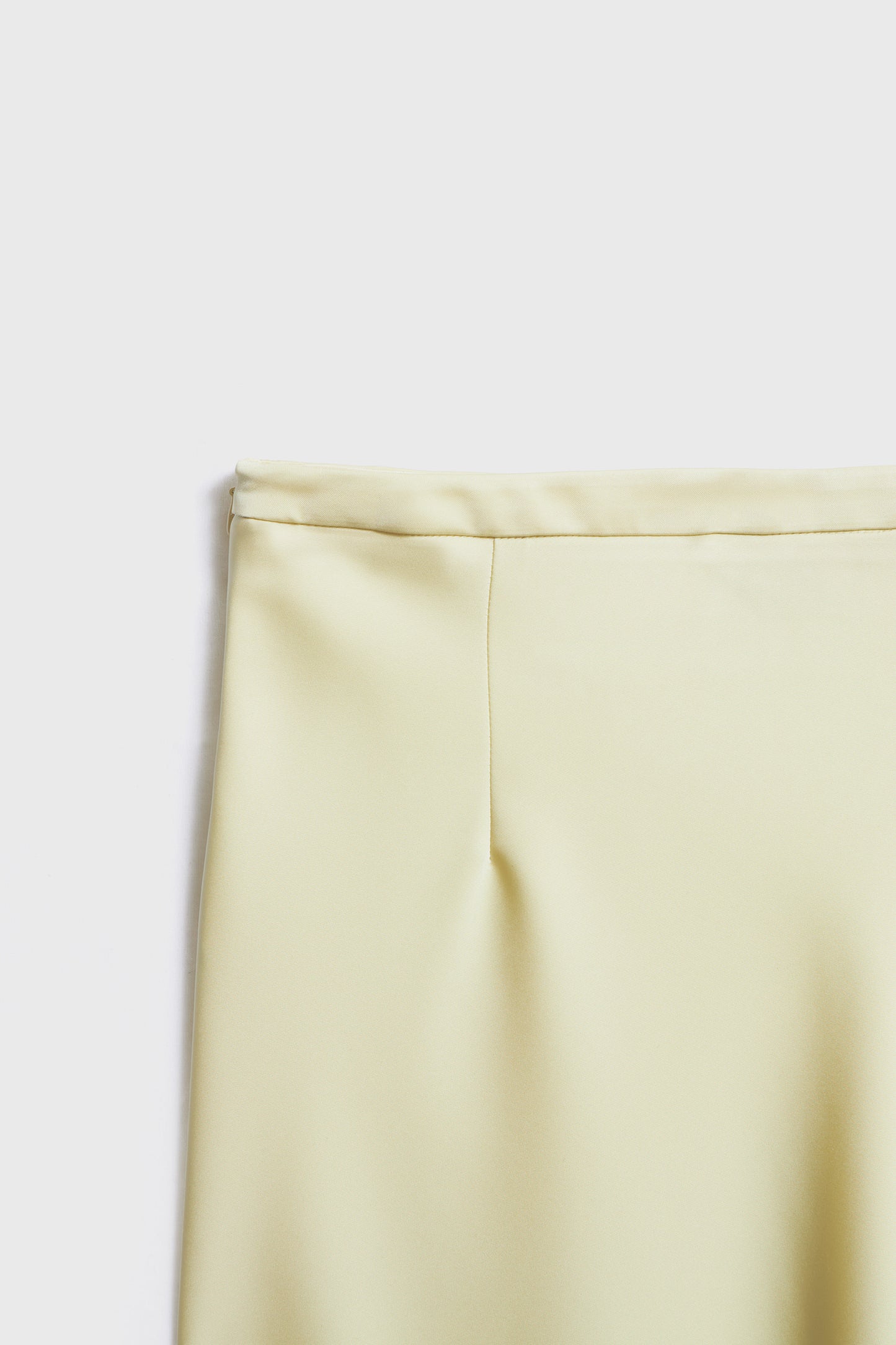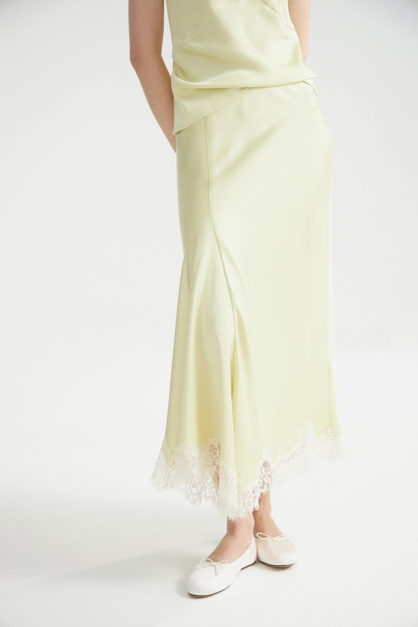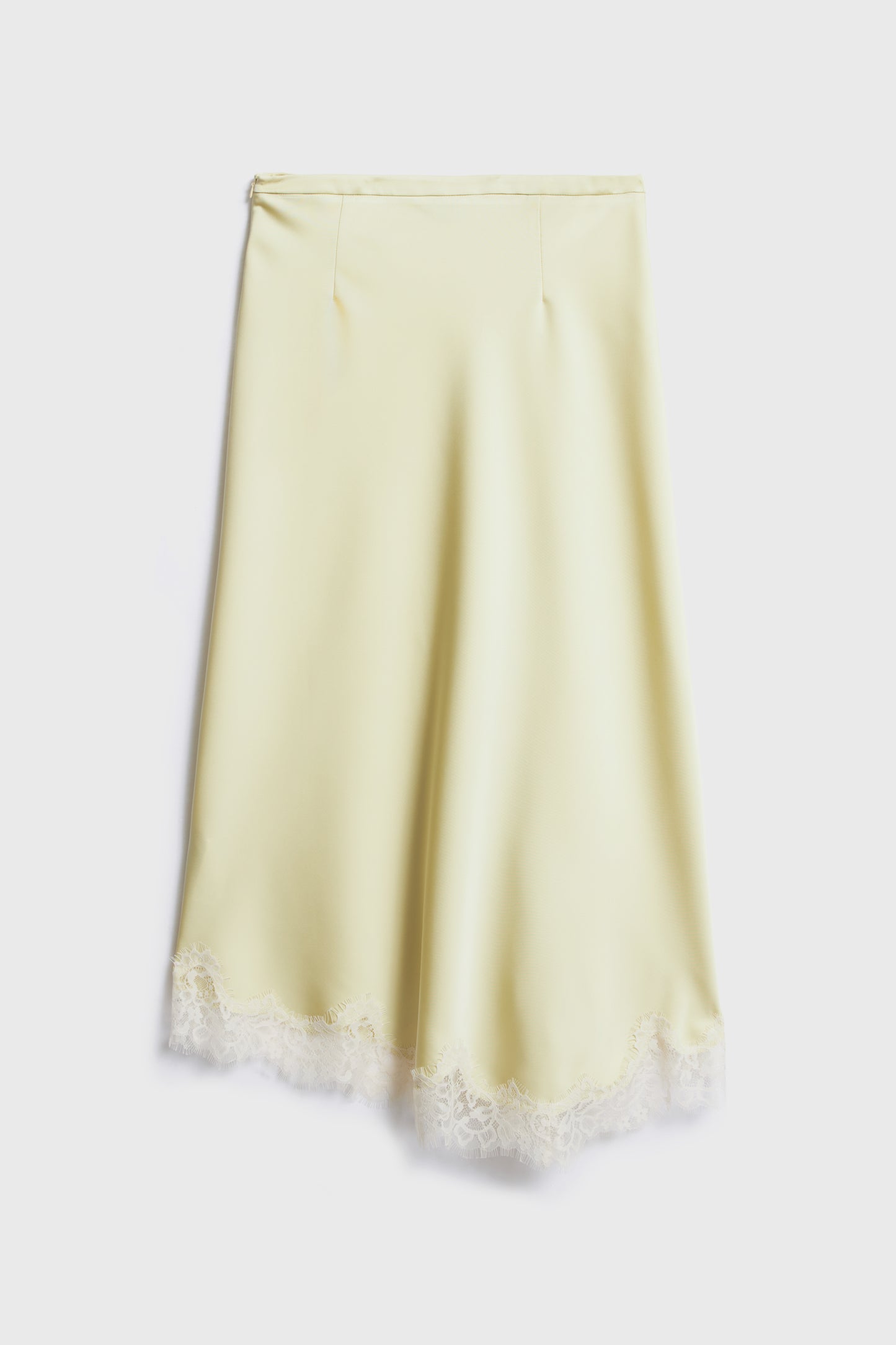 Calf-length skirt in silky woven fabric with a front pleat and asymmetric hem. Styled with a scalloped lace trim. Hidden zip closure at the side.