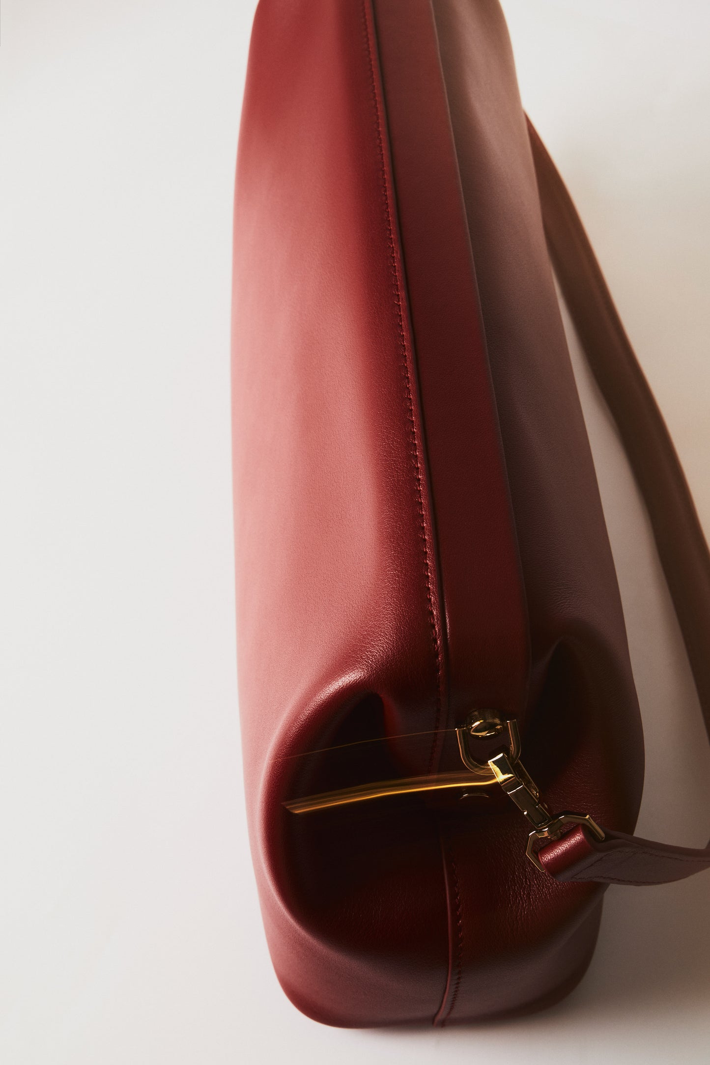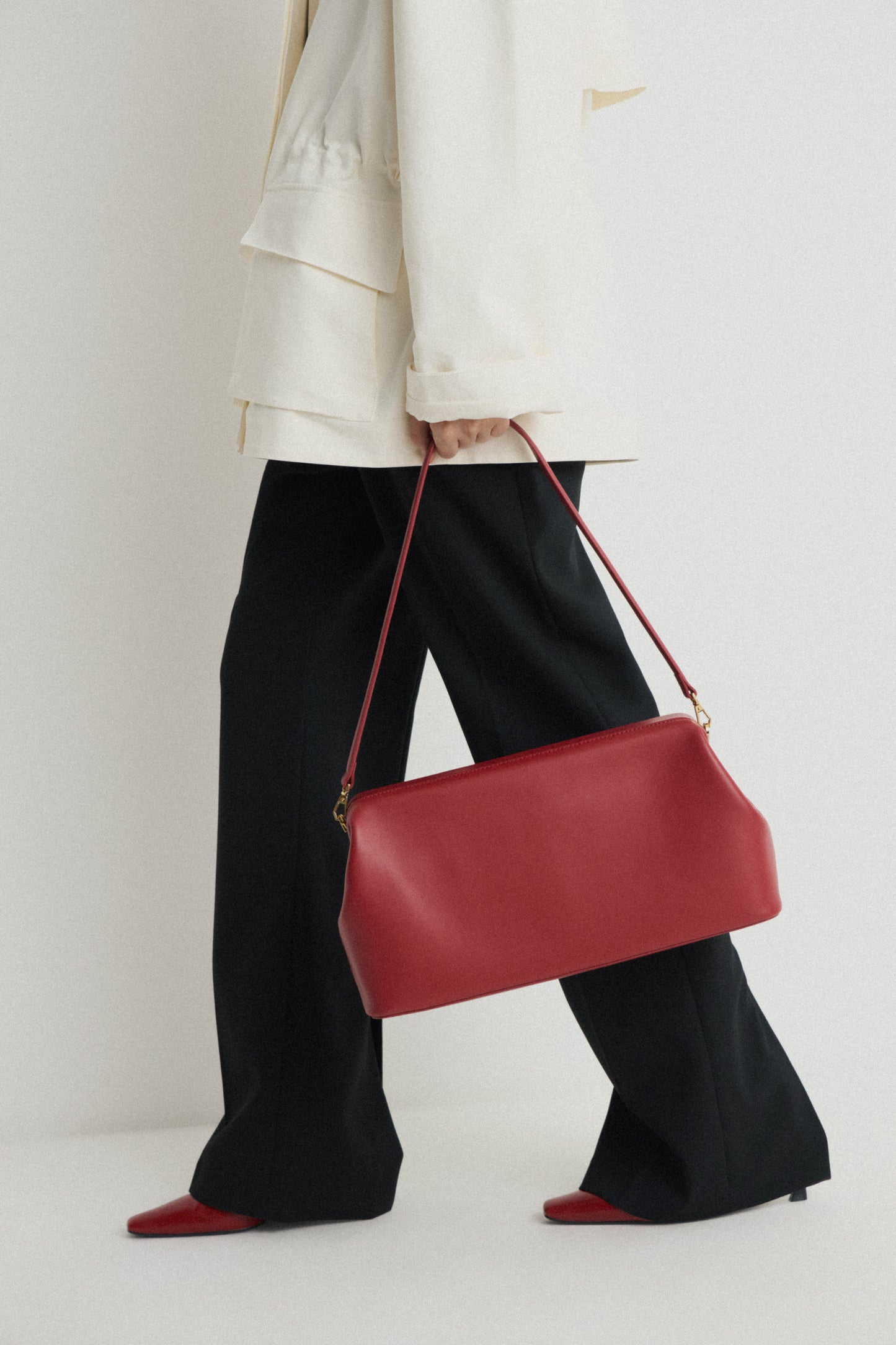Retro-style leather bag. Detachable top handle. Main compartment with metal closure. Interior features a cardholder-style pocket. Lined. Zip closure. Size: 38 х 10 х 19 cm (length х width х height).