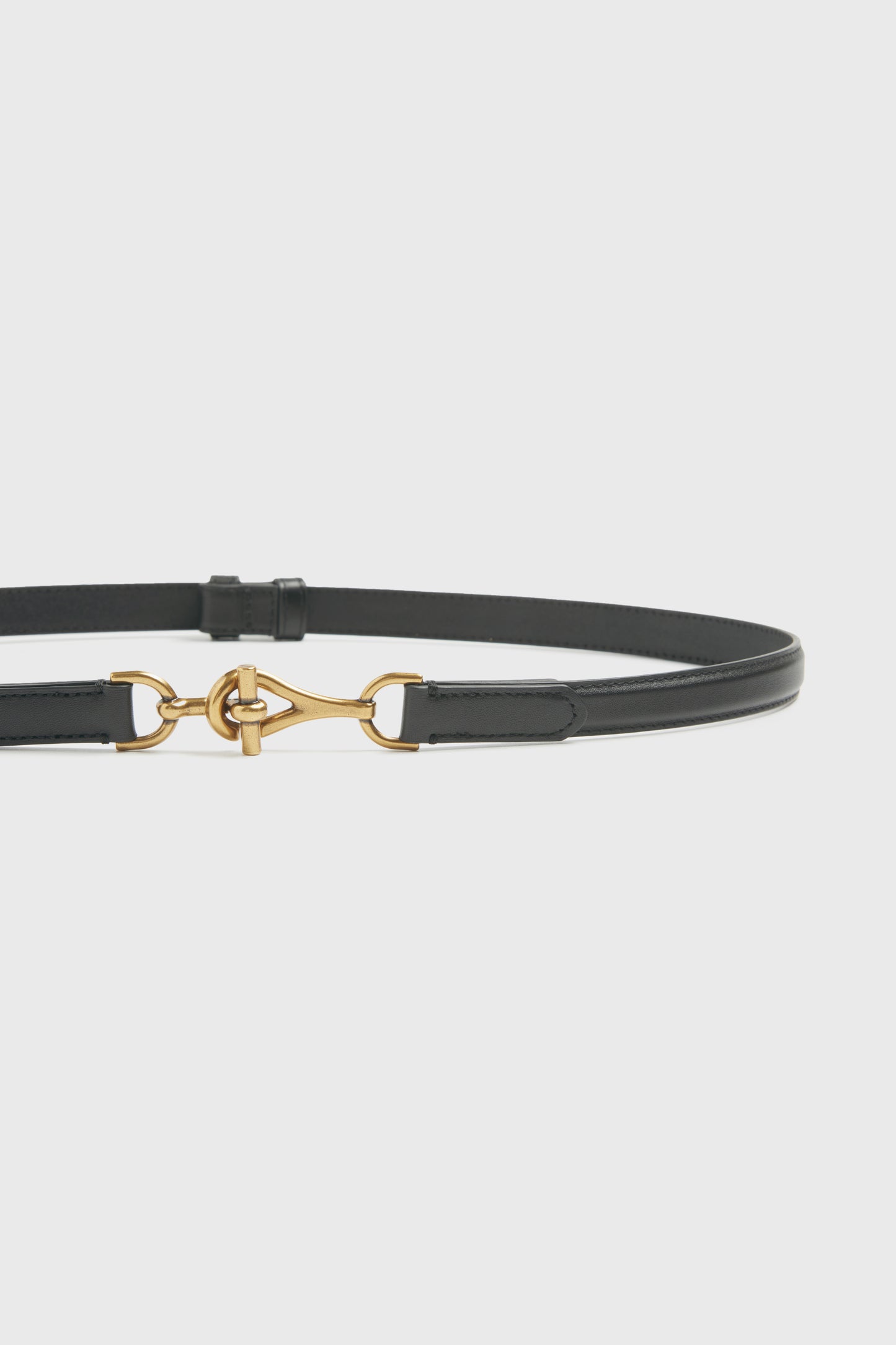 Adjustable belt made of genuine matte leather. Gold-tone buckle in an equestrian-inspired design, fastened with a metal hook. Size XS/S – 88 x 2,2 cm M/L – 100 x 2,2 cm