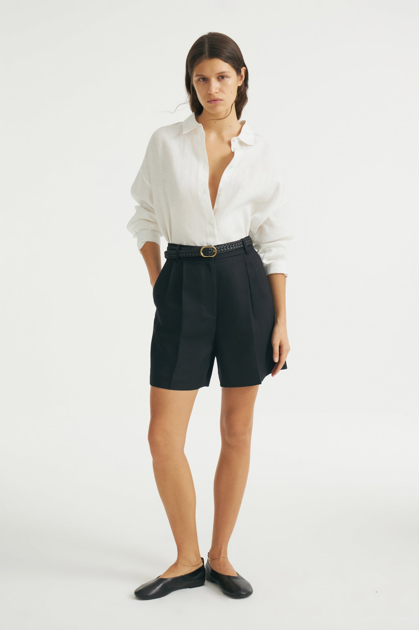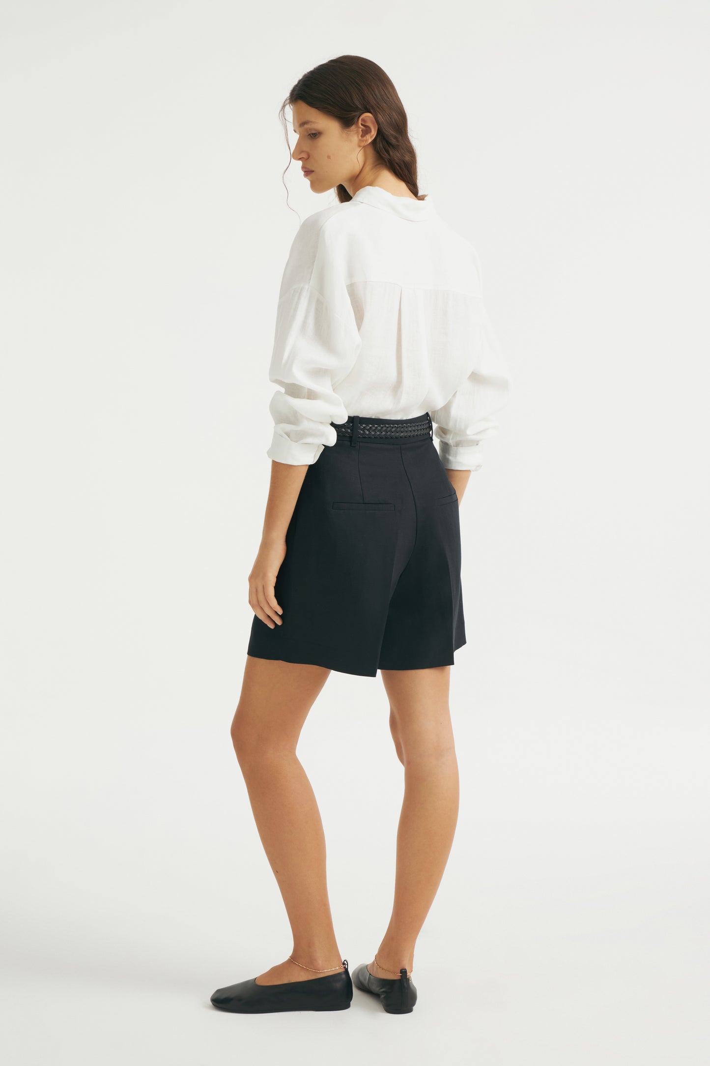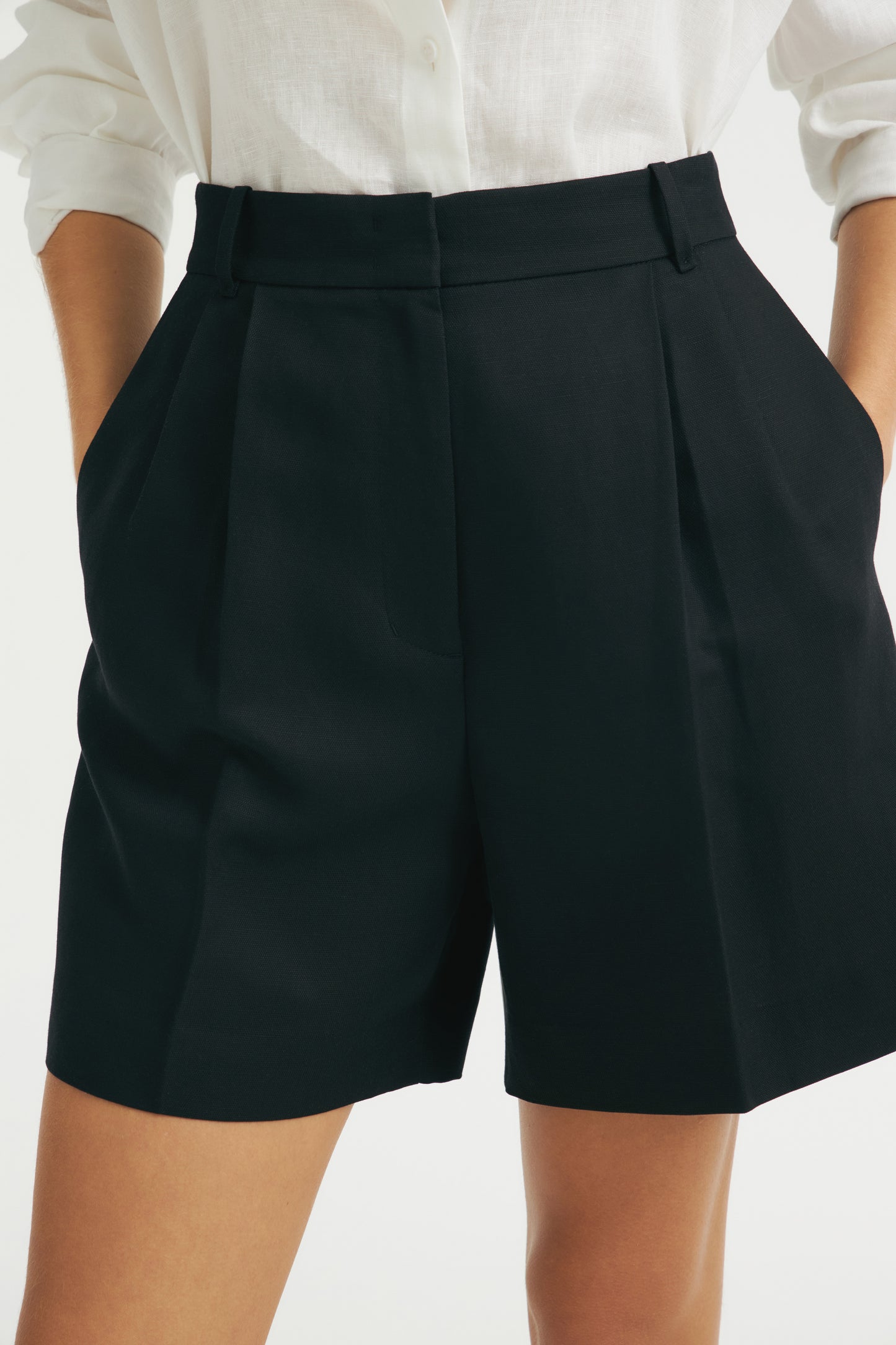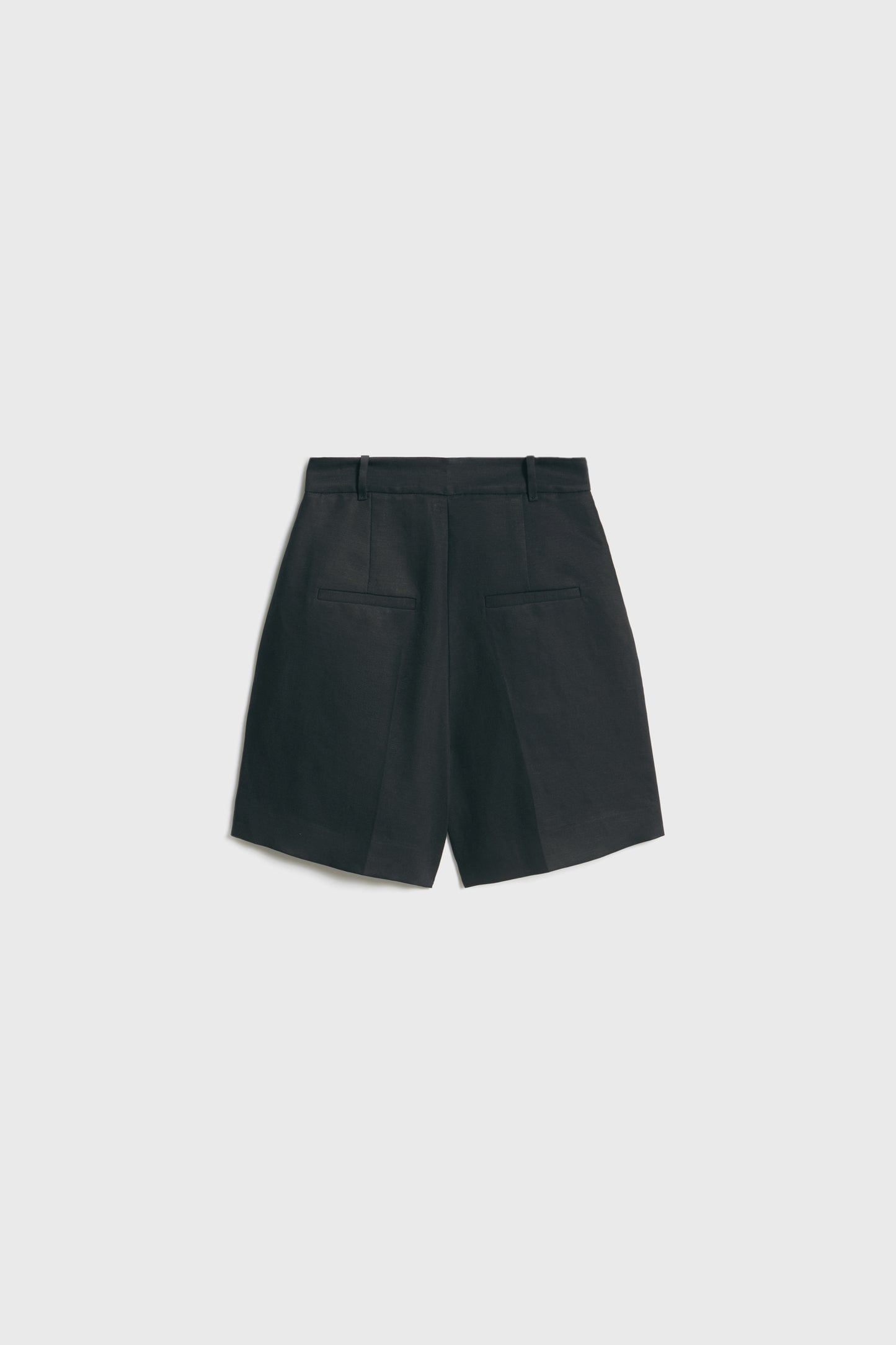 Straight-leg shorts with darts made of a lyocell and linen blend. Front side pockets and back welt pockets. Front zip fly, interior button and metal hook fastening.