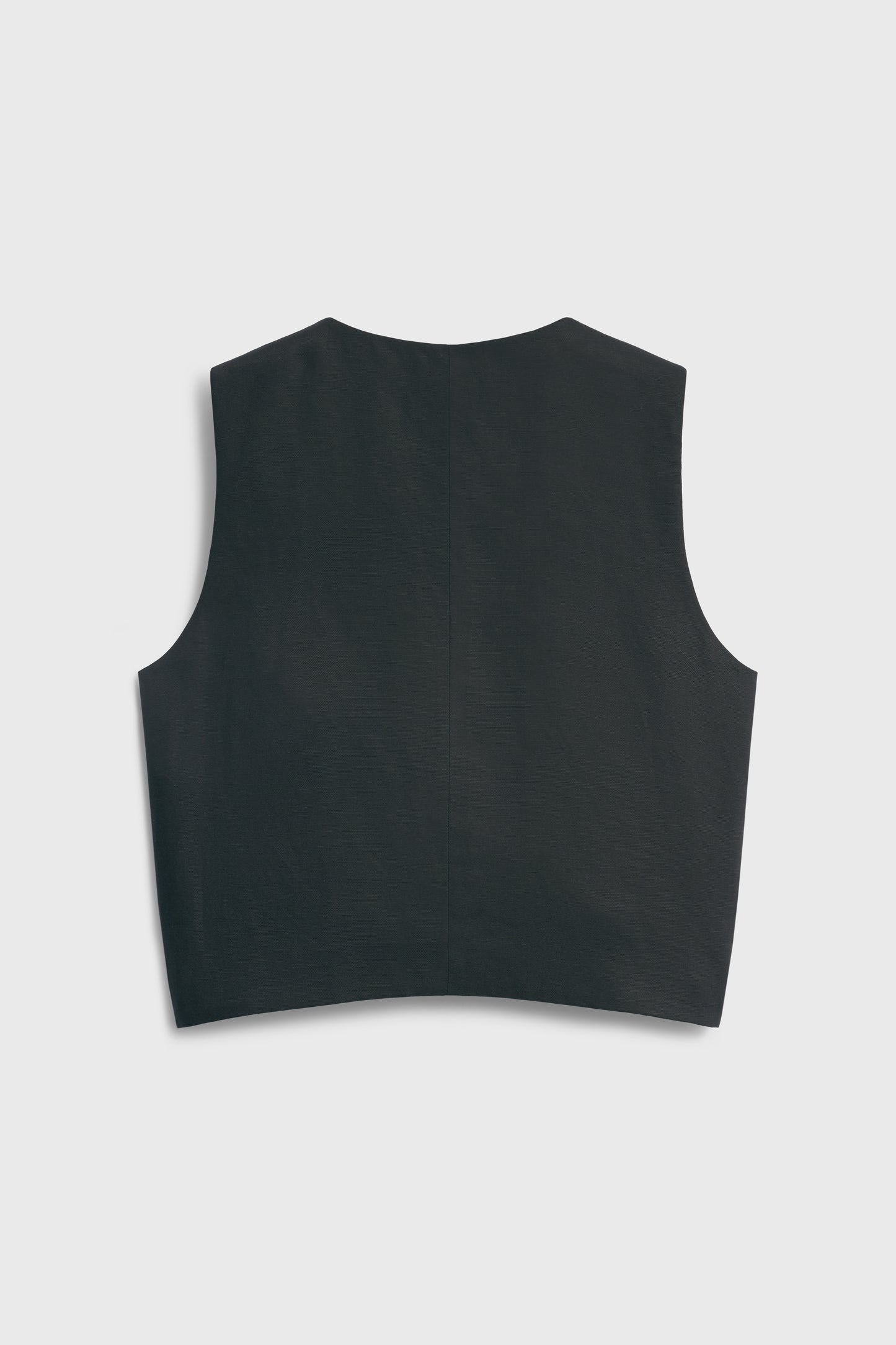 Single-breasted waistcoat with a V-shaped neckline and buttons down the front made from a lyocell and linen blend. Fake welt pockets at the front. Pointed hems. Cotton lining. Straight fit.