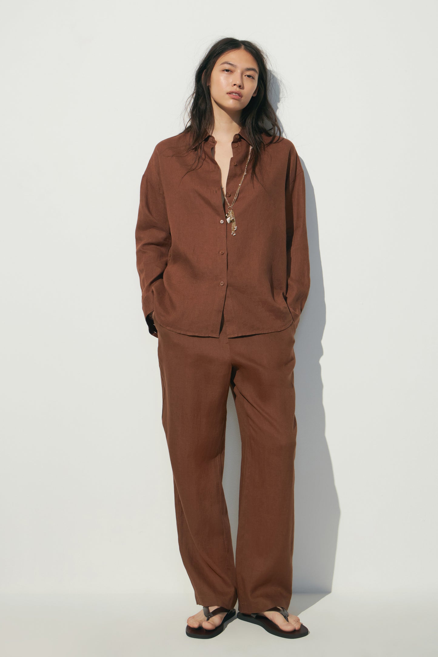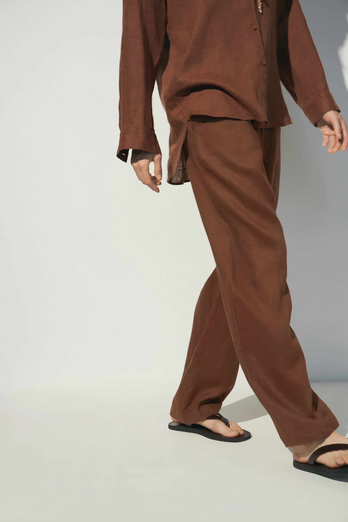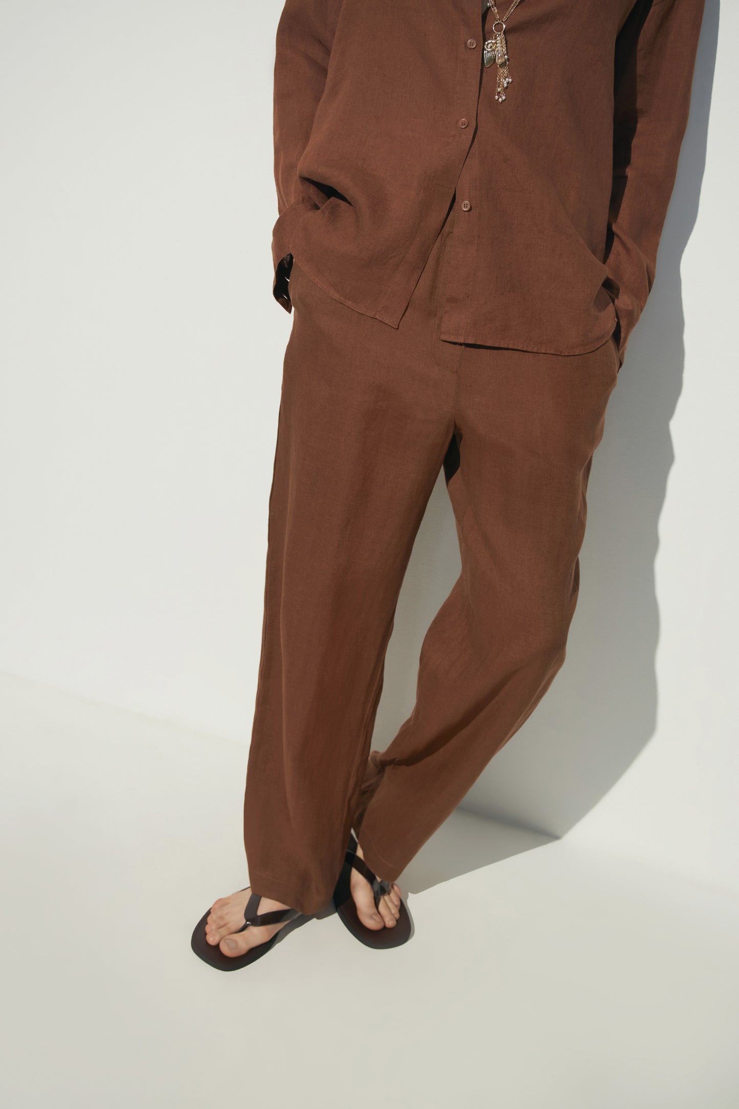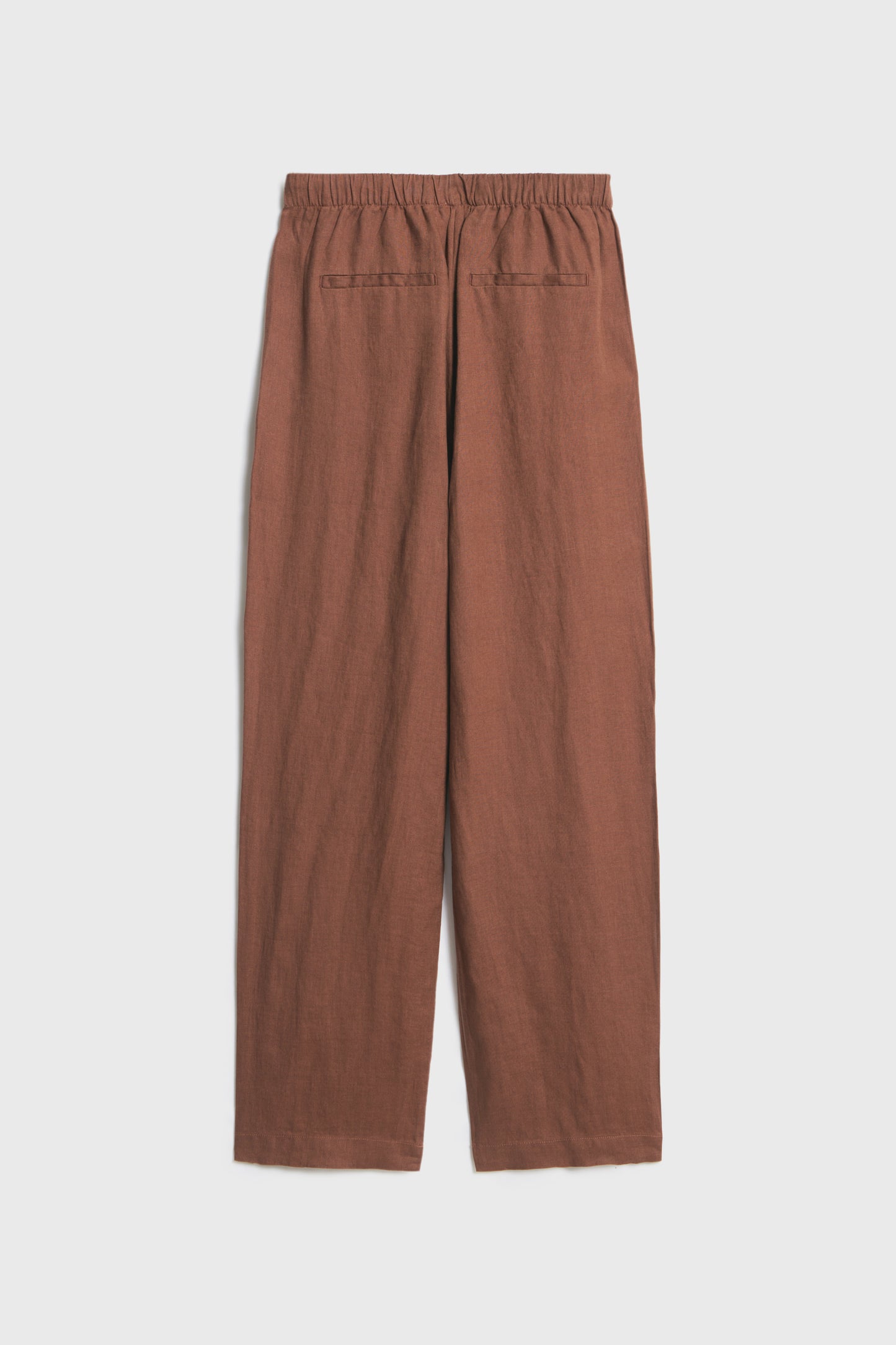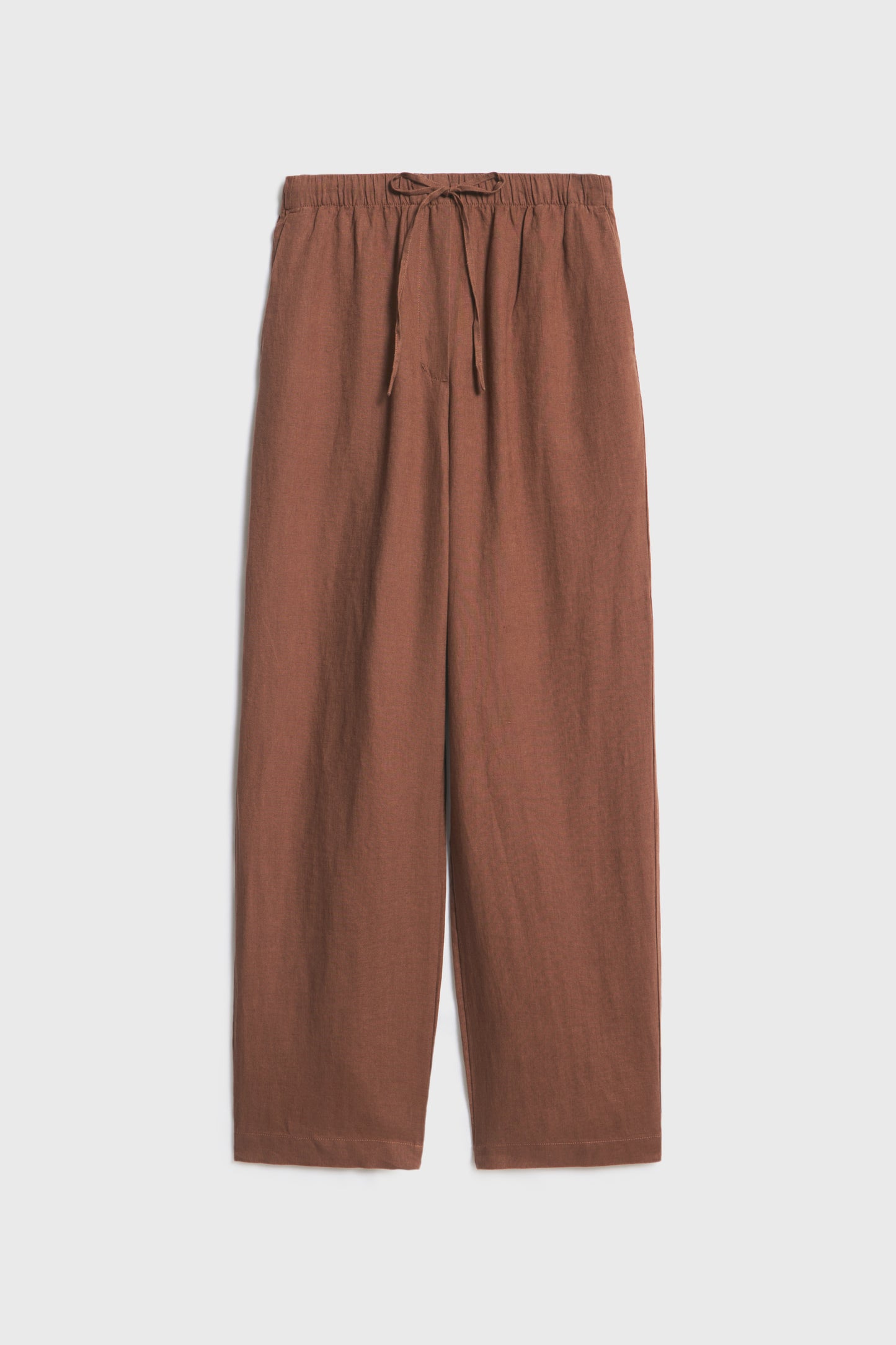 Cropped carrot fit trousers made of 100% linen. Featuring an adjustable elasticized drawstring waistband, side pockets and fake back pockets.
