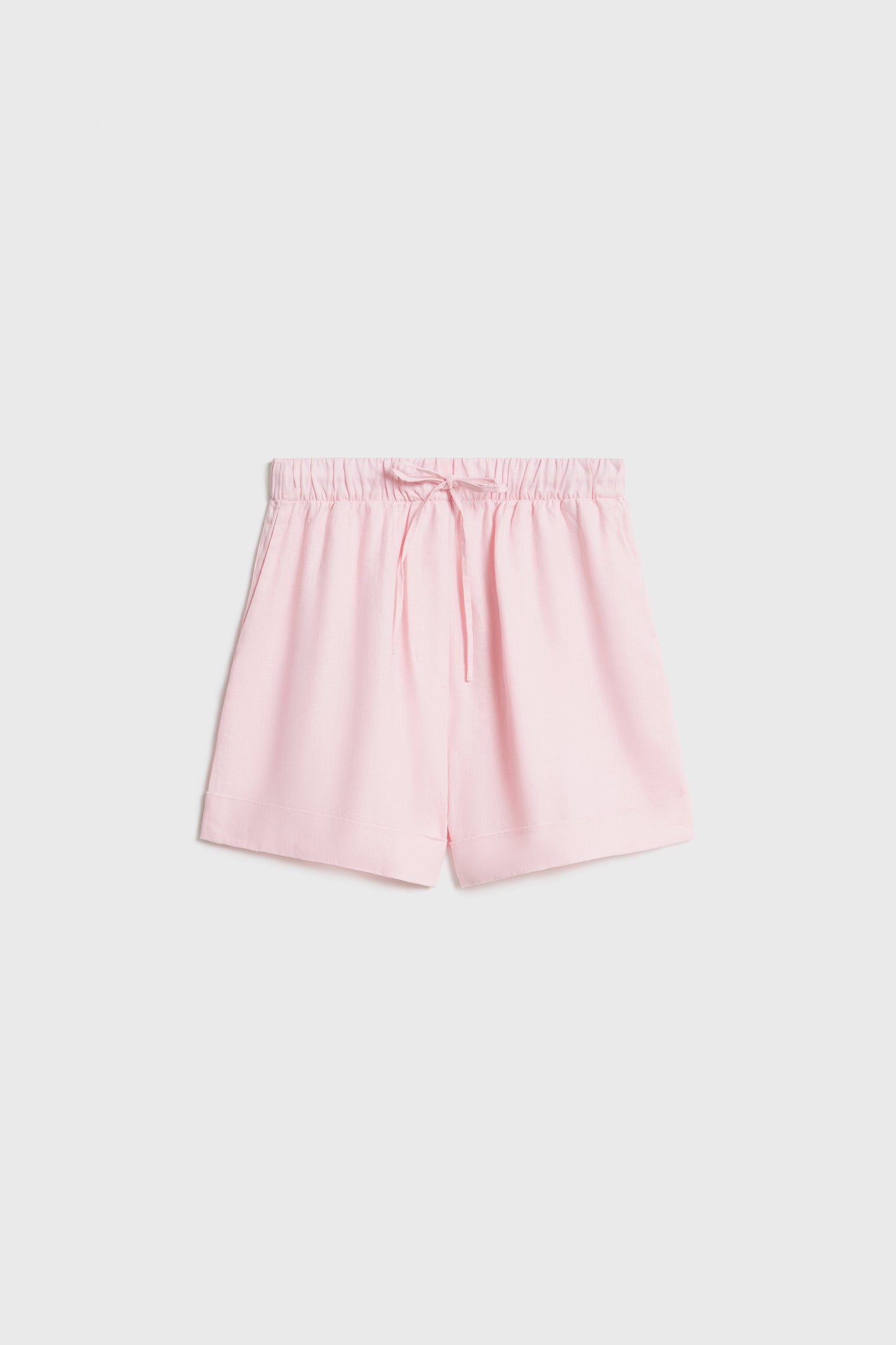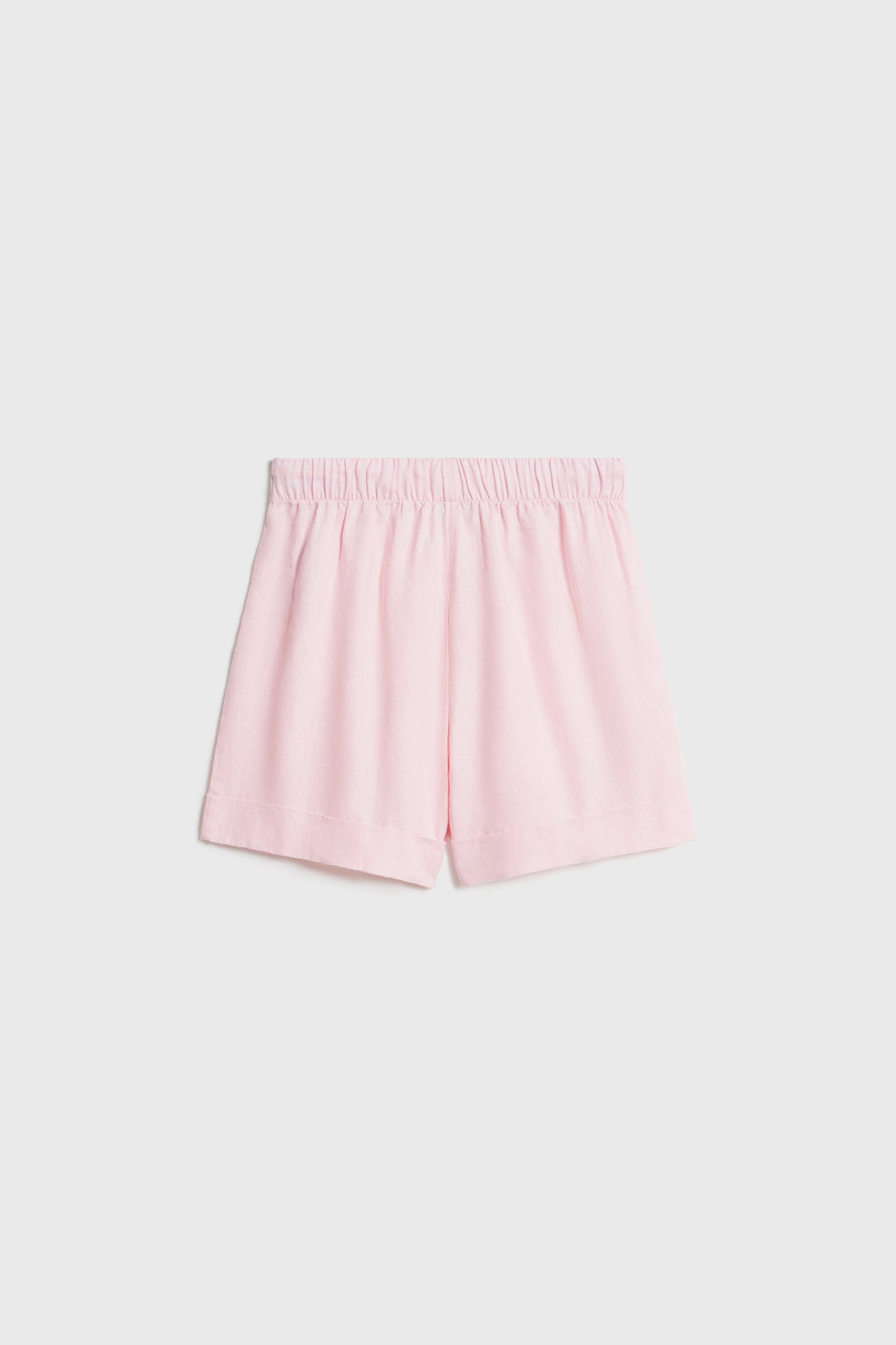 Linen mini shorts featuring an elastic waist with adjustable drawstrings. Side pockets. Turn-up hems.
