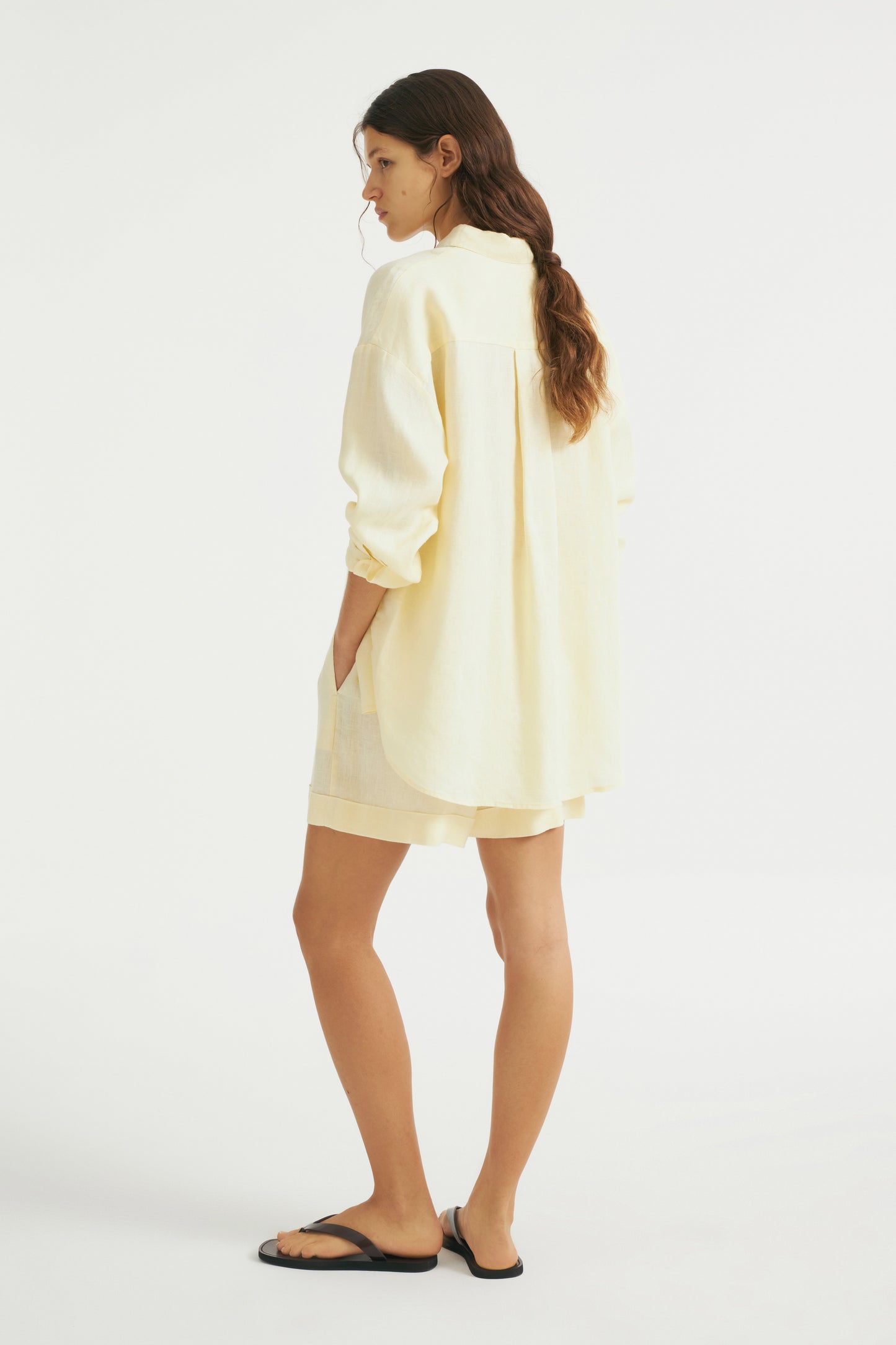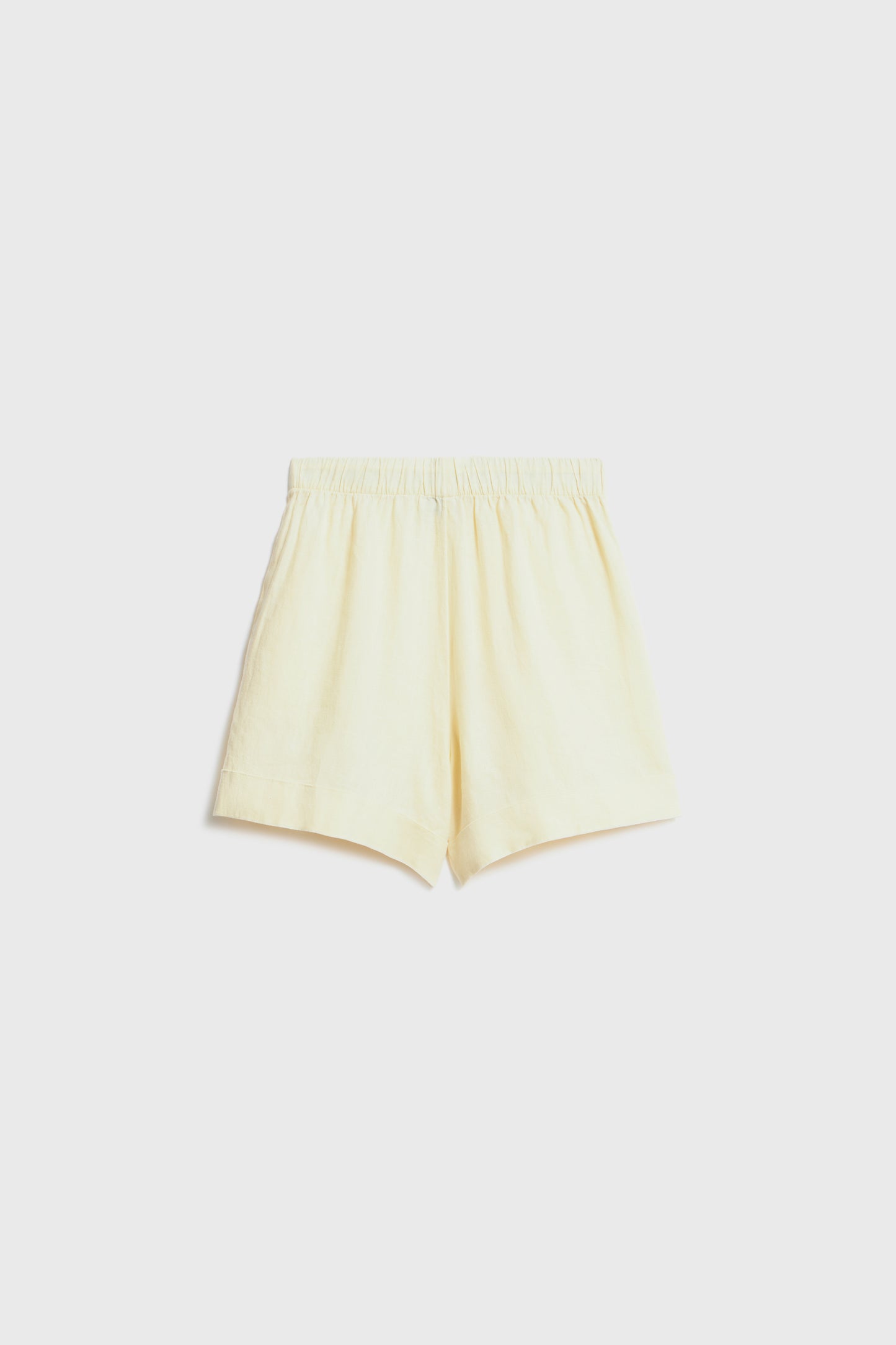 Linen mini shorts featuring an elastic waist with adjustable drawstrings. Side pockets. Turn-up hems.