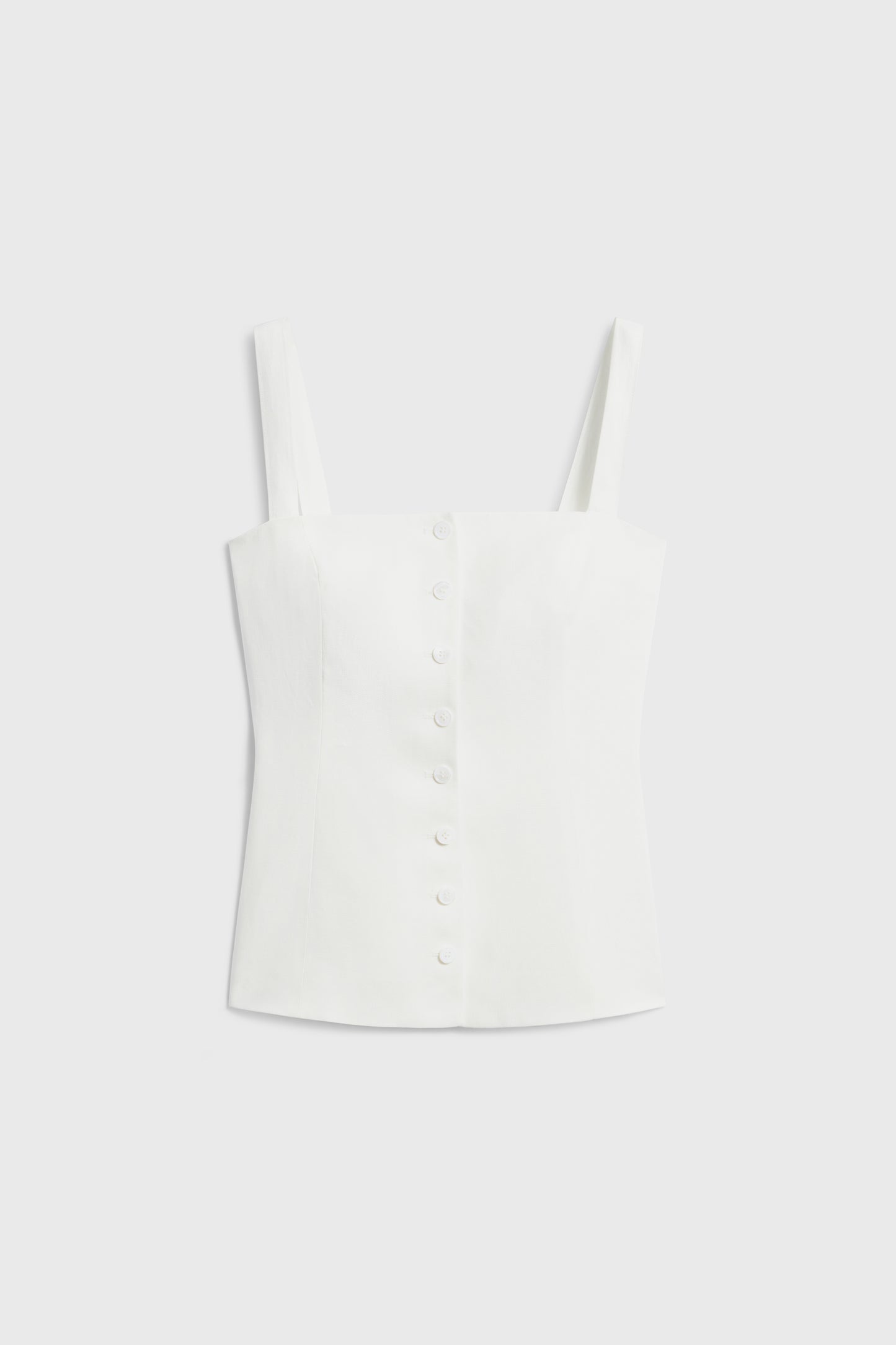 This minimal top inspired by corseted silhouettes. It's crafted from lightweight linen and fits across the chest then subtly flares out to an A-line hem. Lined. Button down front.