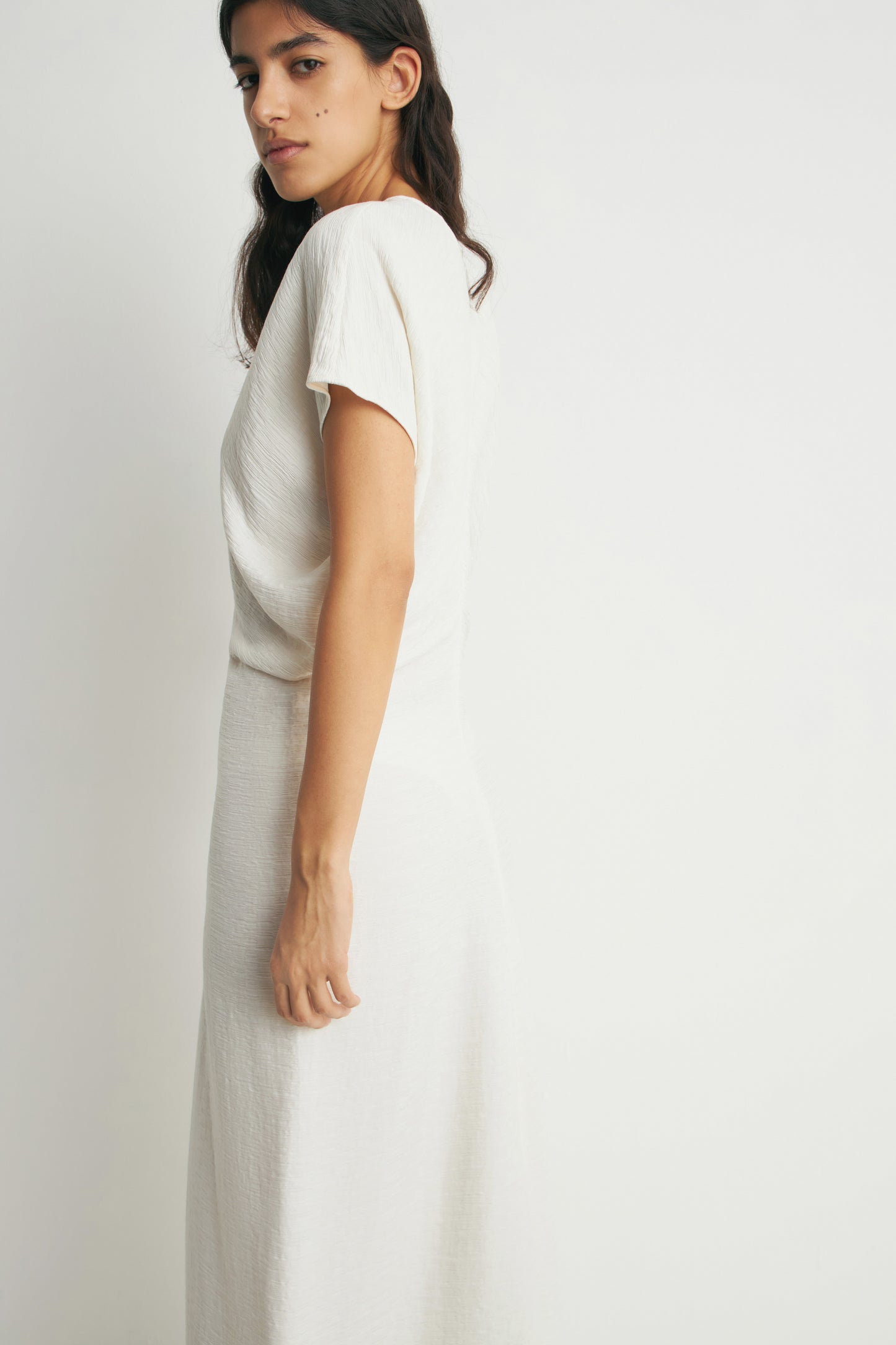 Ankle-length, fitted dress in viscose blend with a round neckline, short sleeves and pleats at side to create a draped effect. Hook and zip concealed at the back.