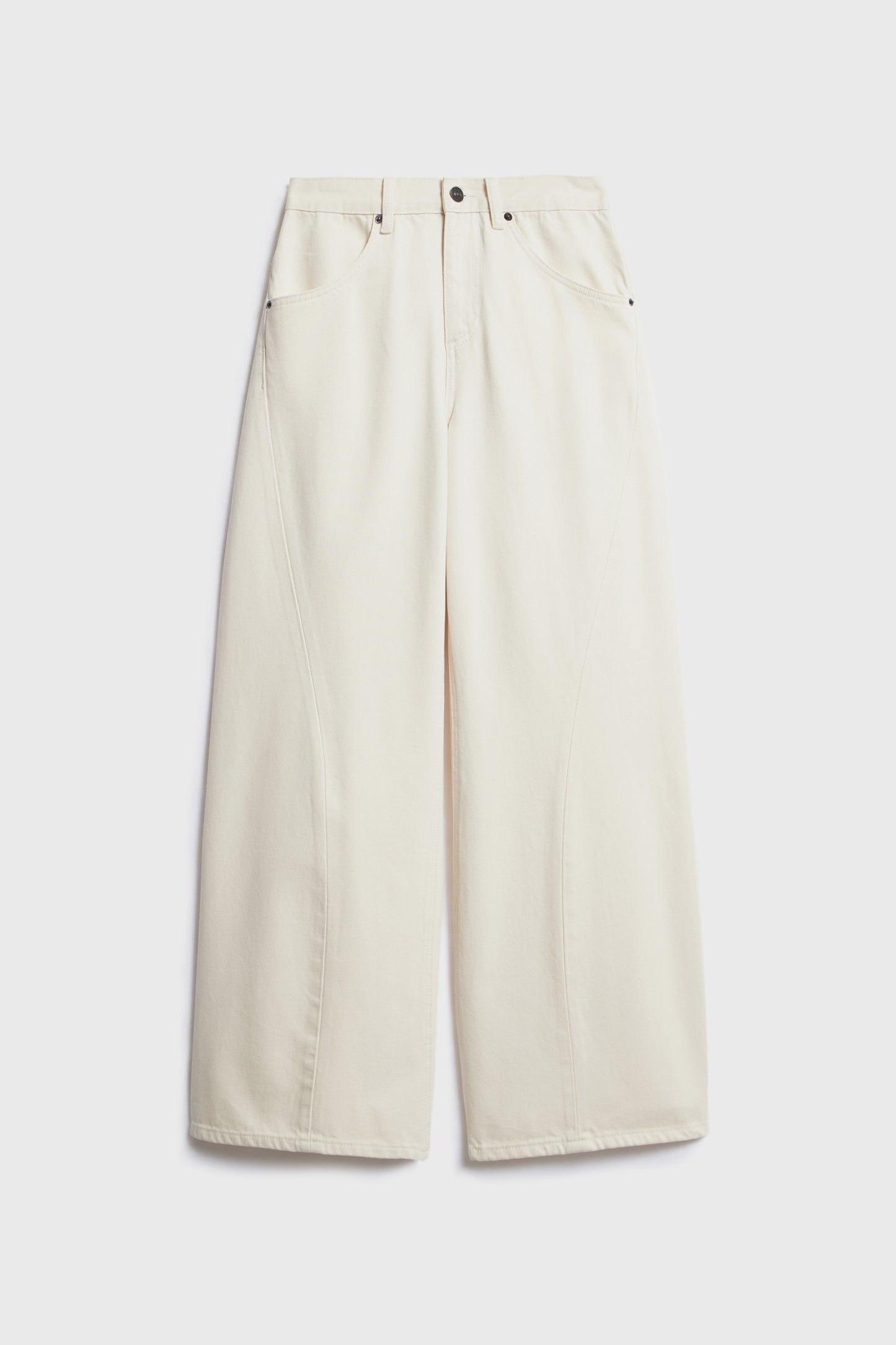 Wide jeans in washed cotton denim with a low waist. Relaxed fit and tapered legs. Styled with diagonal side seams. Front and back pockets. Front zip fly and top button fastening.