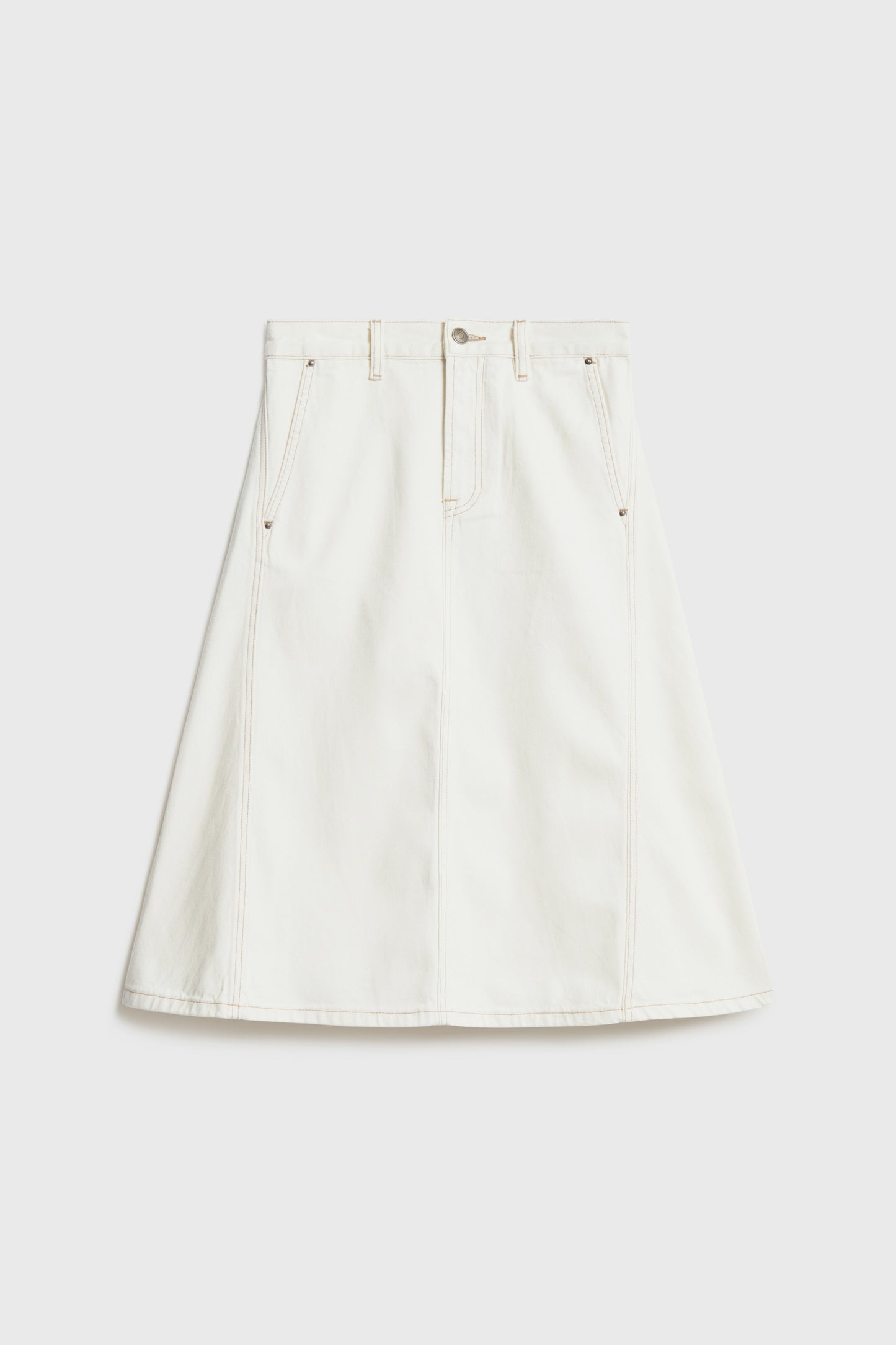 Knee-length skirt in faded denim crafted from a lyocell and cotton blend. Flared hem. Featuring side pockets, back patch pockets. Zip and metal button fastening.