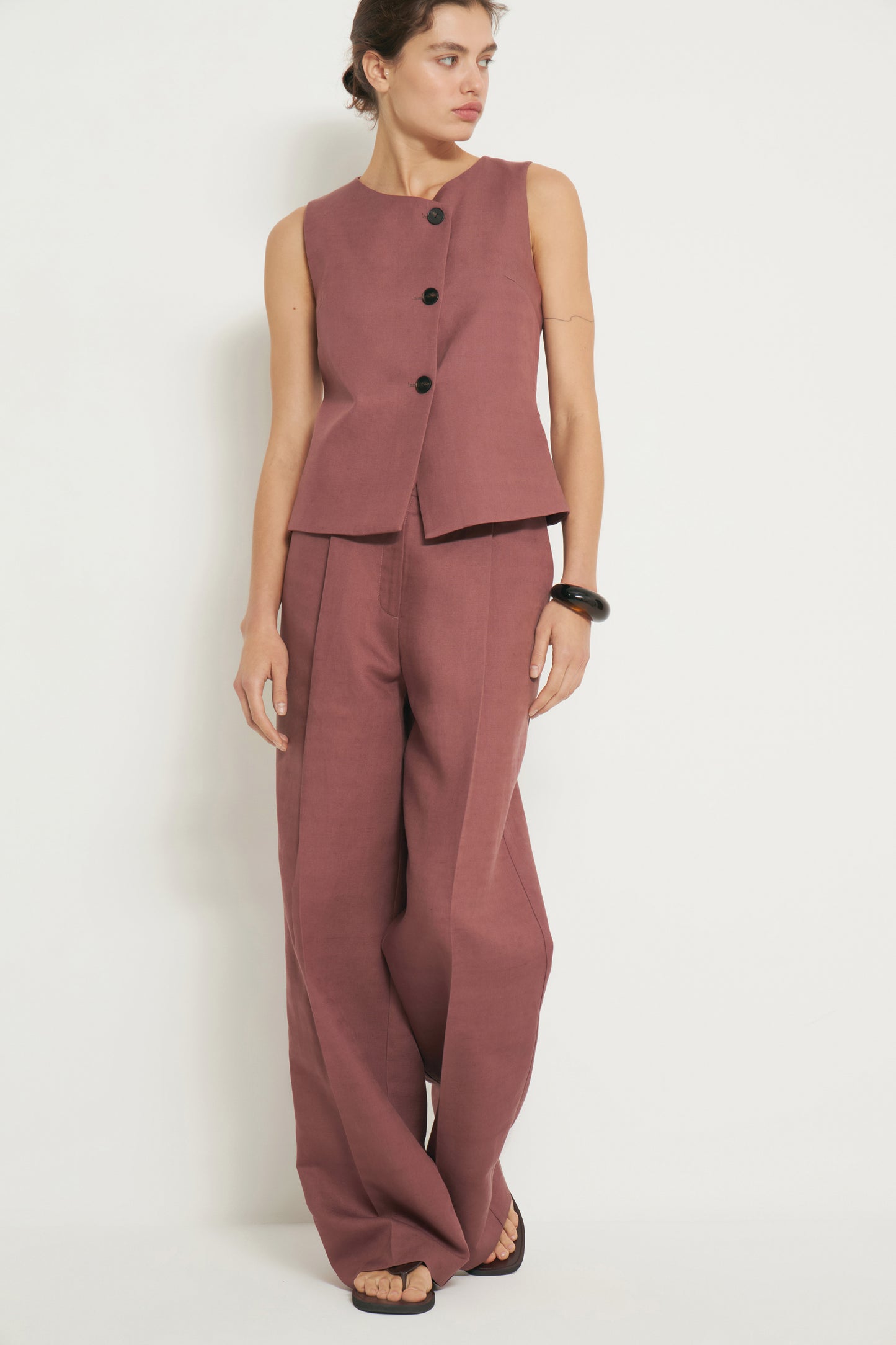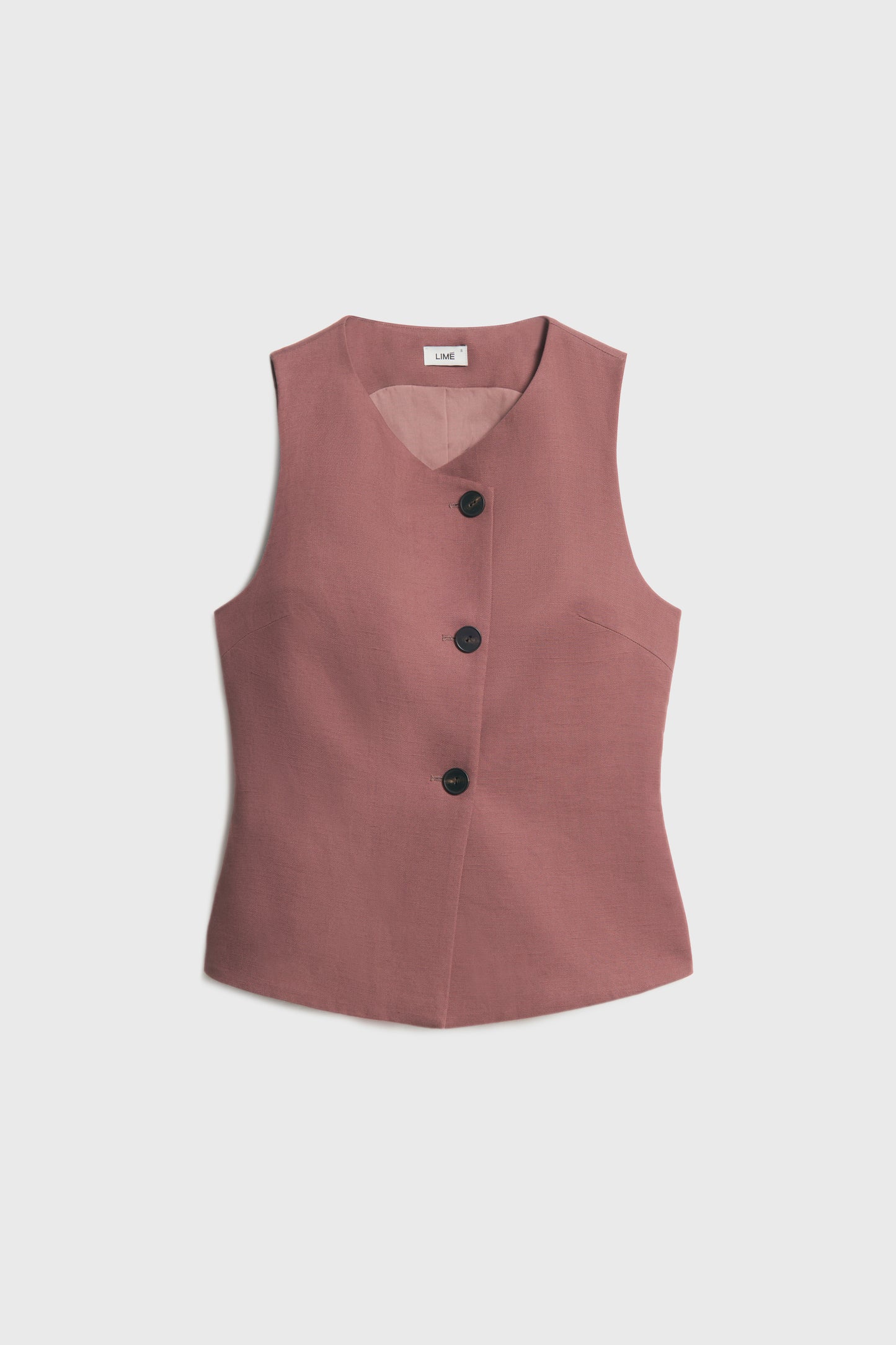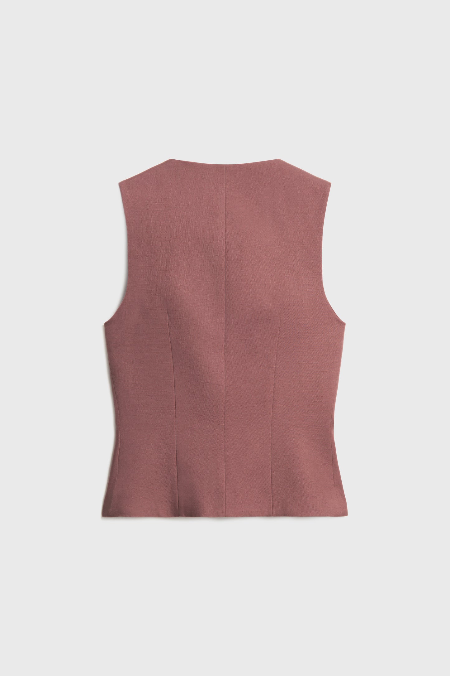 Slightly longer, fitted vest in woven fabric made from a lyocell and linen blend. V-neck, princess seams at front and back for a flattering silhouette. Lined. A double-breasted front with buttons.