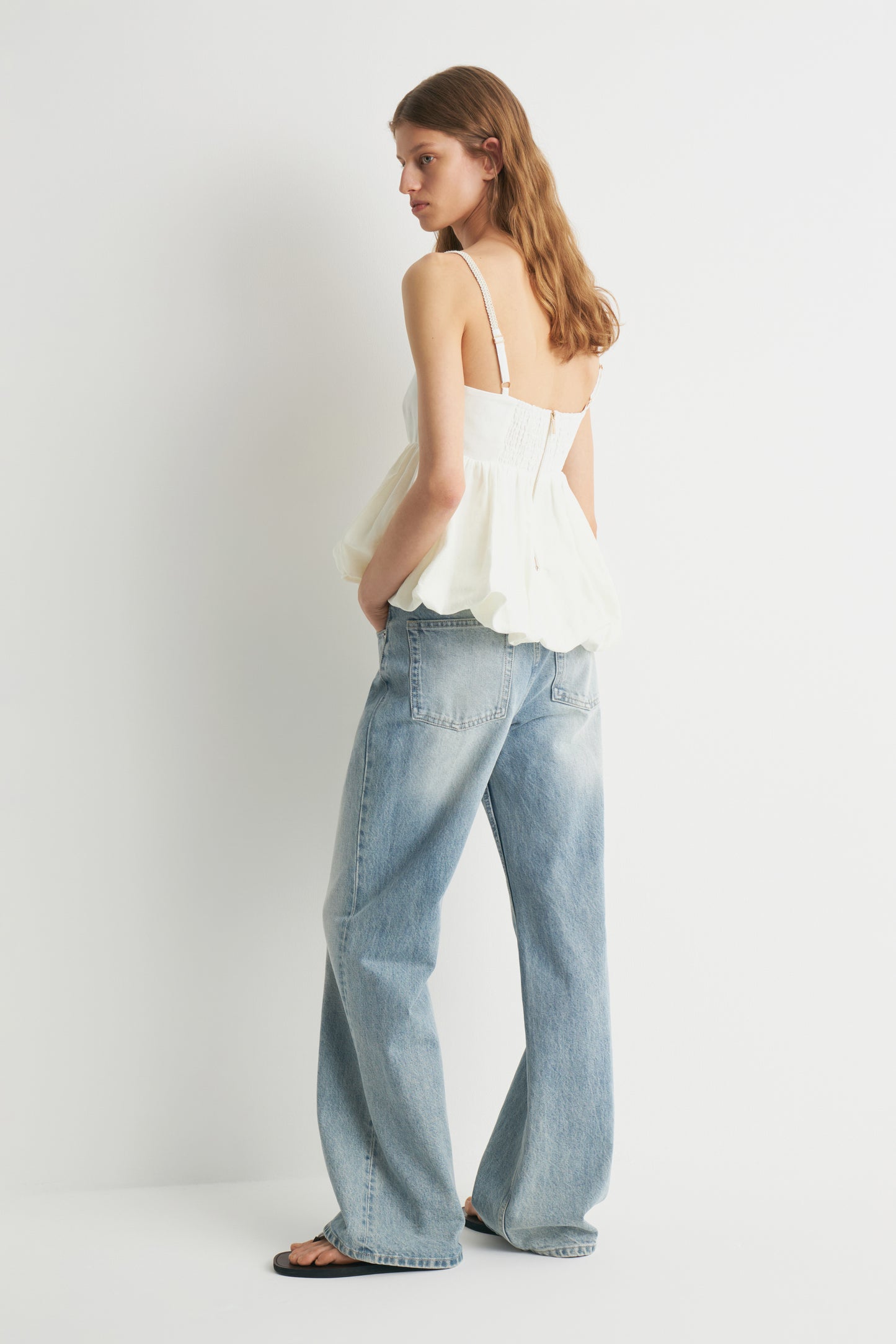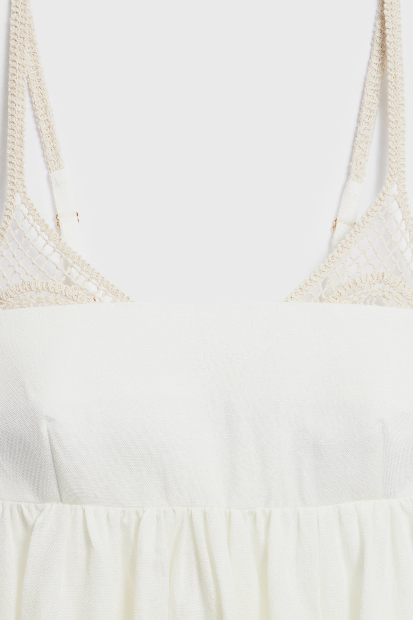 A prelude to the warmer months, this top is crafted from a lightweight lyocell and linen blend that lends itself to balmy weather. this piece with a sweetheart neckline, spaghetti shoulder straps and a smocked section at the back. Crochet-look insert on the bodice and a flared peplum with a bubble hem for a puffy silhouette. Soft cotton blend lining.