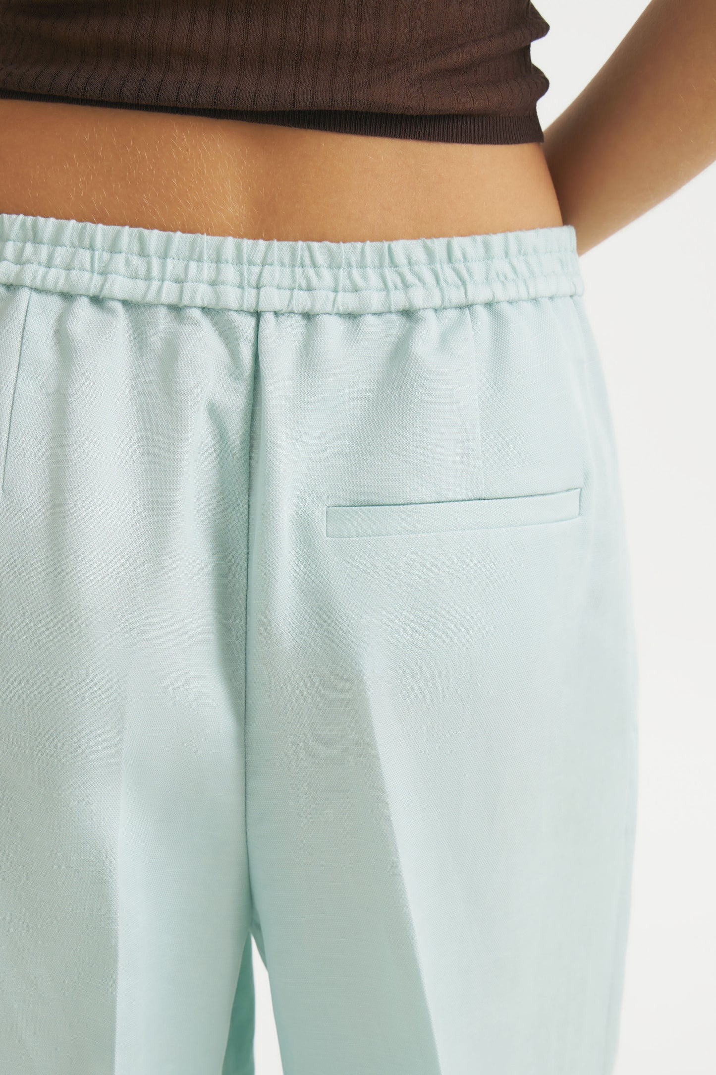Pleated trousers in organic natural weave: lyocell and linen blend. Featuring front pockets, back fake pocket and elasticated waistband. Straight-leg design. Front zip fly, button and metal hook fastening.