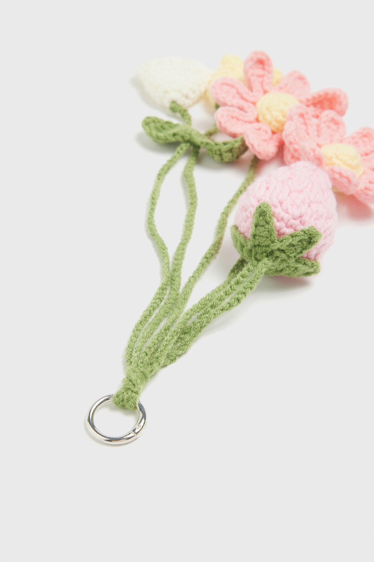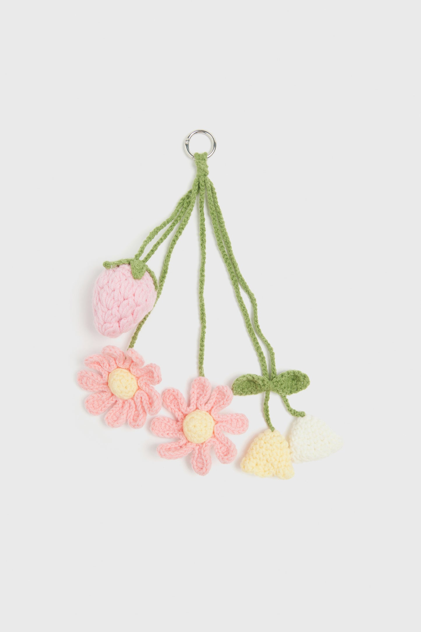 Keyring with a metal carabiner hook and macramé-look pendants in various designs.