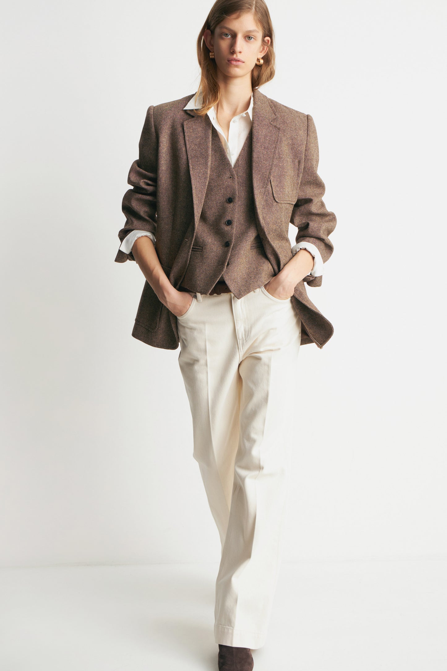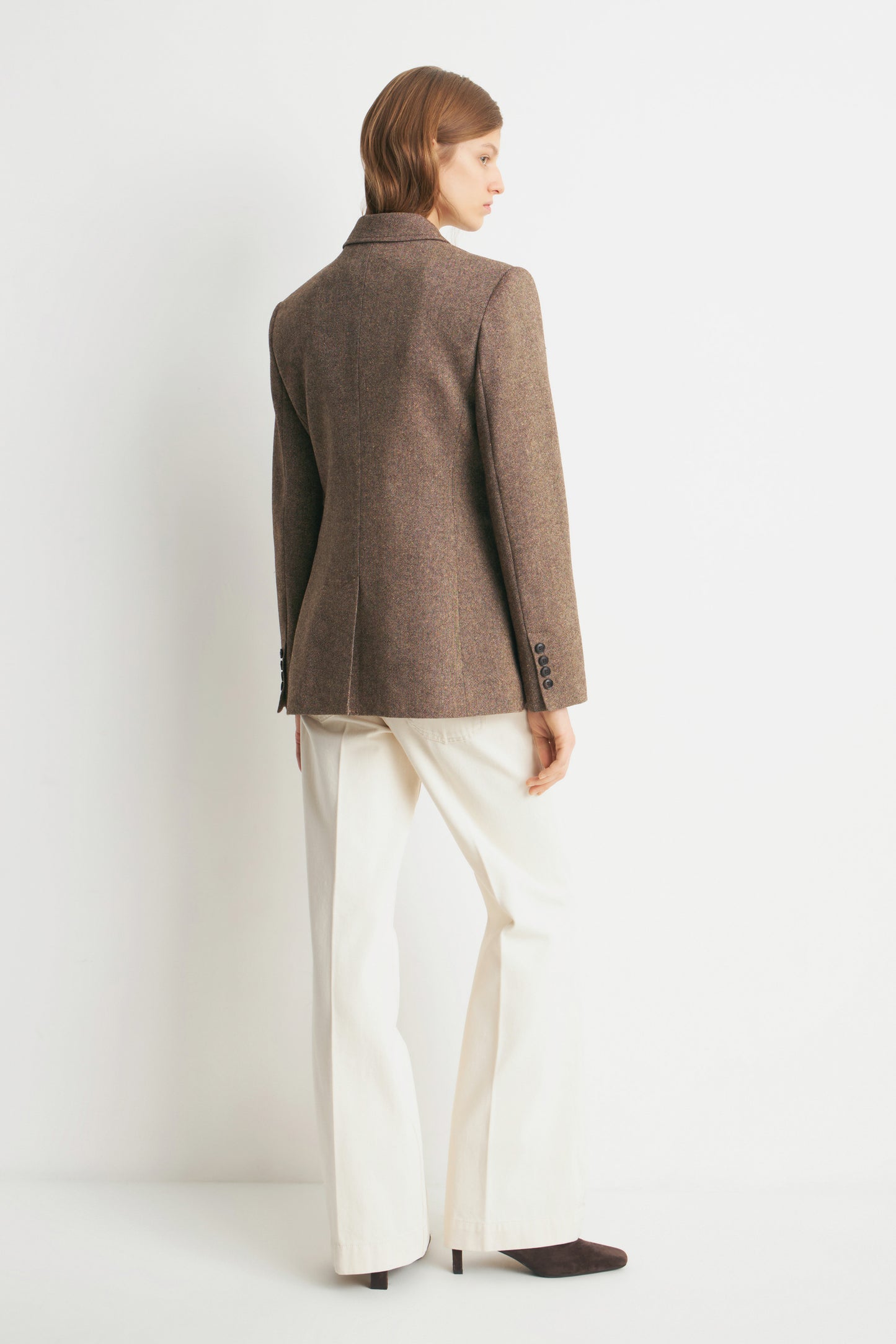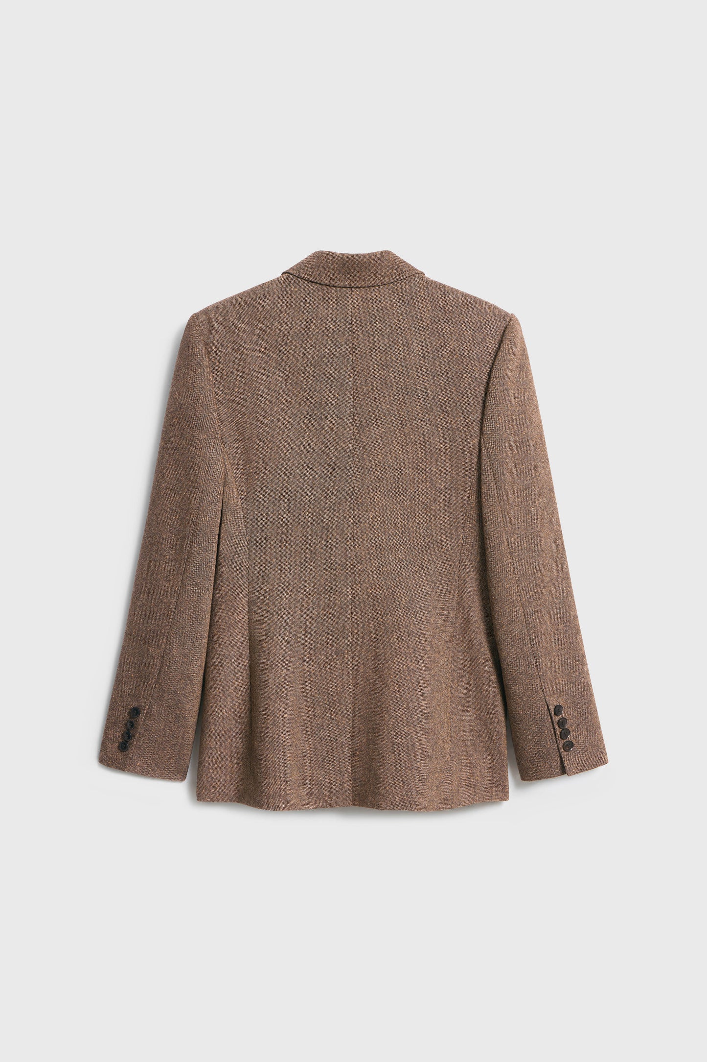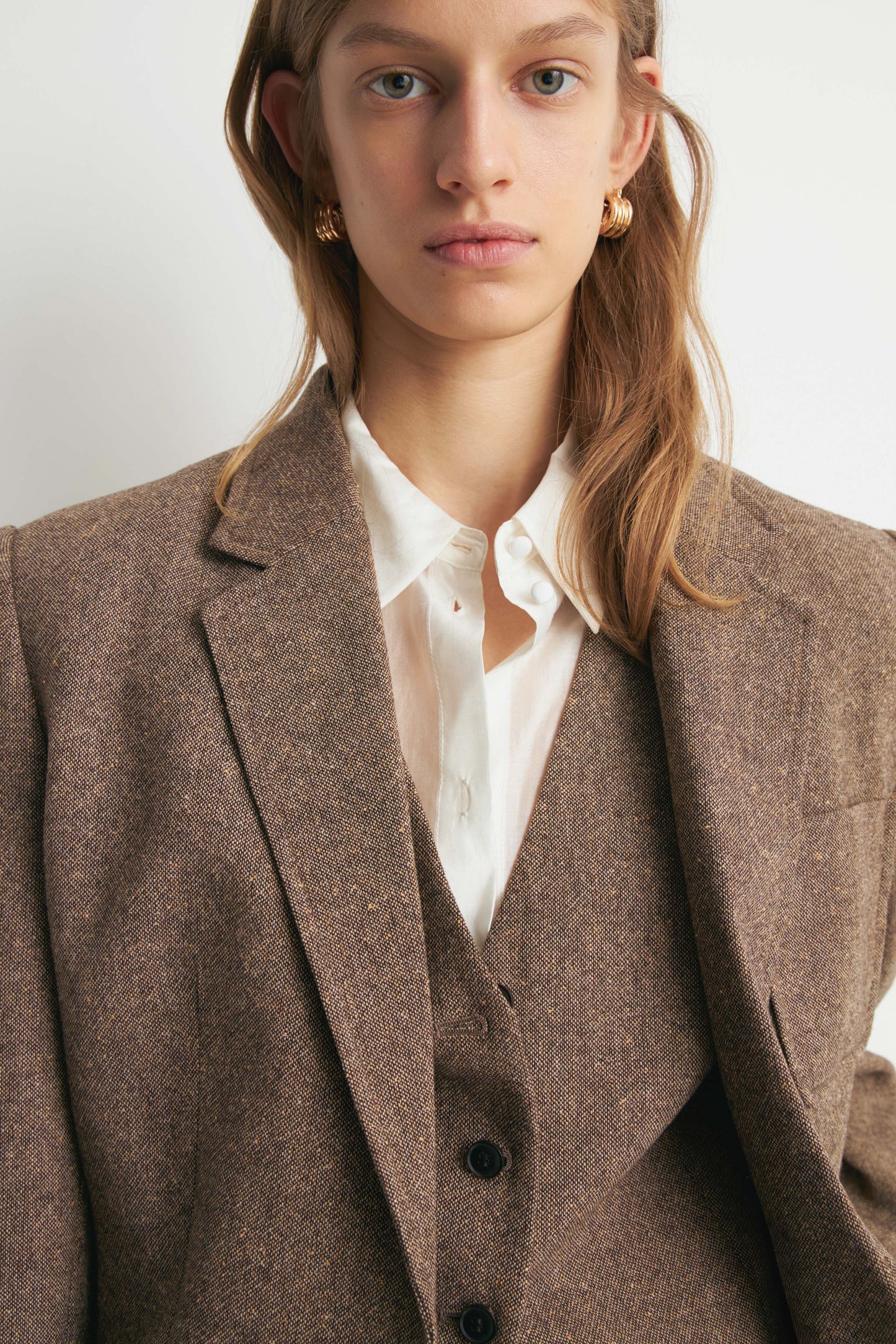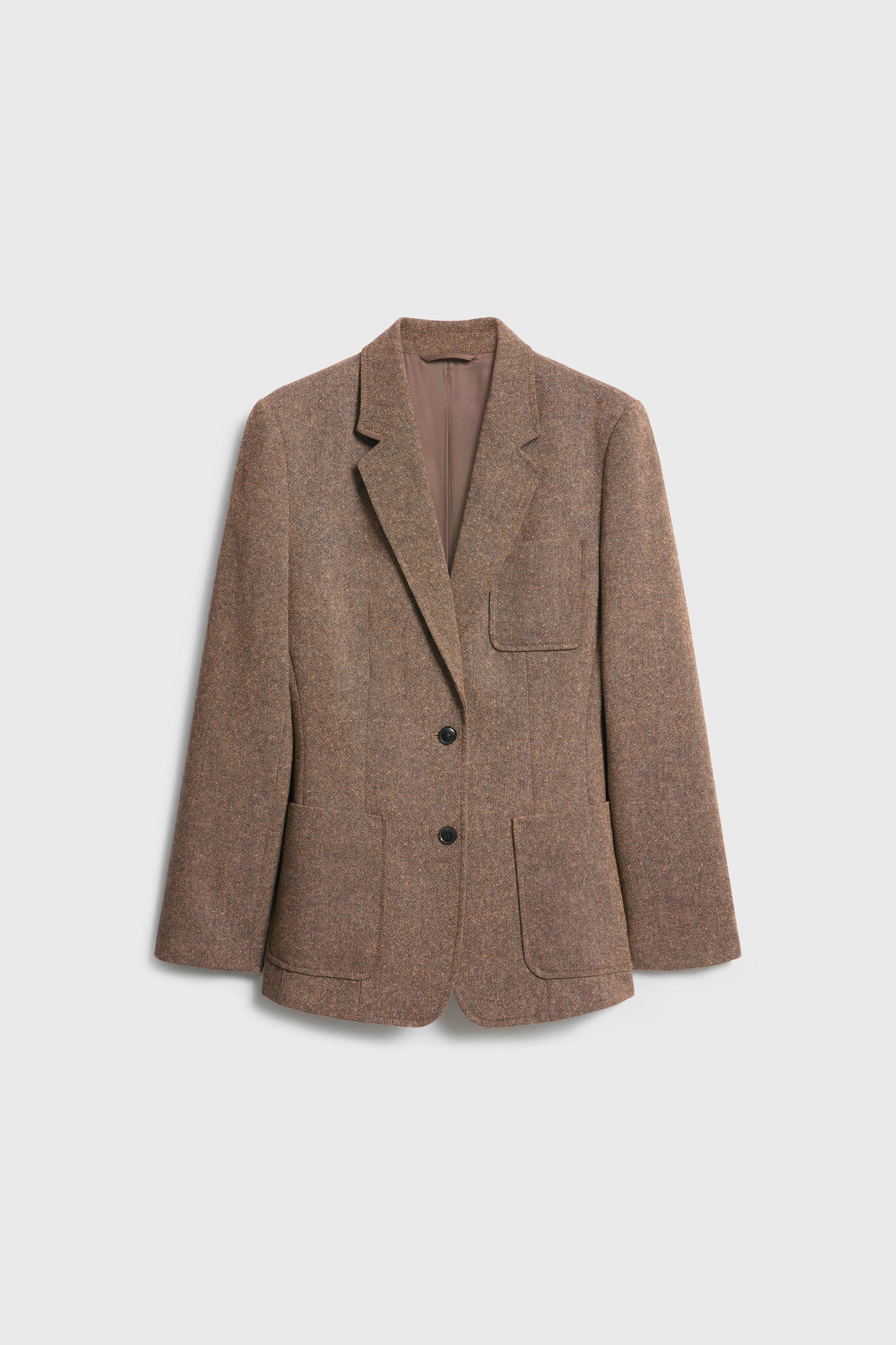 Mélange wool blend blazer featuring notched lapel collar and long sleeves with buttoned cuffs, shoulder pads. Patch front pockets. Matching lining. Single-breasted front with buttons. A tailored, fitted silhouette.