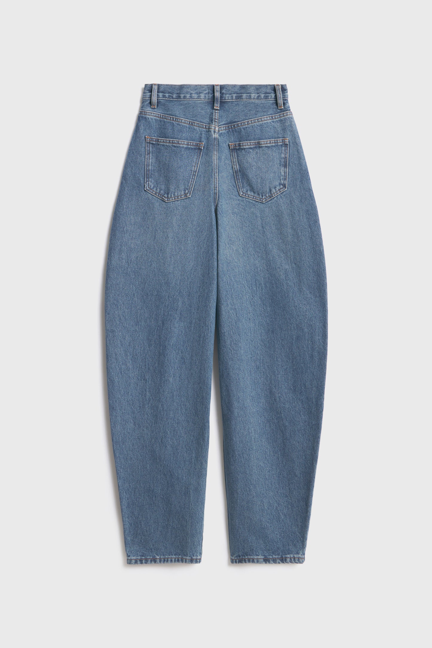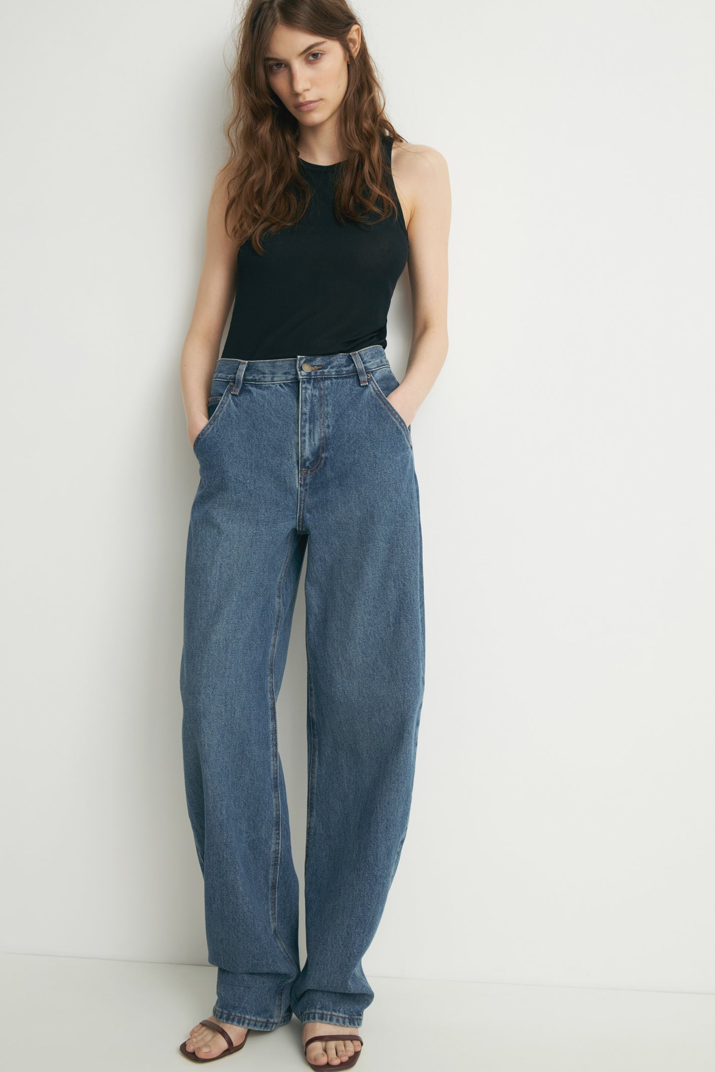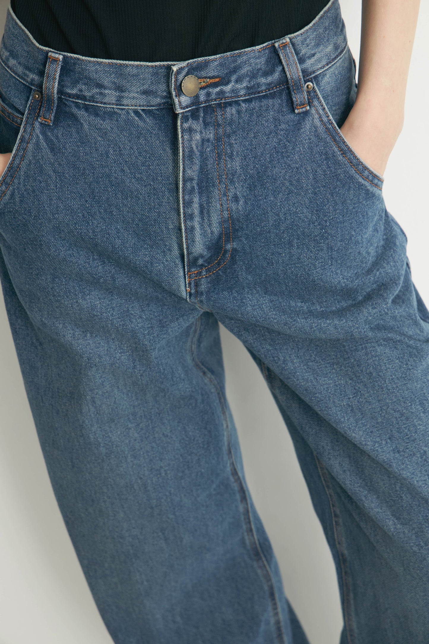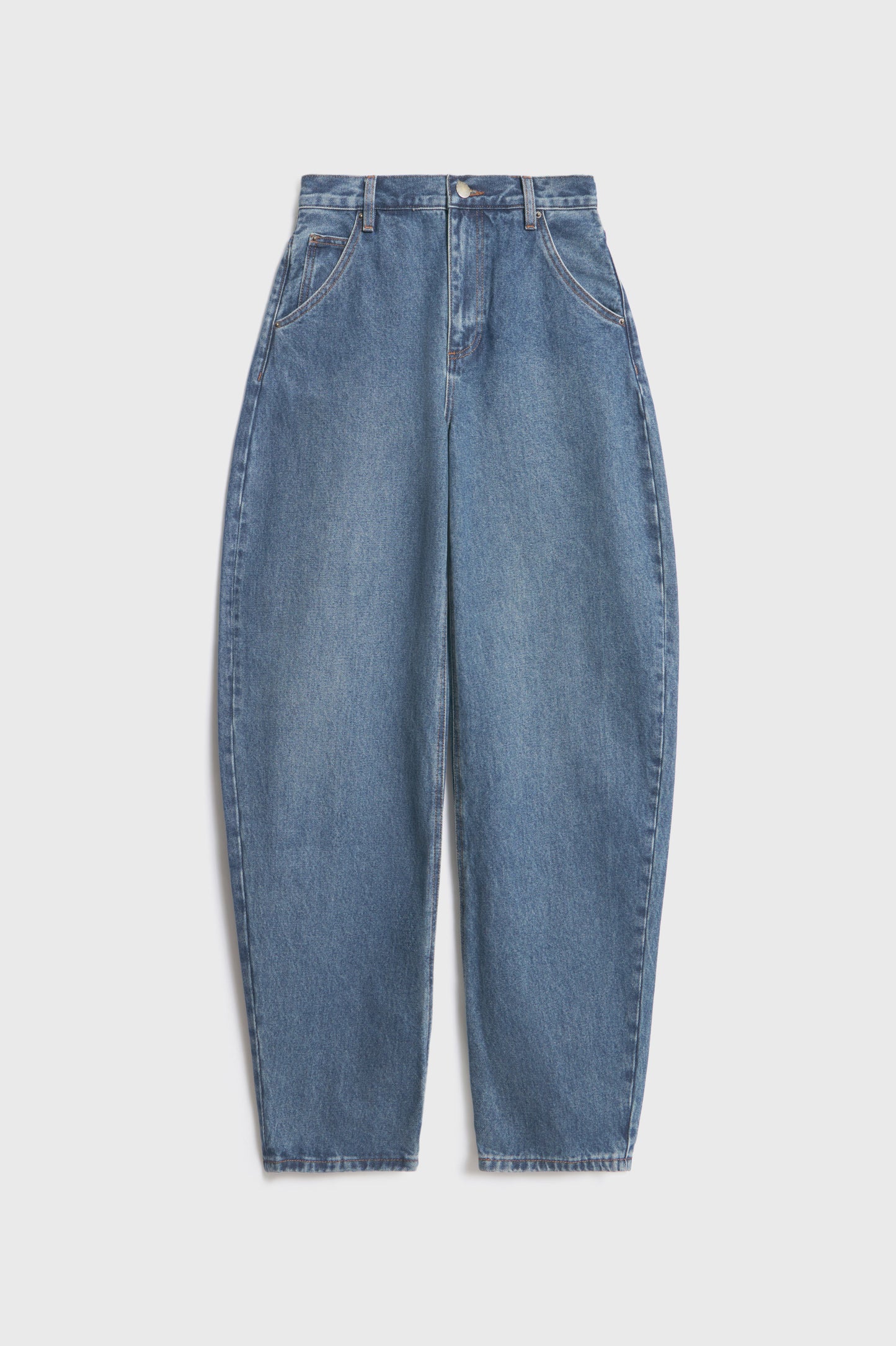 5-pocket jeans in rigid cotton denim. Curved, voluminous legs with a loose fit from the hip to the thigh, that tapers to the hem. Mid waist with a zip fly and button.