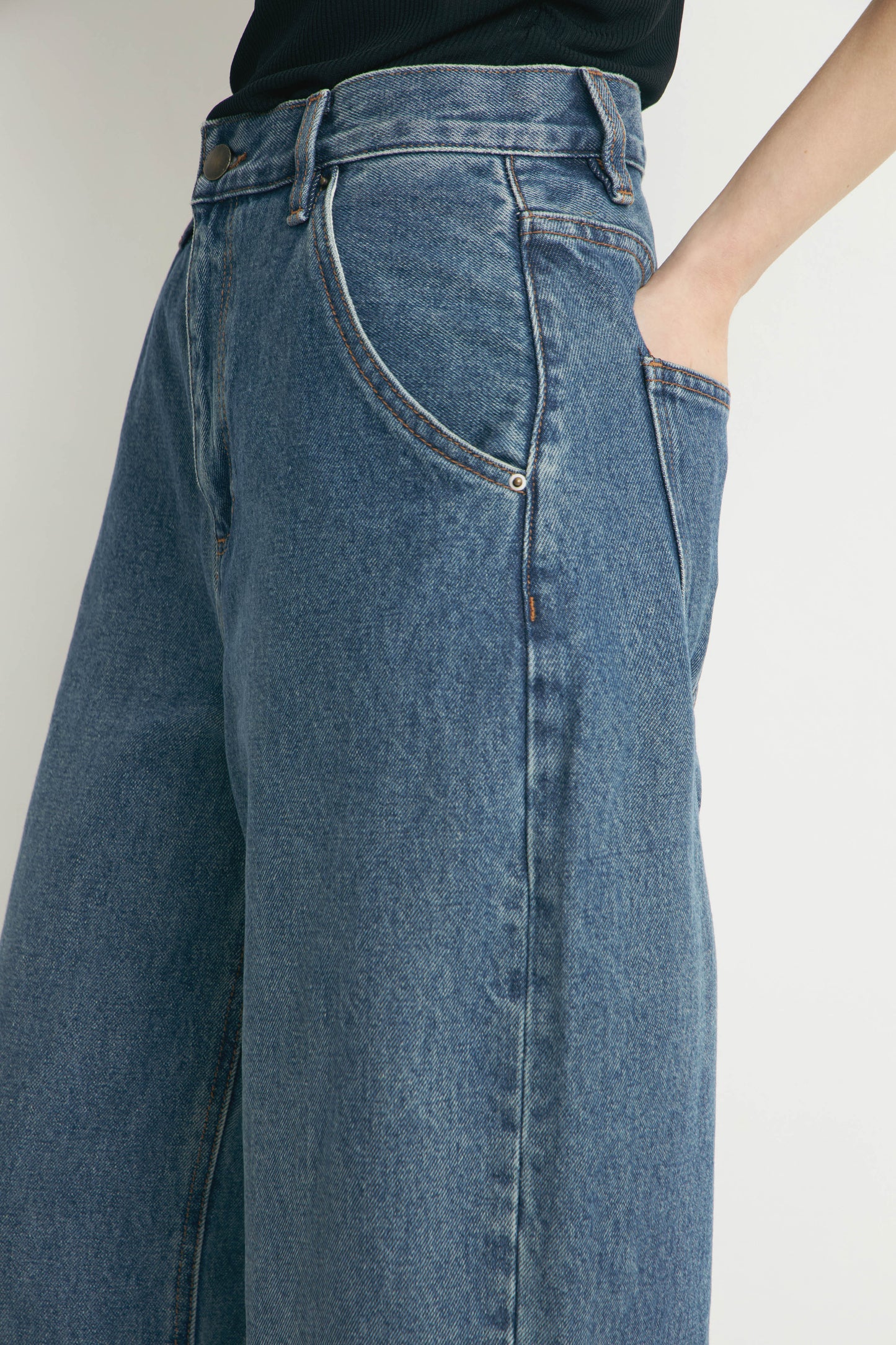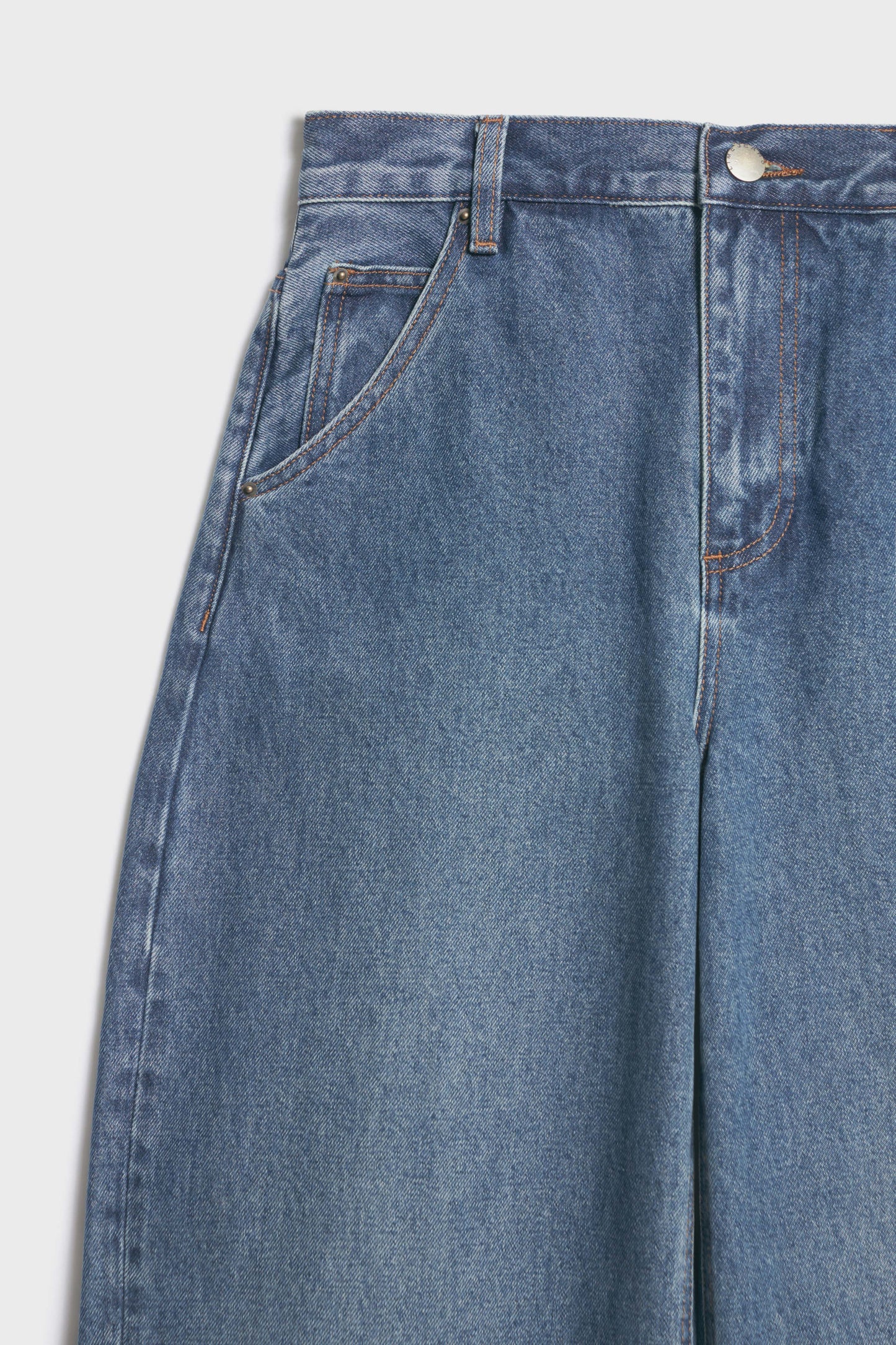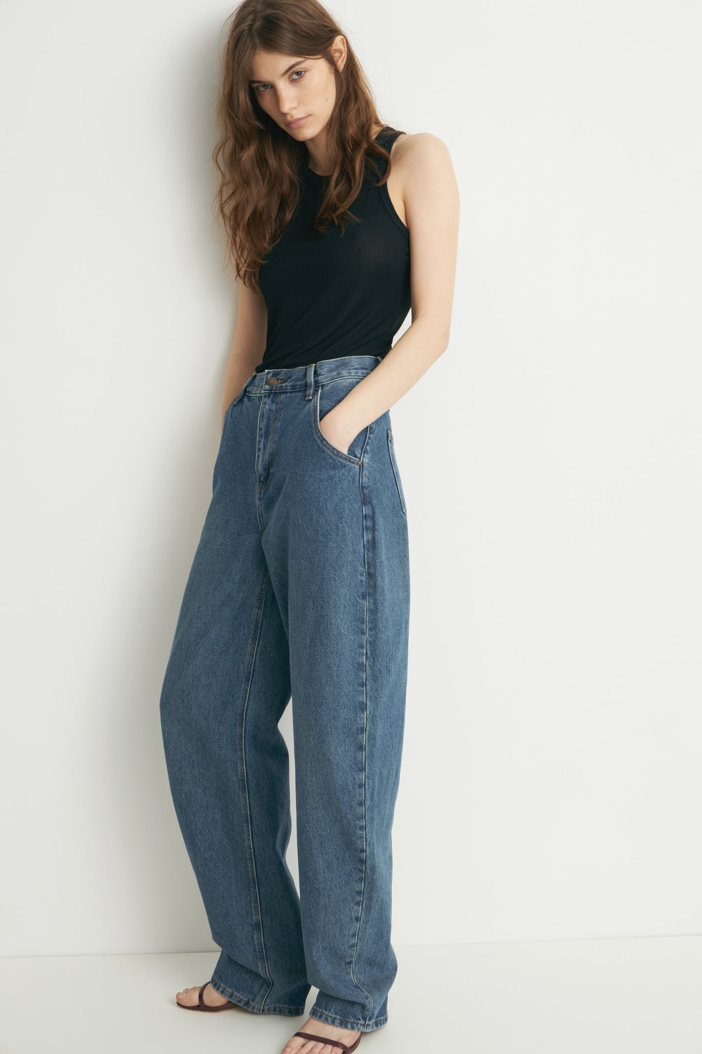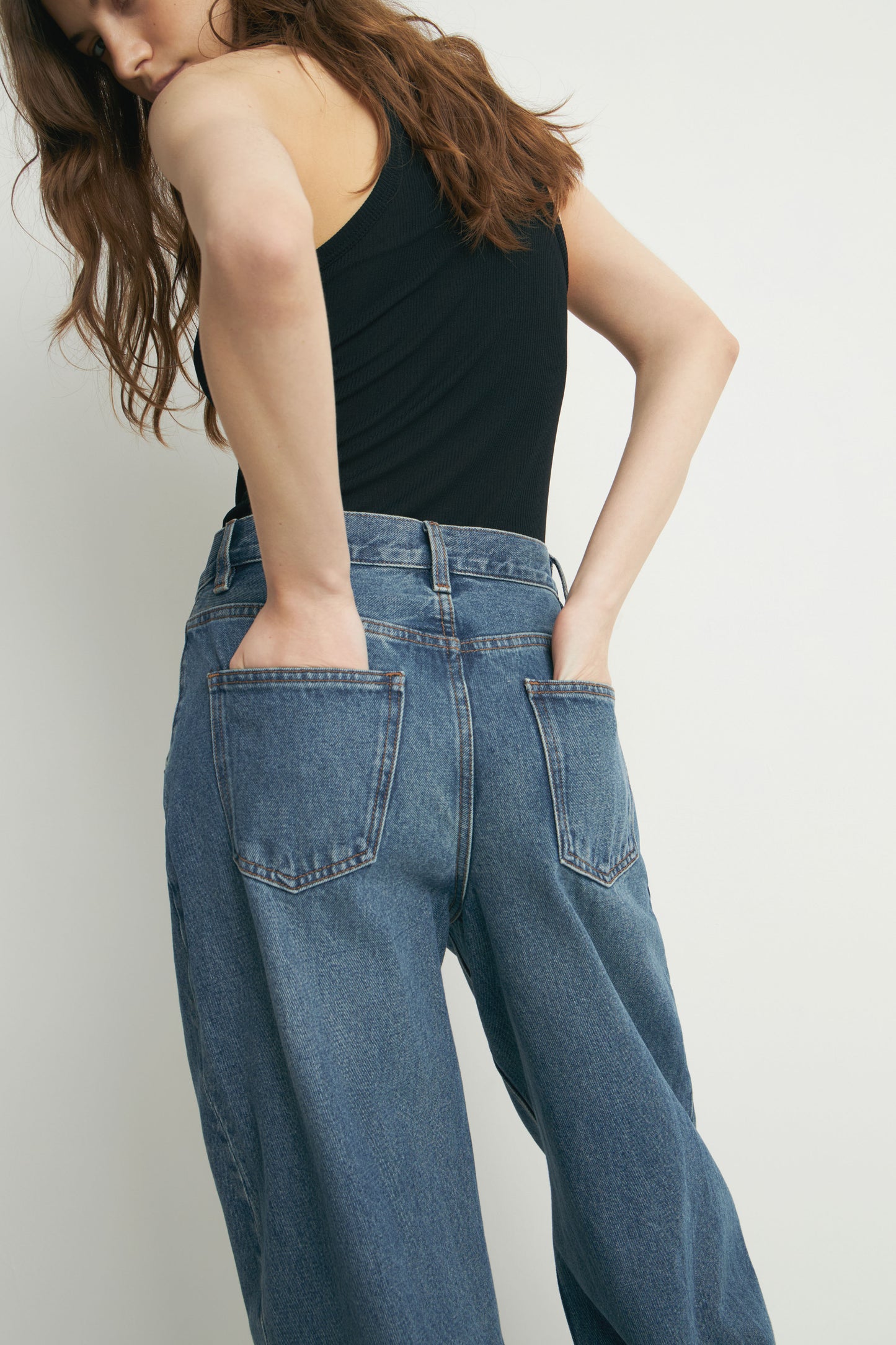 5-pocket jeans in rigid cotton denim. Curved, voluminous legs with a loose fit from the hip to the thigh, that tapers to the hem. Mid waist with a zip fly and button.