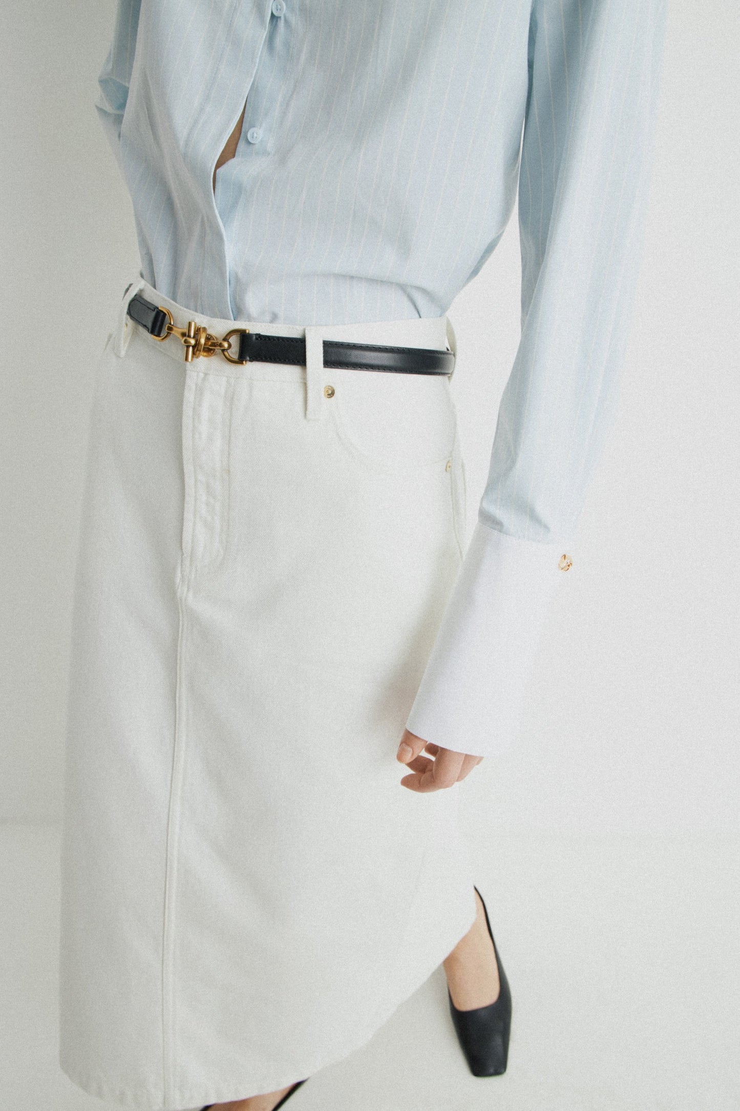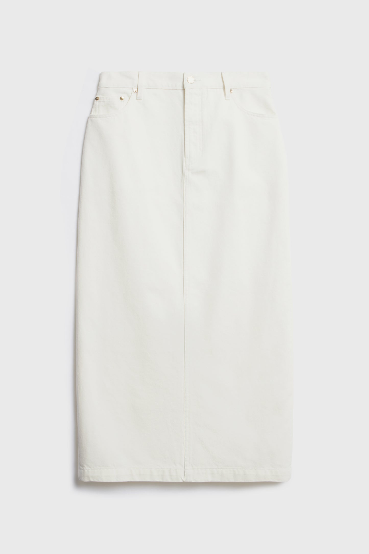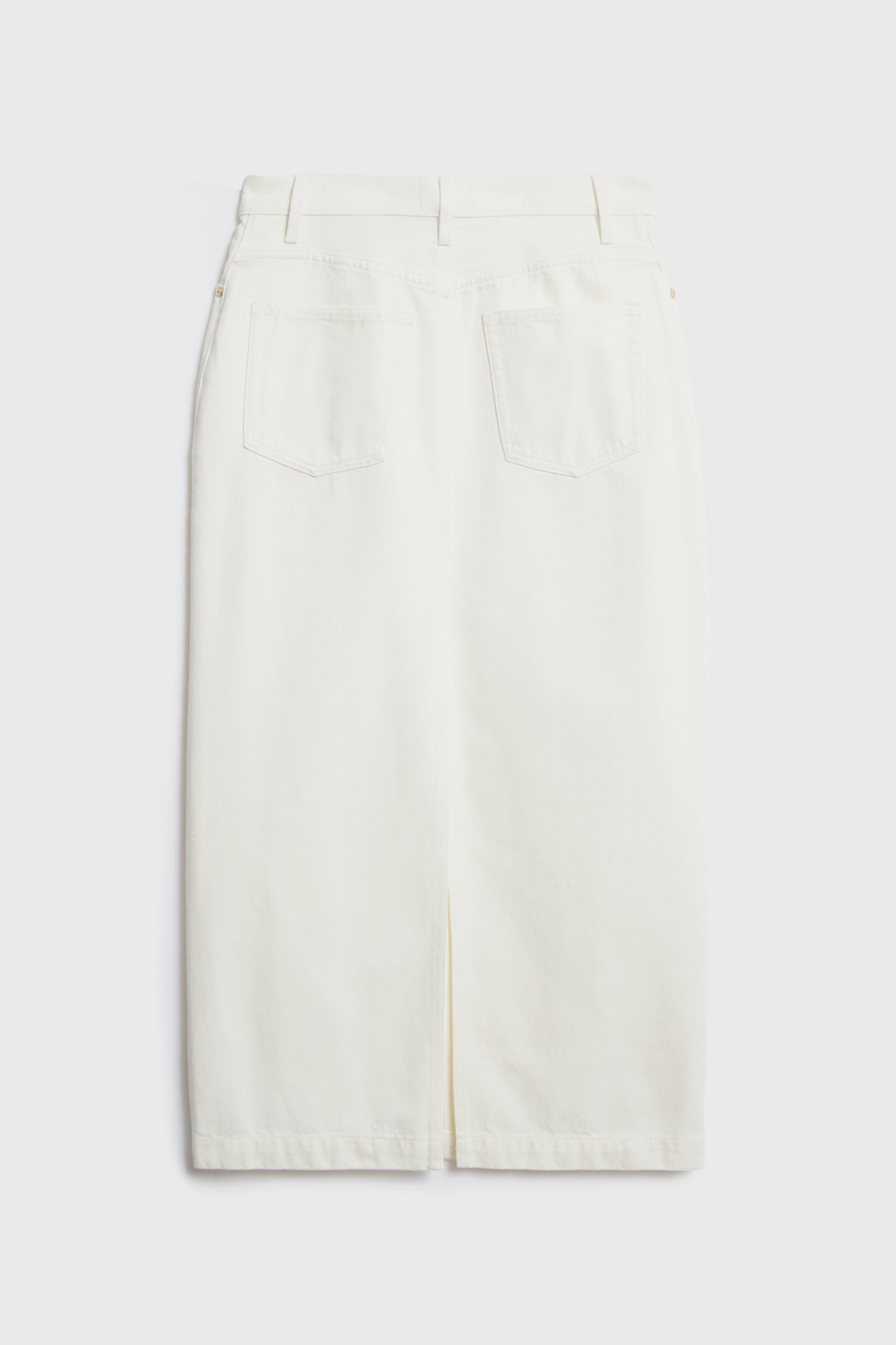 Mid-waist denim skirt with a five-pocket design. Front zip fly and metal button fastening.