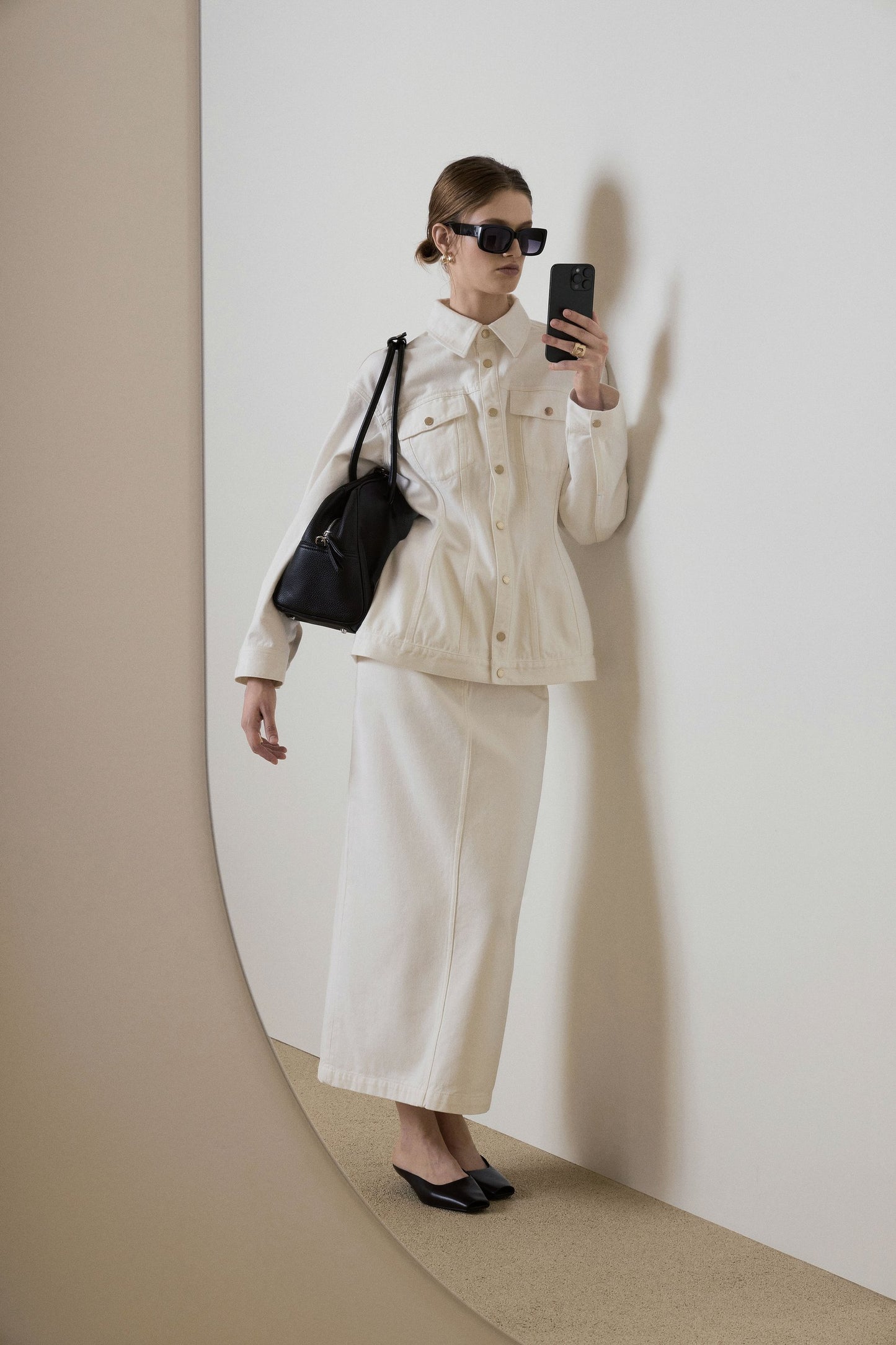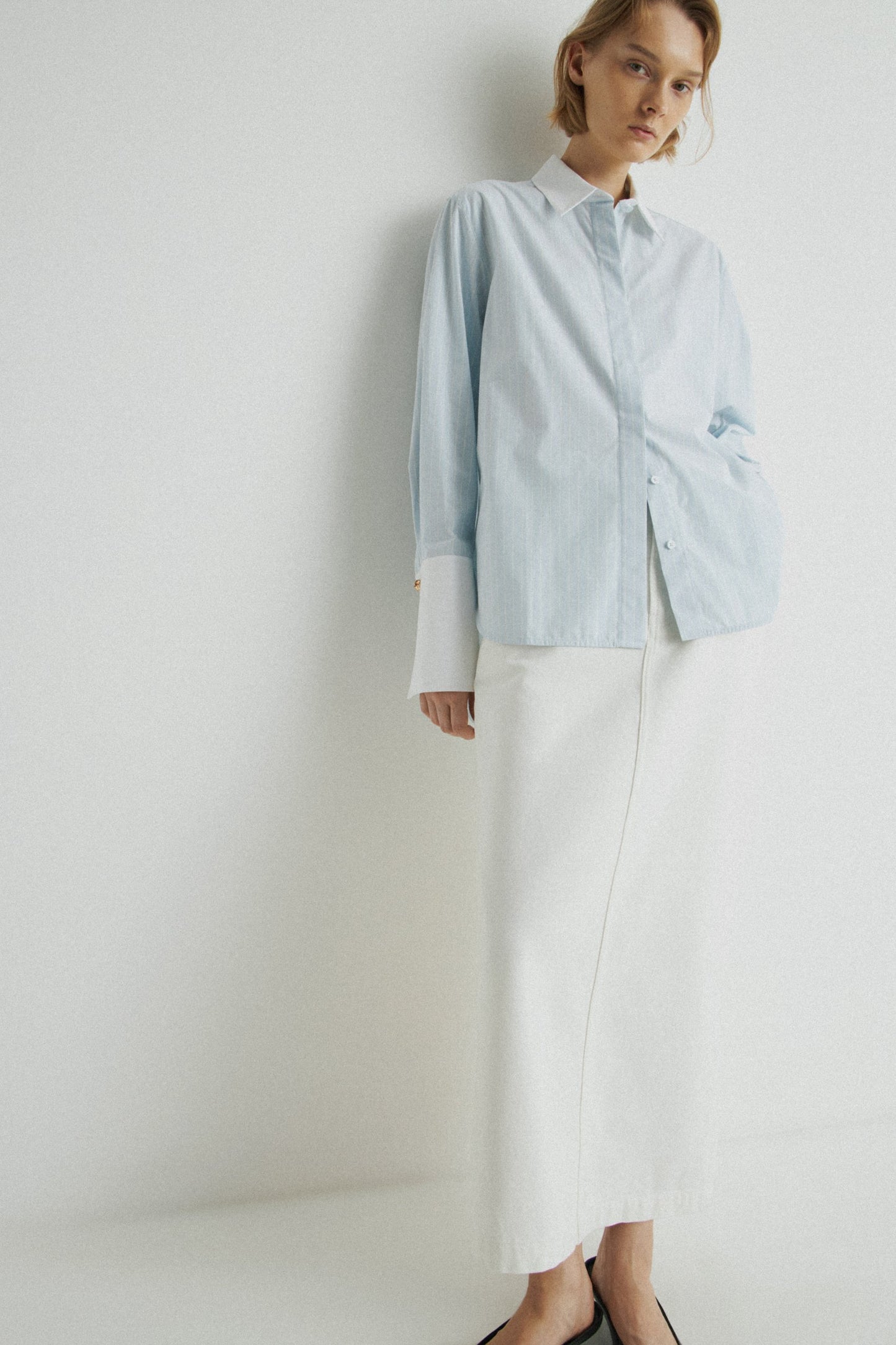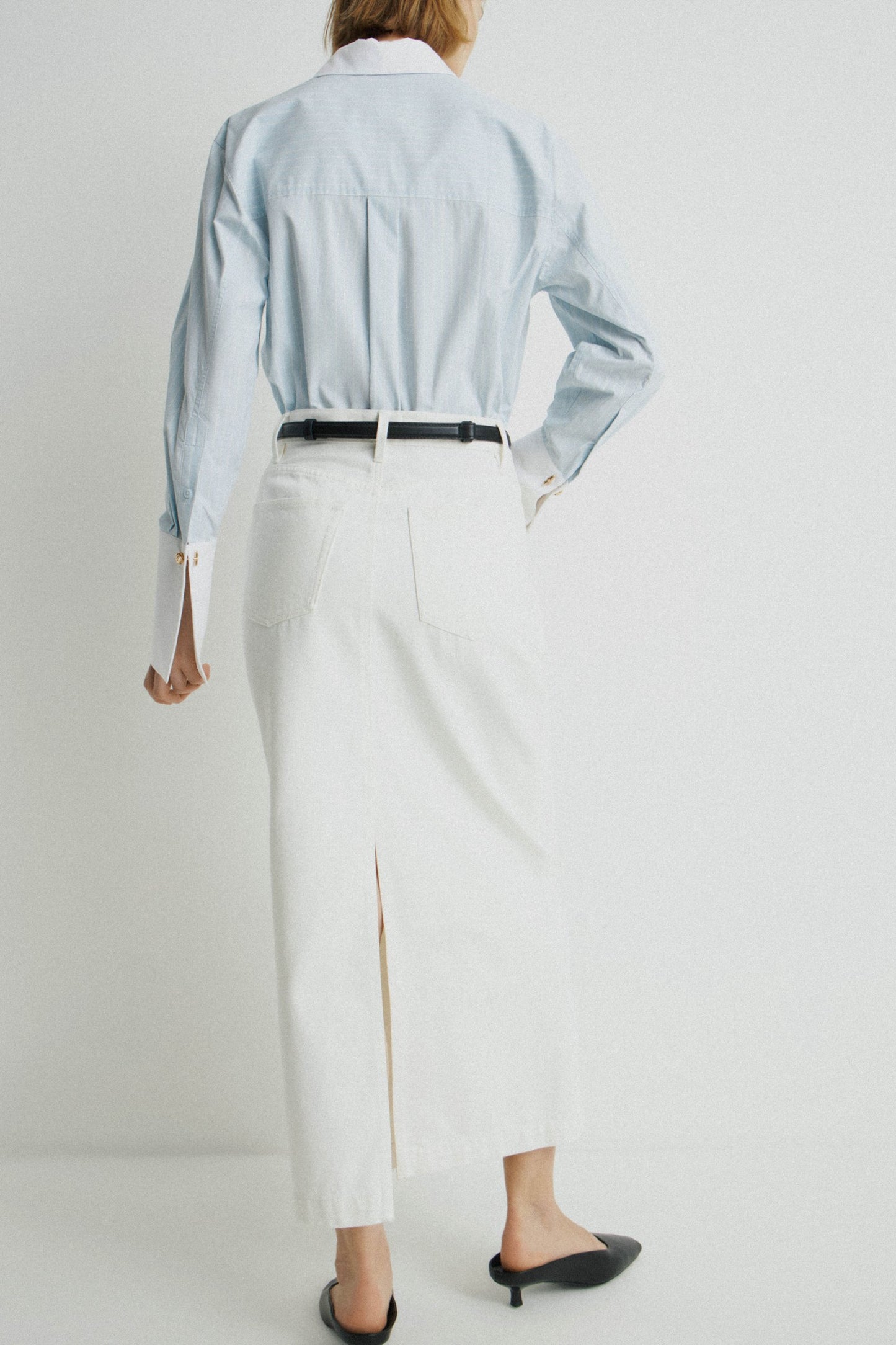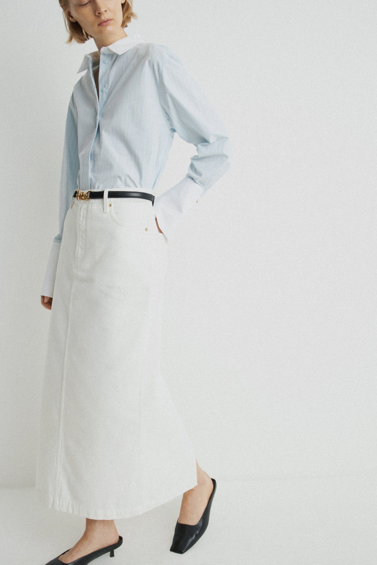 Mid-waist denim skirt with a five-pocket design. Front zip fly and metal button fastening.
