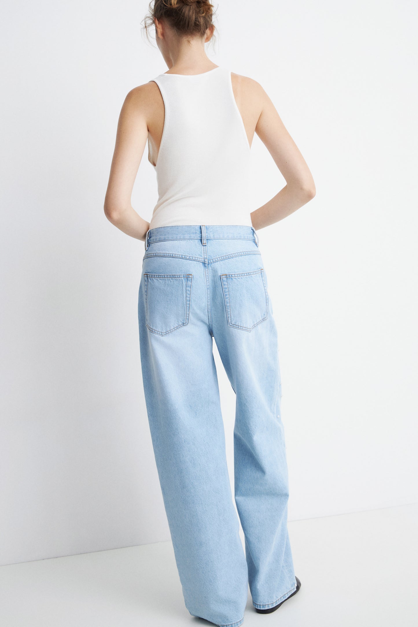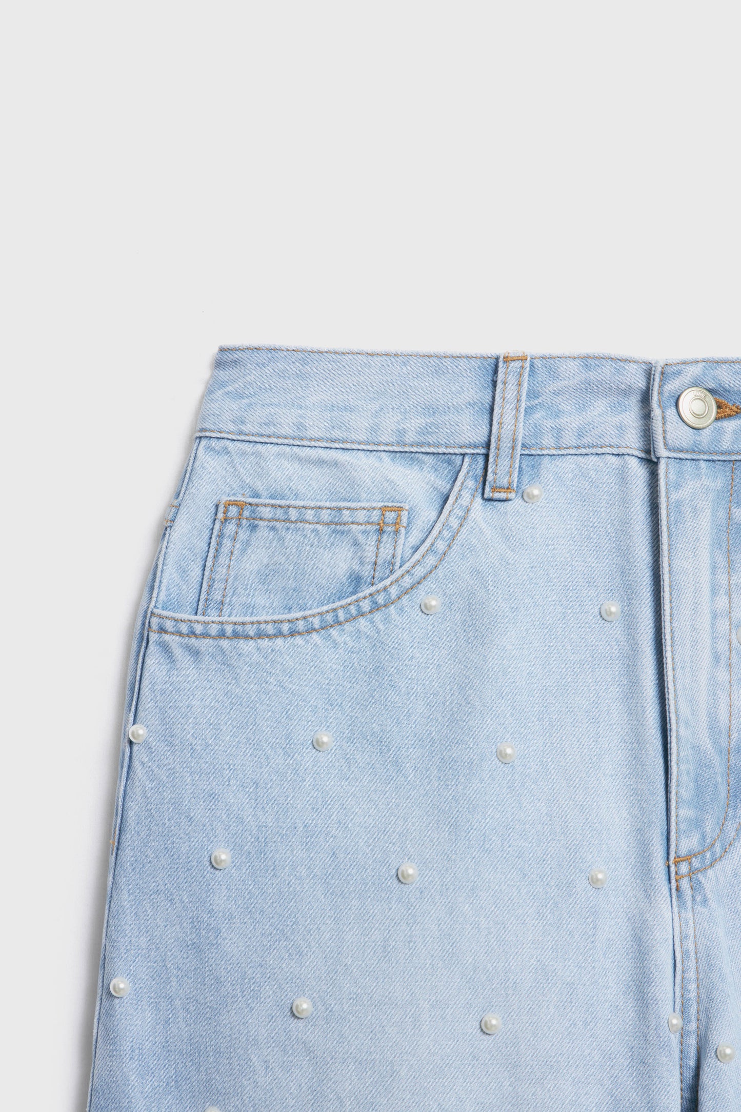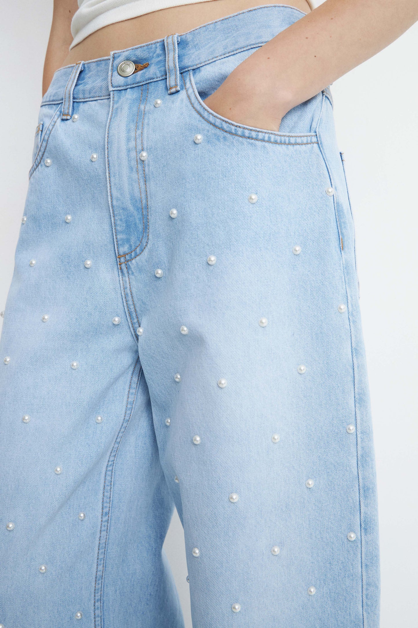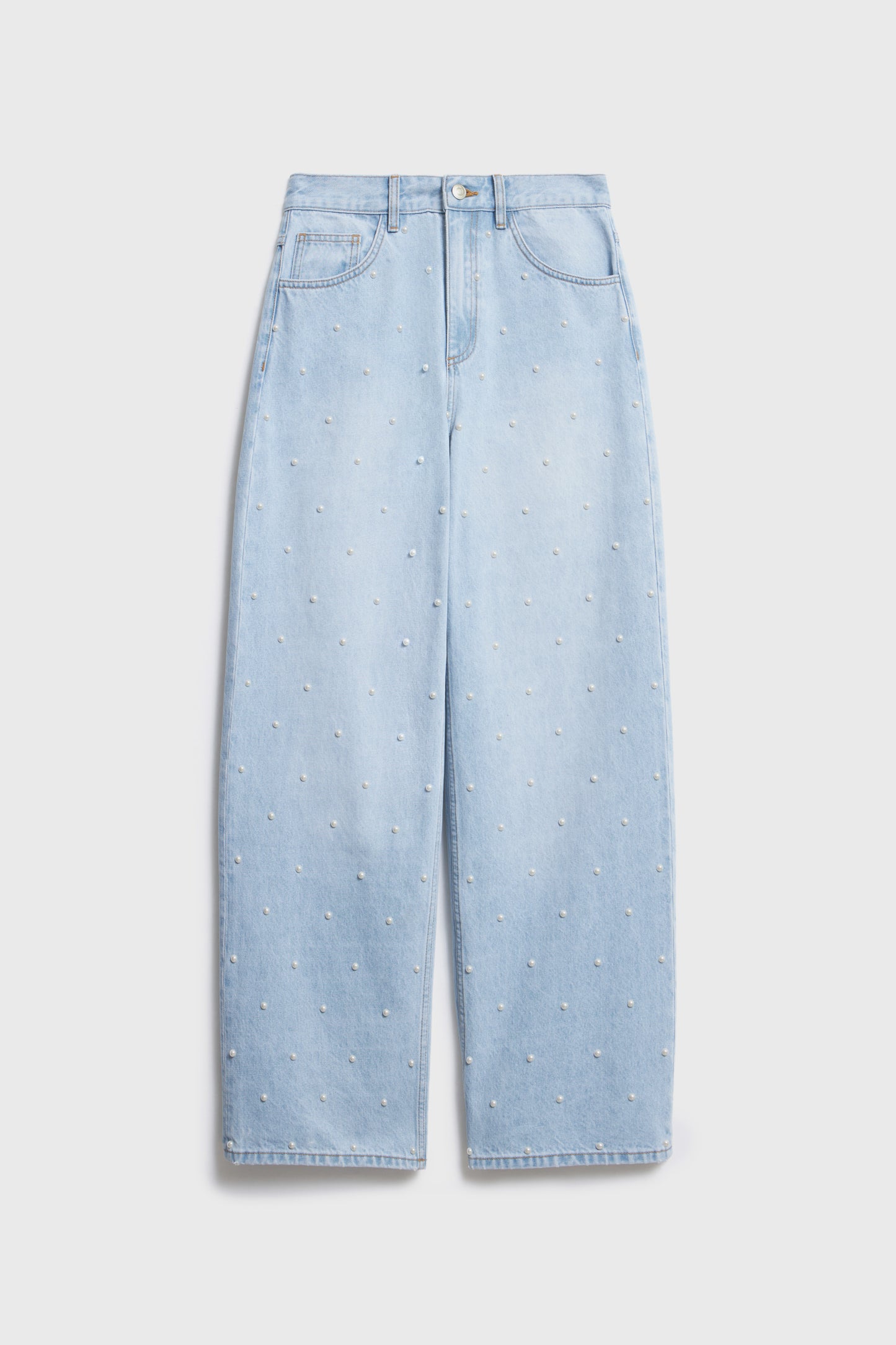 5-pocket jeans in washed cotton denim with a mid waist. Embellished with beads. Relaxed fit through the hip and thigh with tapered legs. Front zip fly and metal button fastening.