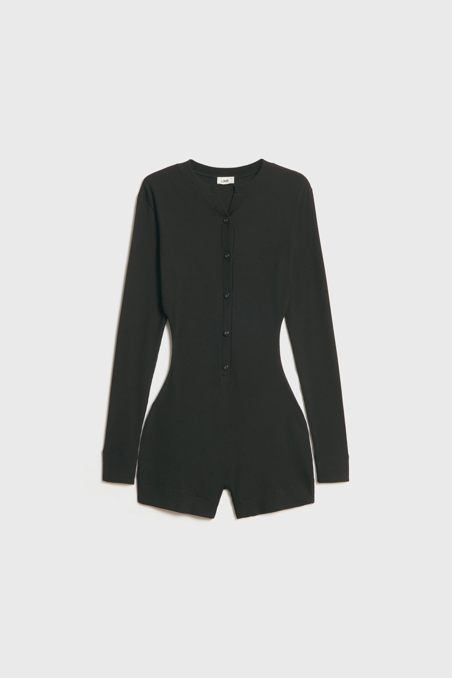 Fitted jumpsuit in modal jersey with a round neckline, long sleeves, short legs and buttons down the front.
