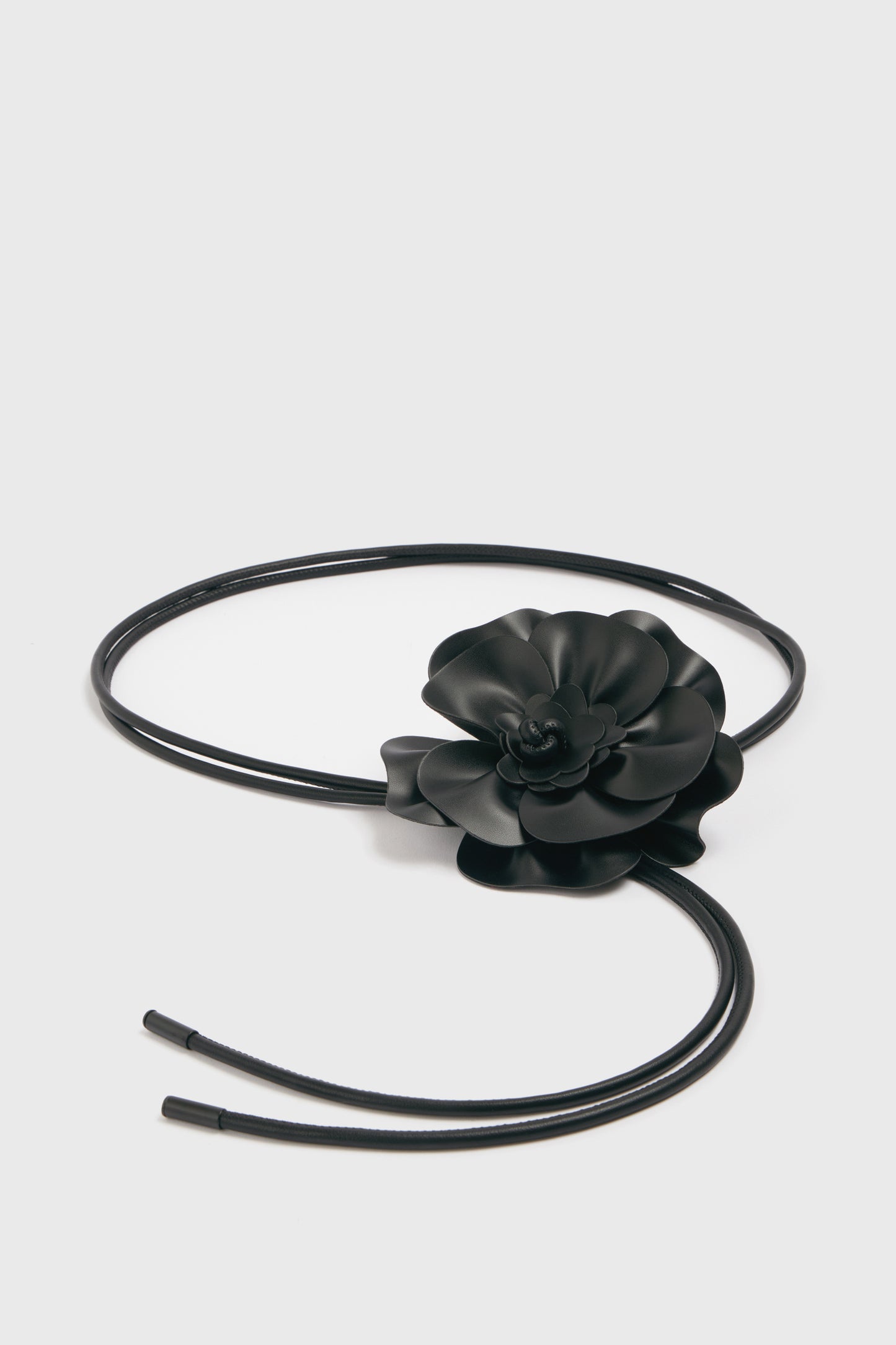 Narrow tie belt in coated fabric with large flower-shaped appliqué. ONE SIZE: 255 x 0,6 cm