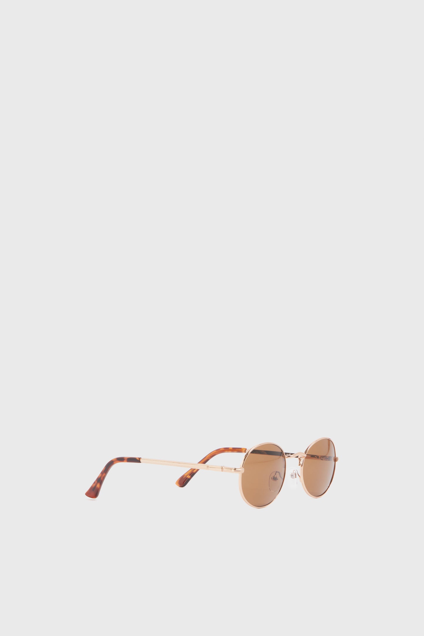Sunglasses with a thin metal frame and tinted, UV-protective lenses. Case included.