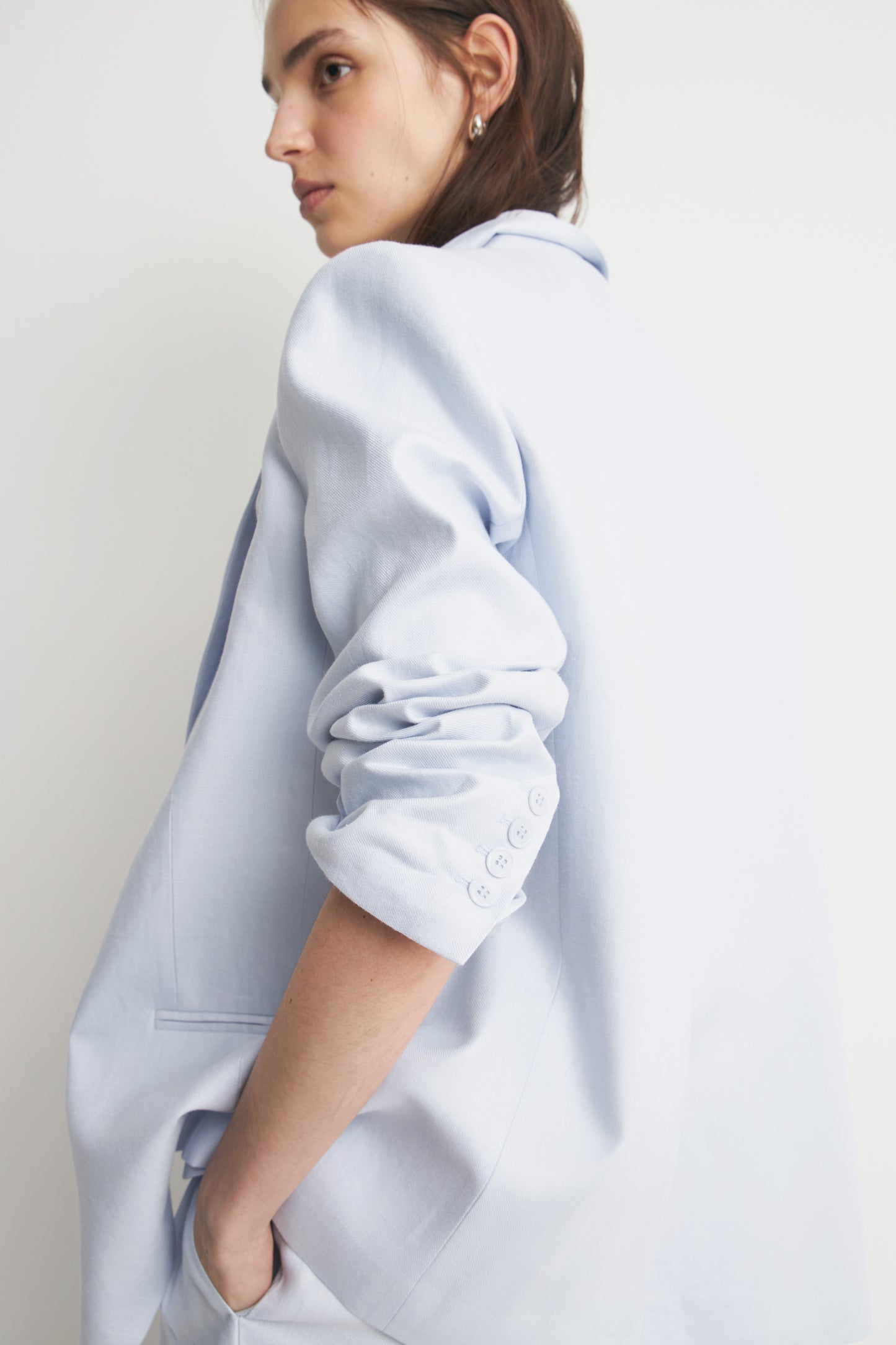 Oversized blazer in a linen blend with a notched lapel collar and long sleeves, shoulder pads. Hip welt pockets. Decorative chest pocket. Matching lining. Single-breasted front with button.