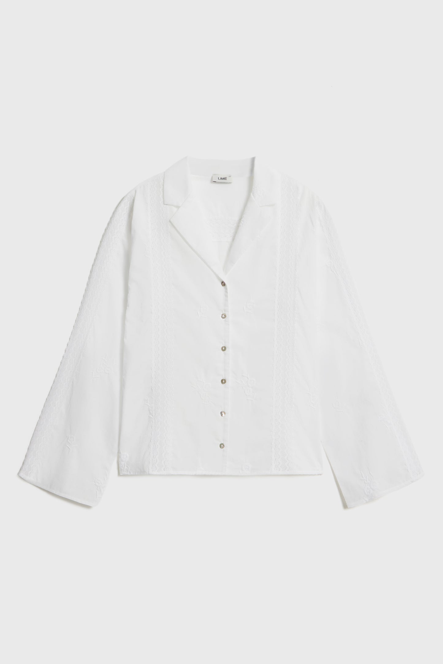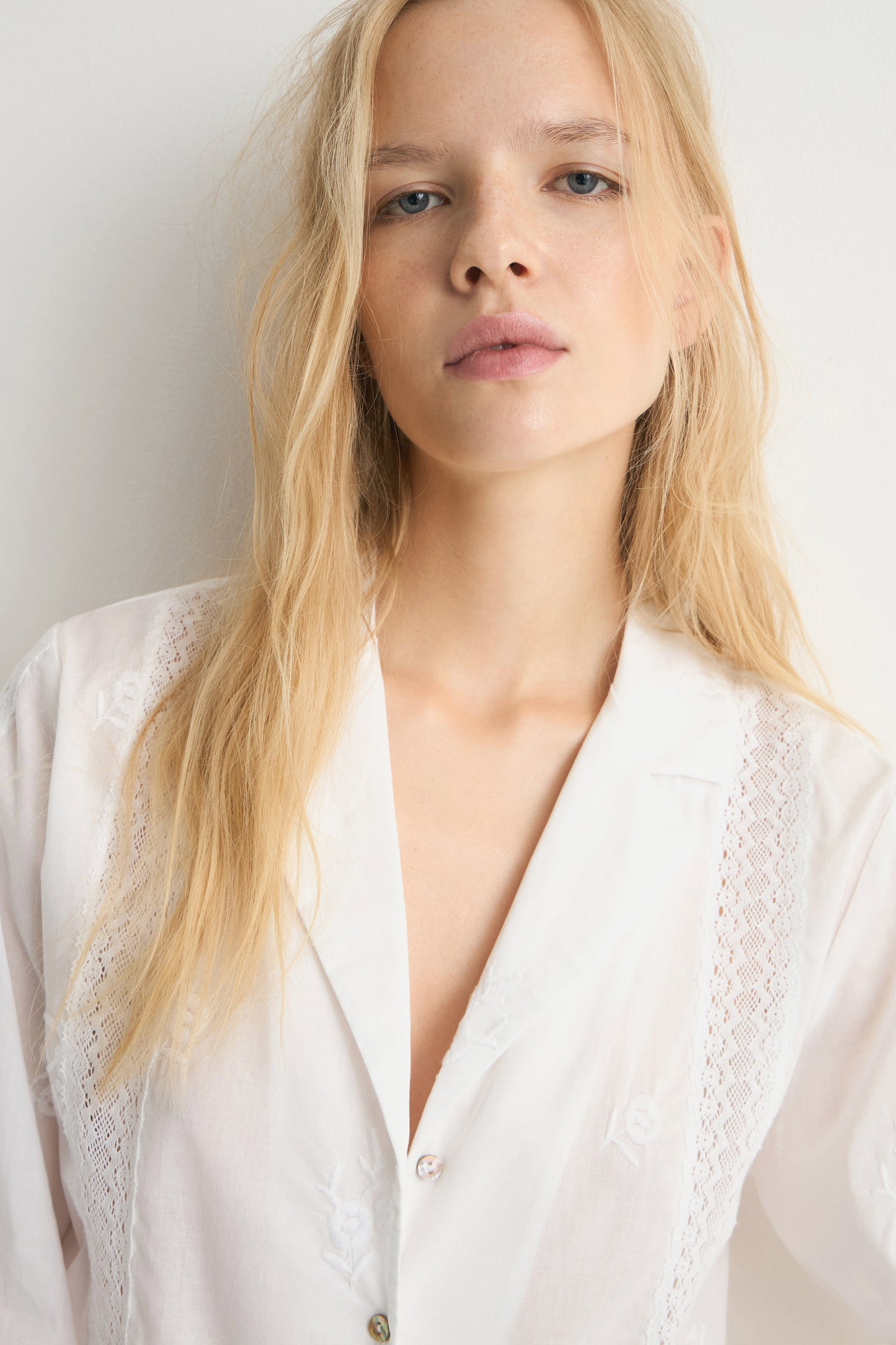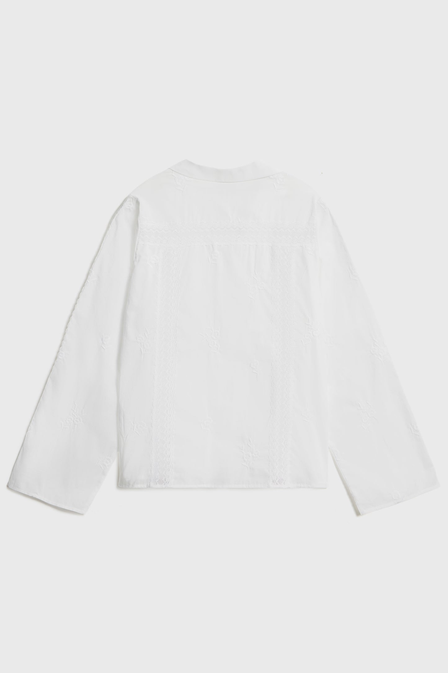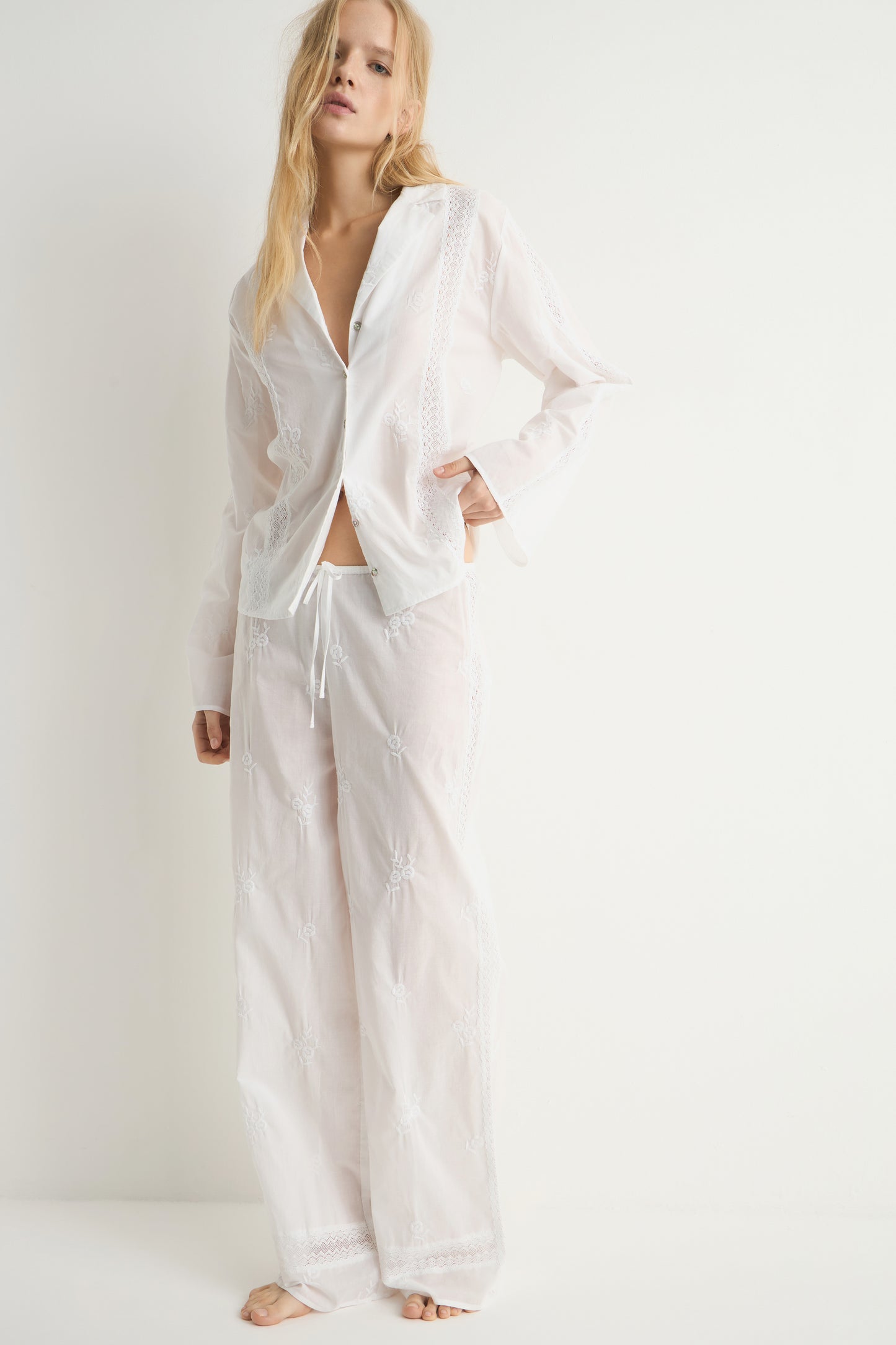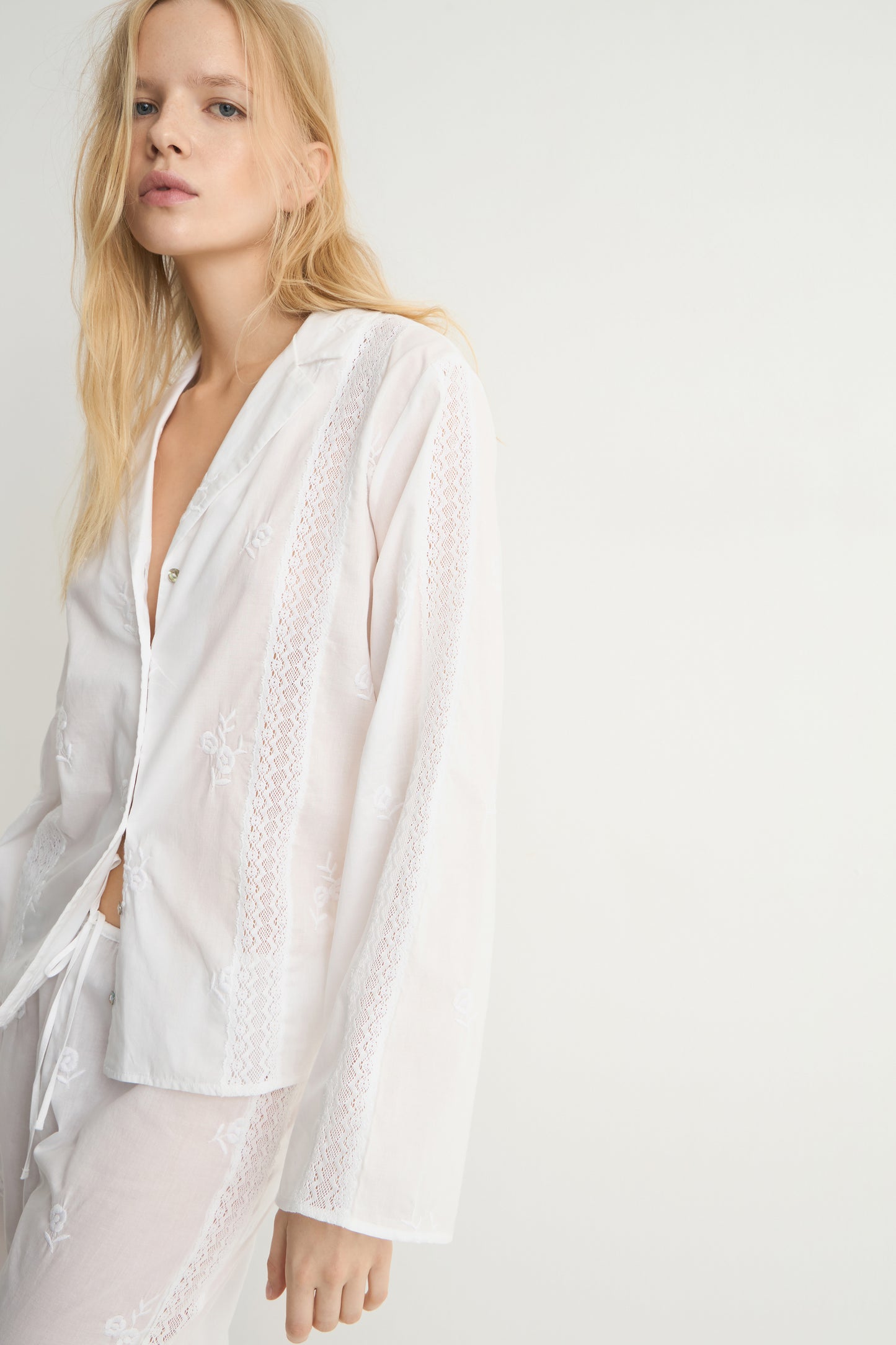 Pajama shirt in soft cotton weave with embroidered floral motif and delicate lace trim. Features notched lapels, buttons at front and long sleeves.