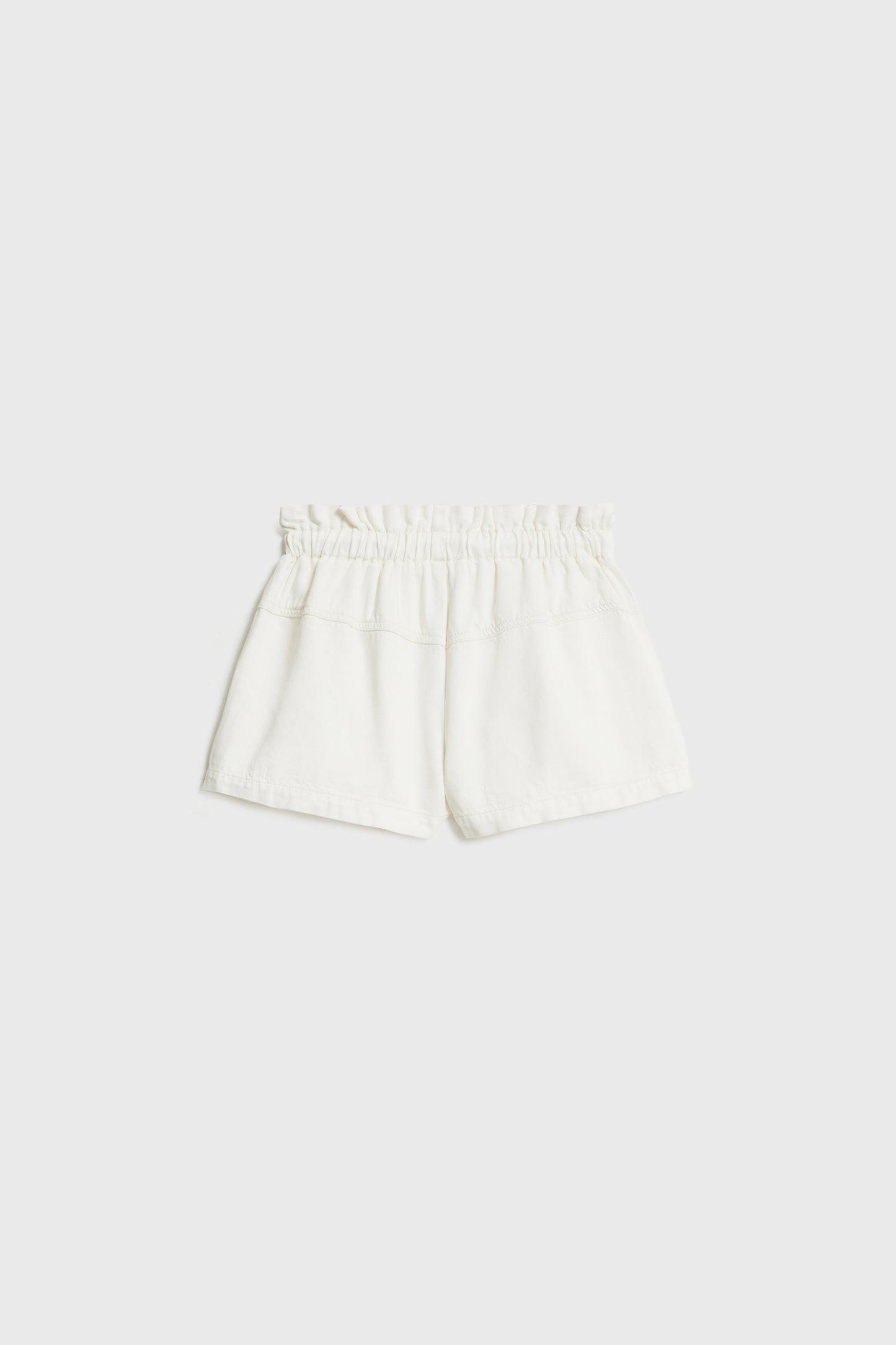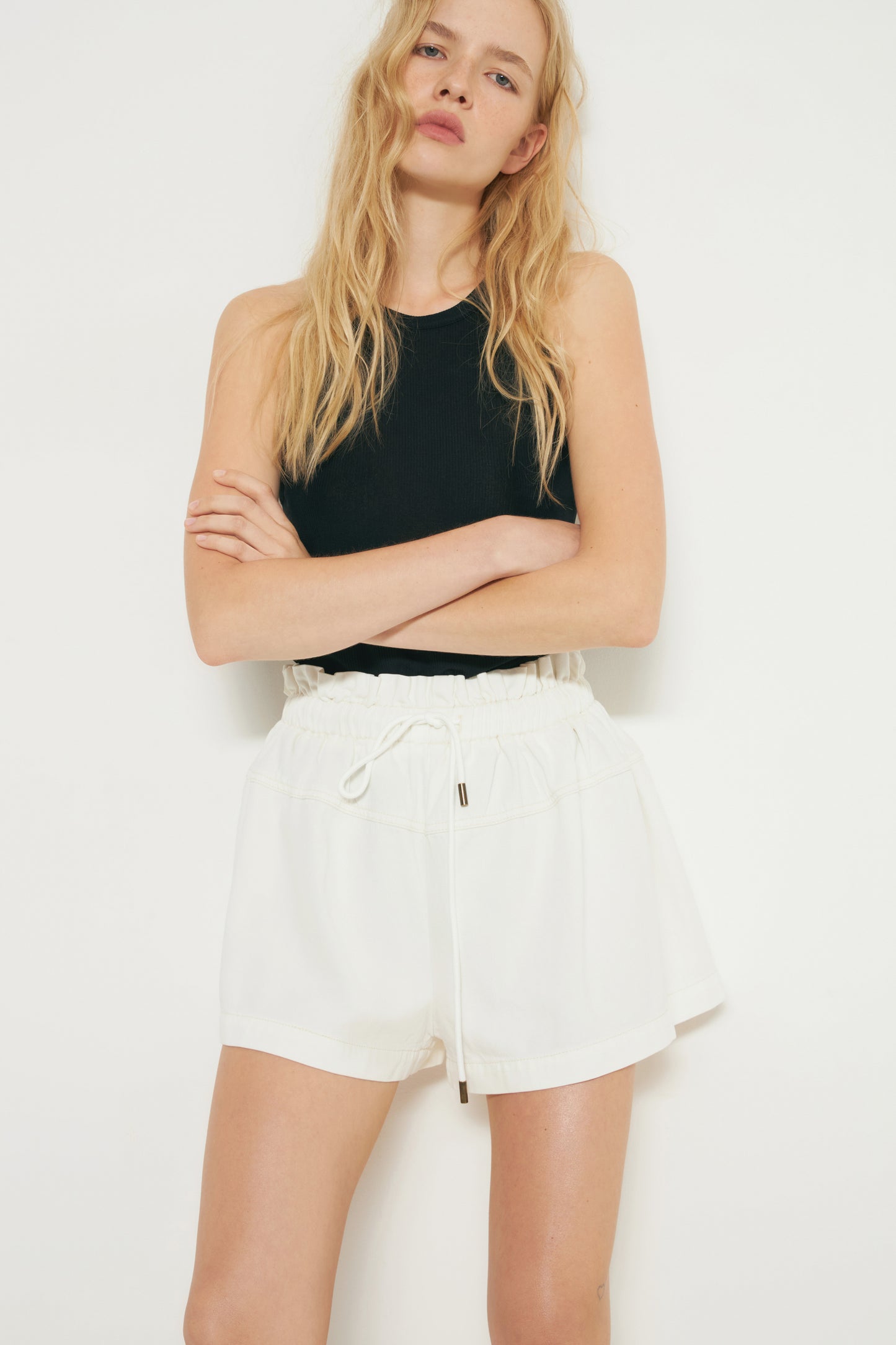 Denim shorts are designed with a paperbag waist that cinches with tonal drawstrings. Wide legs.