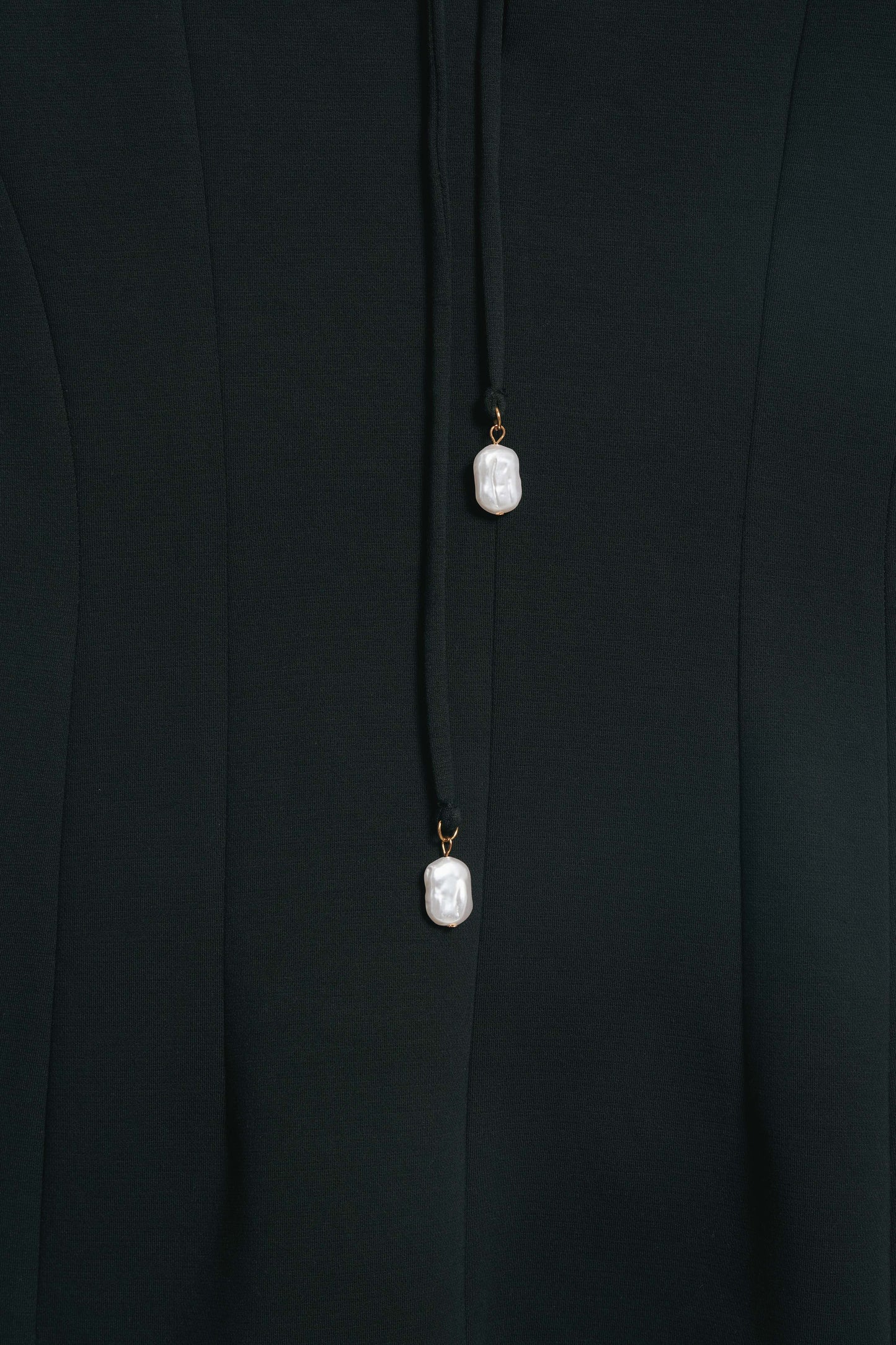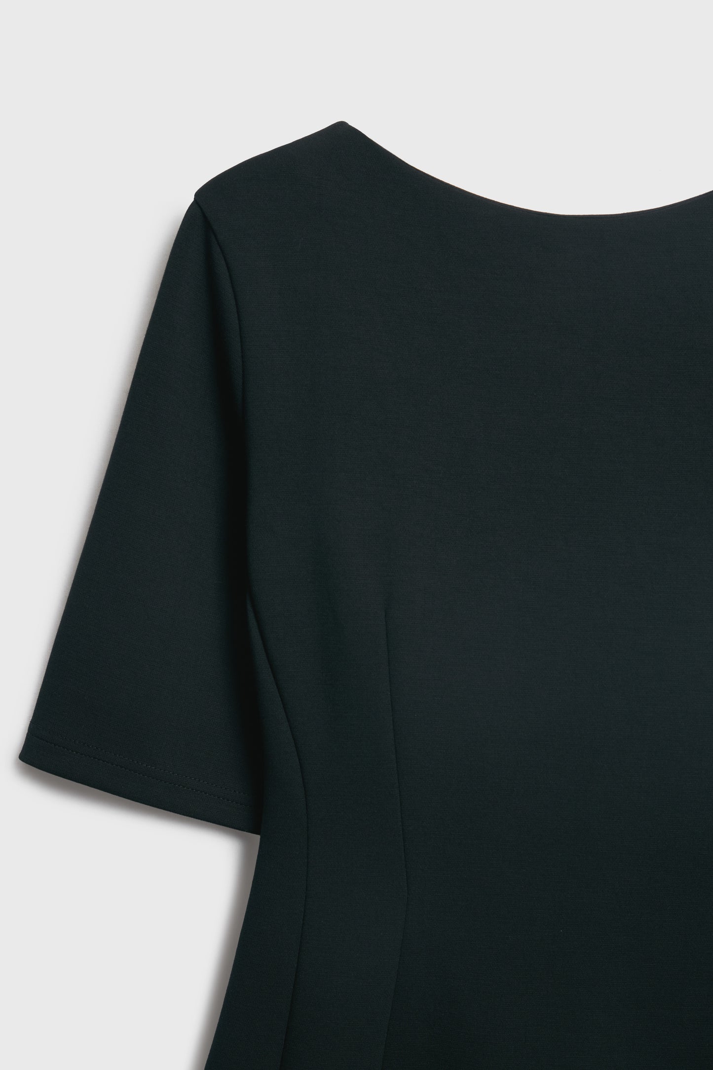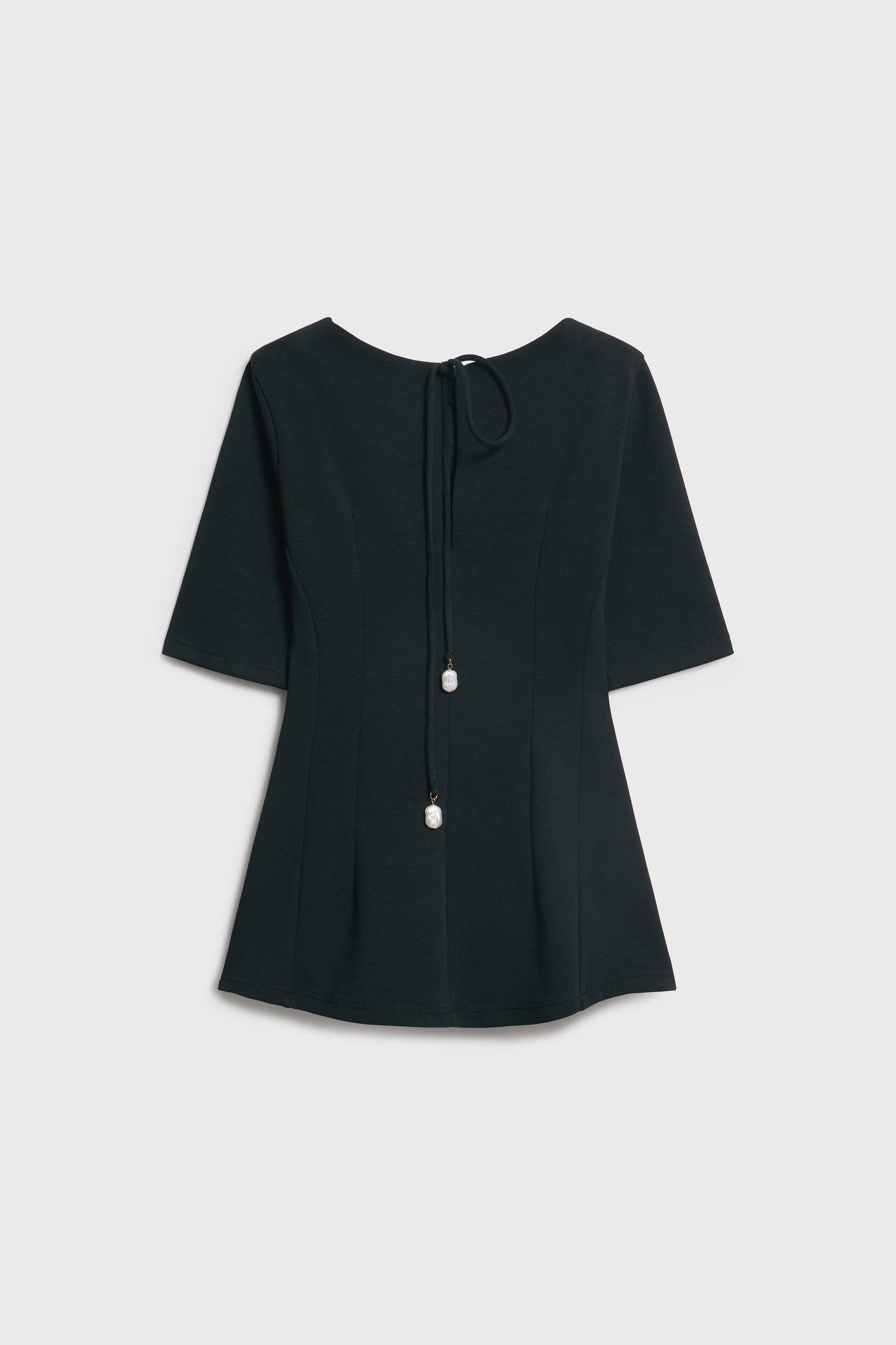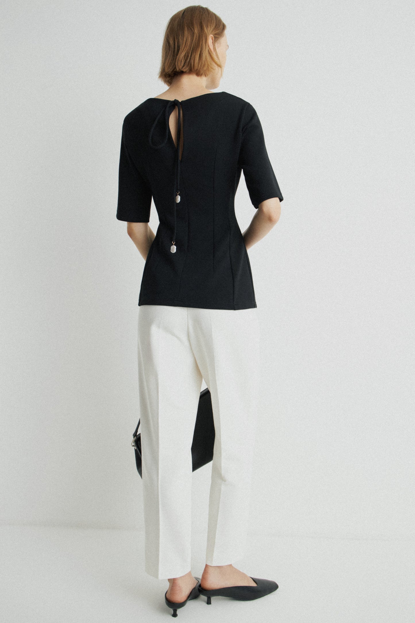 T-shirt in soft viscose-cotton blend with stretch. Boat neck, dropped shoulders, and short sleeves. Gently tapered waist for a defined silhouette. Extra-narrow pearly pendant ended straps that tie at back.