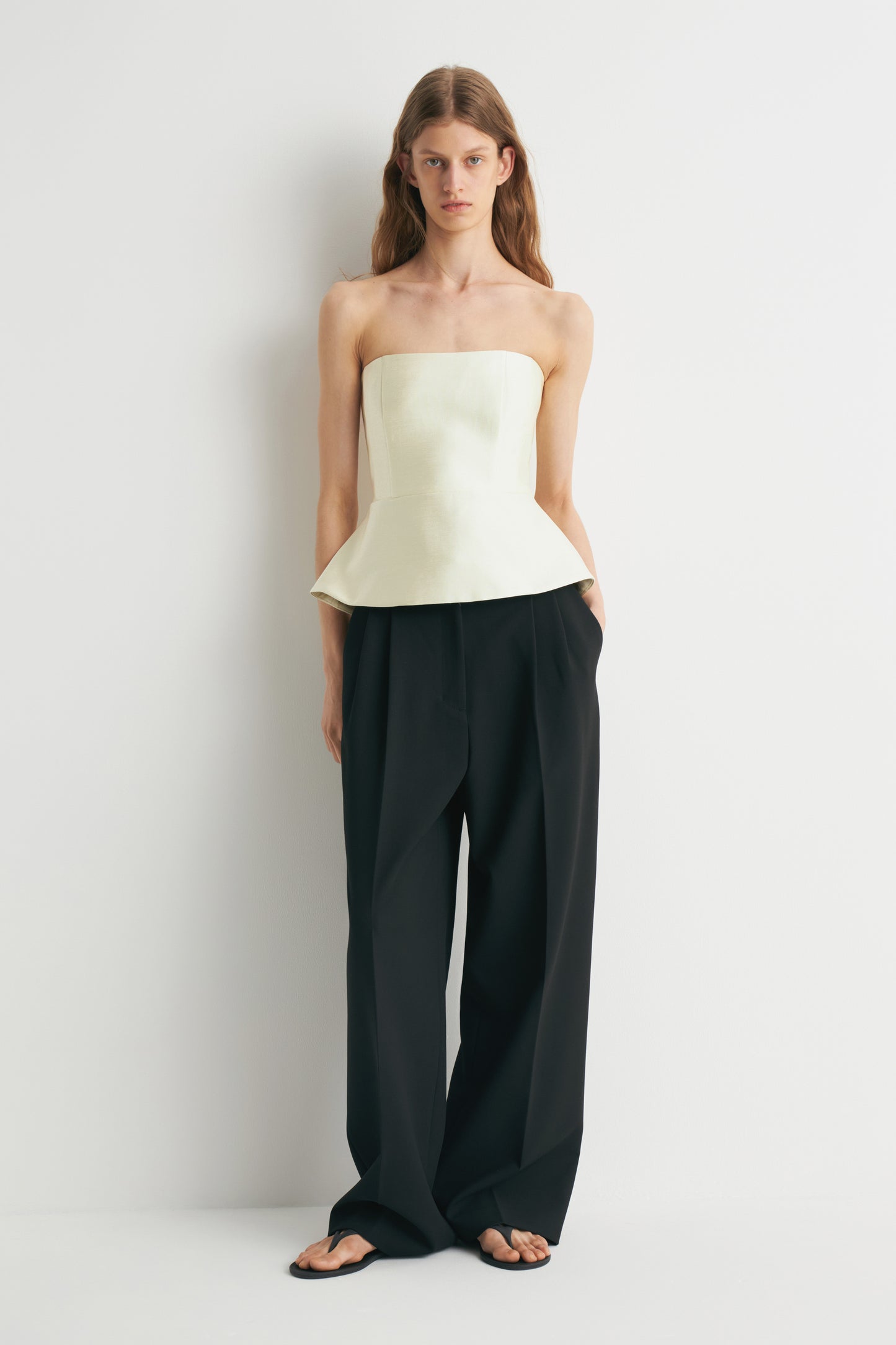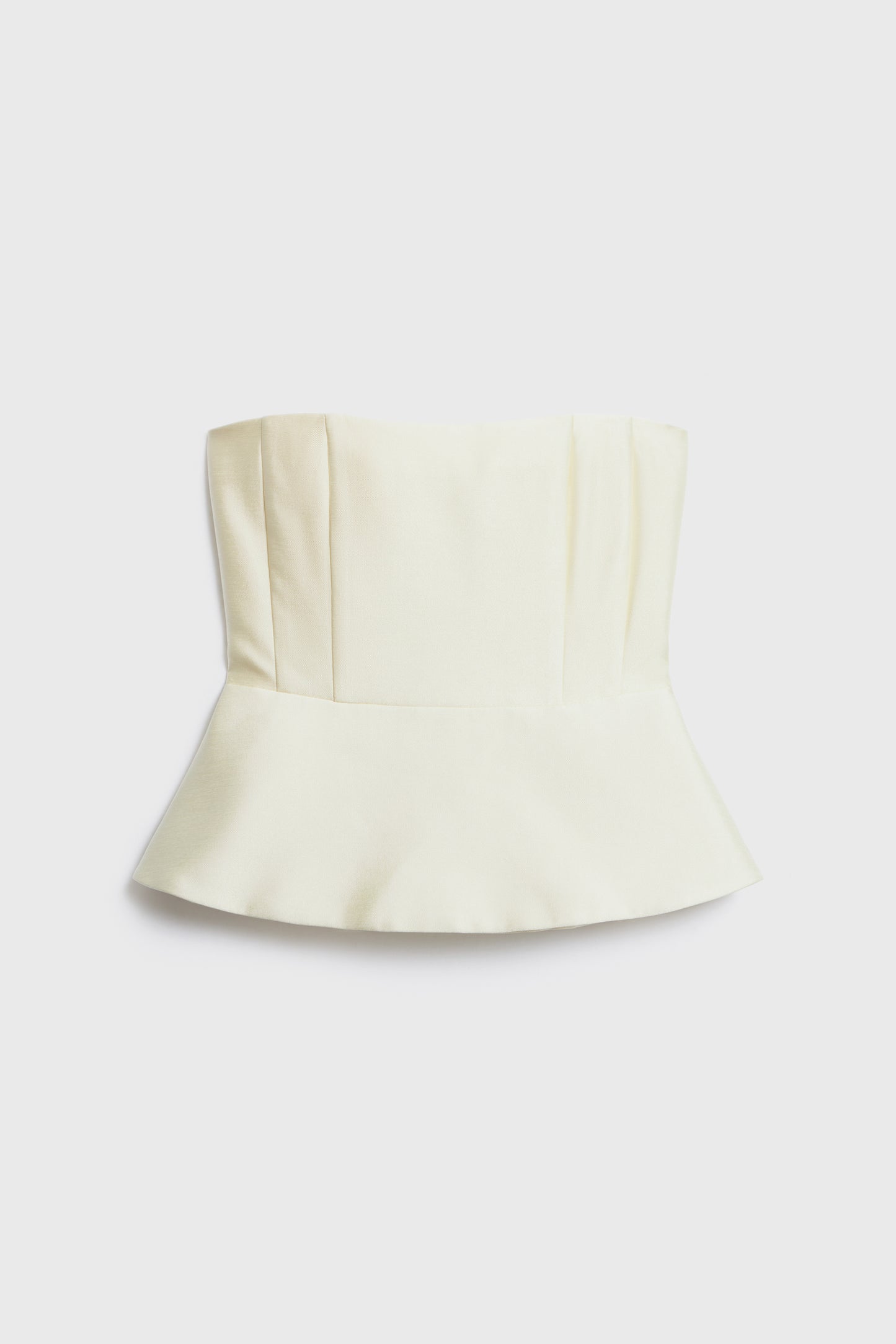 This viscose bustier finished with a seam under the waist, a flared peplum and a corset-inspired finish with underwired bodice for added shape. Metal zip fastener at the back. Lined.