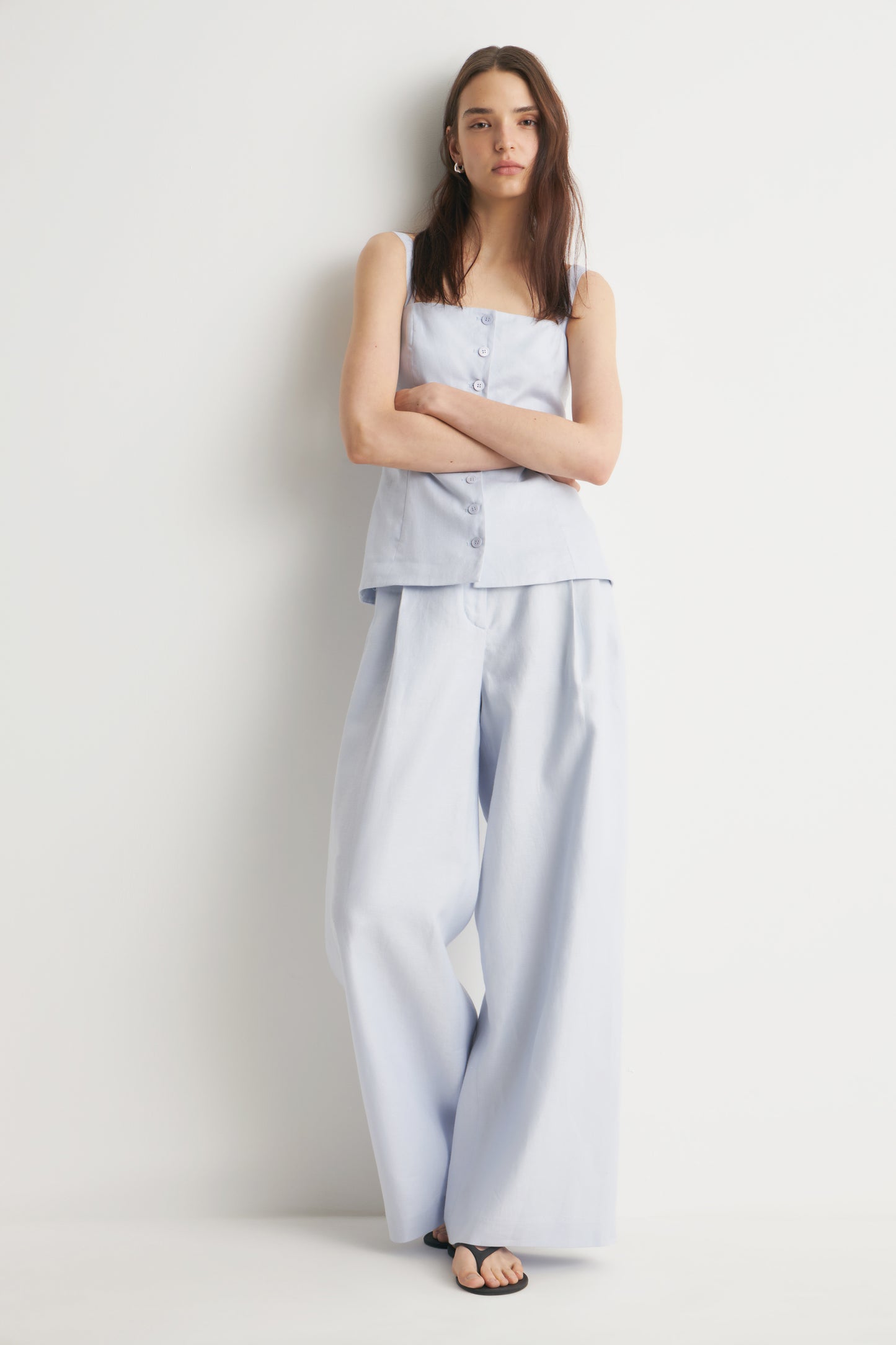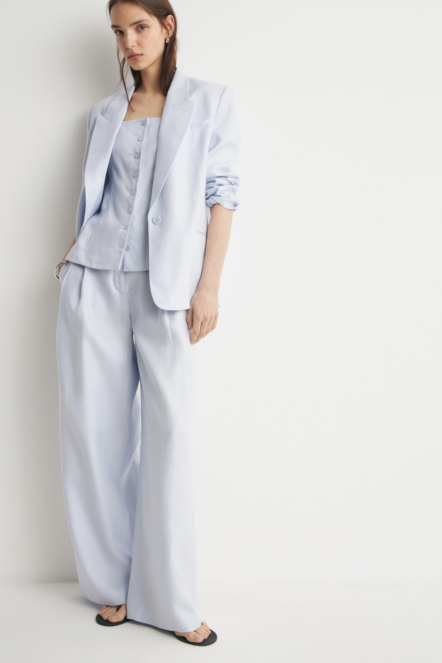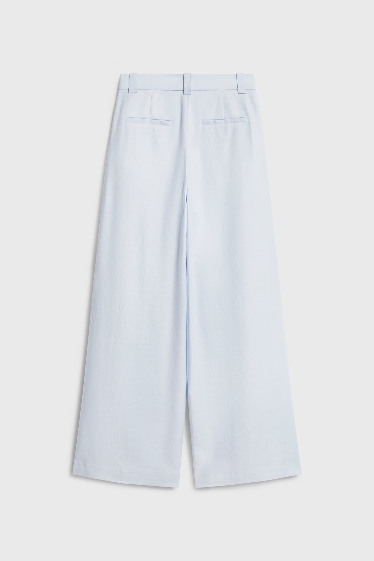 Pleated trousers crafted from a linen weave. Straight-leg design. Featuring front pockets and fake rear welt pockets. Front zip fly, button and metal hook fastening.