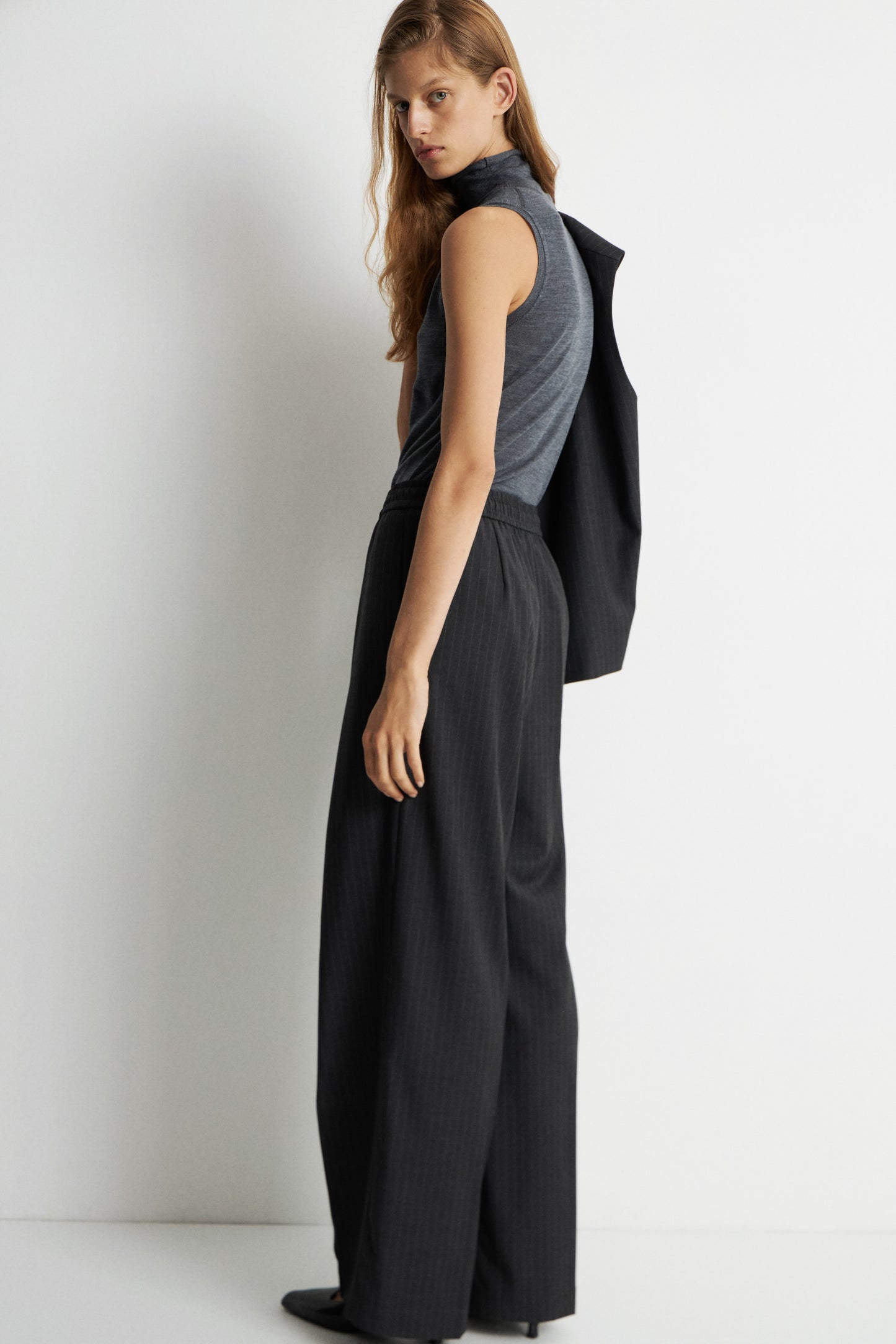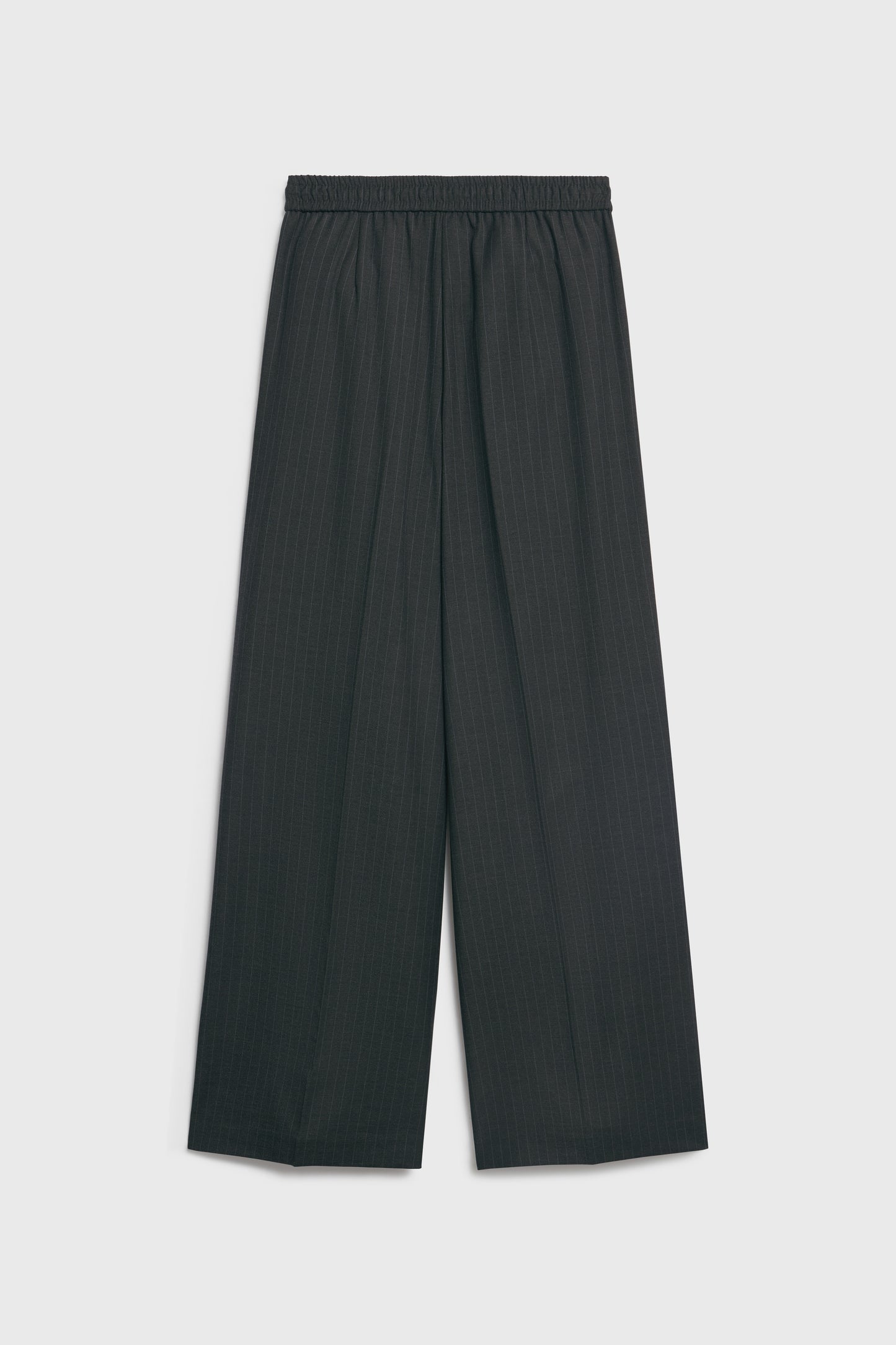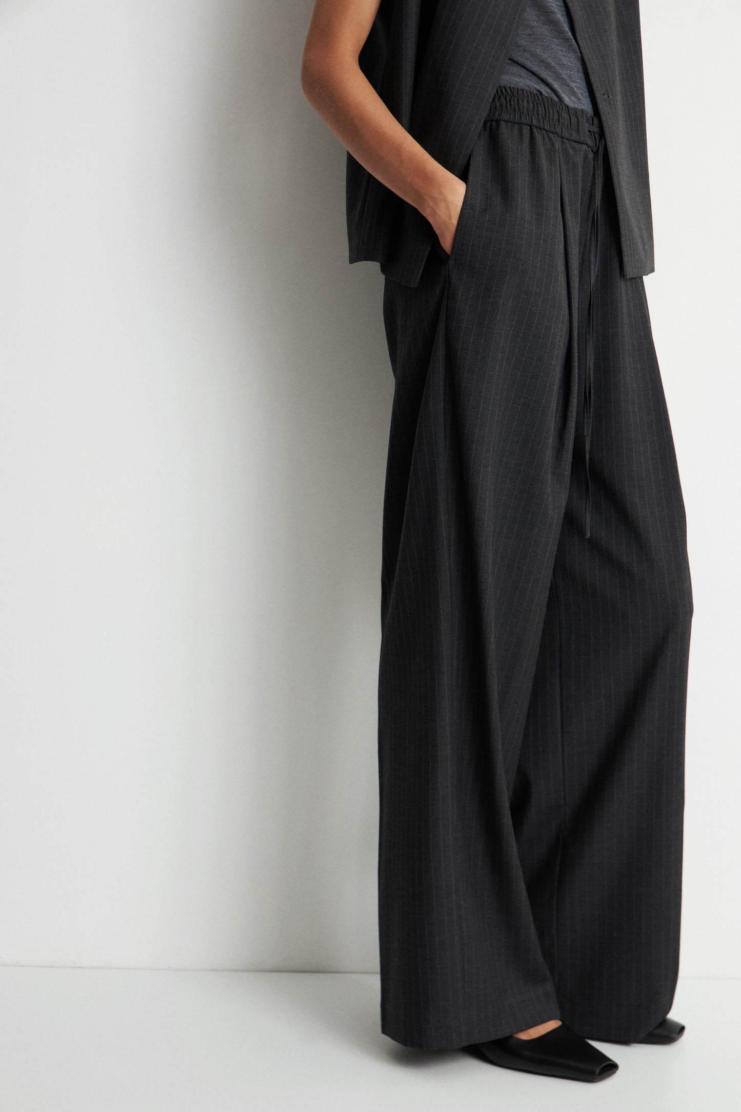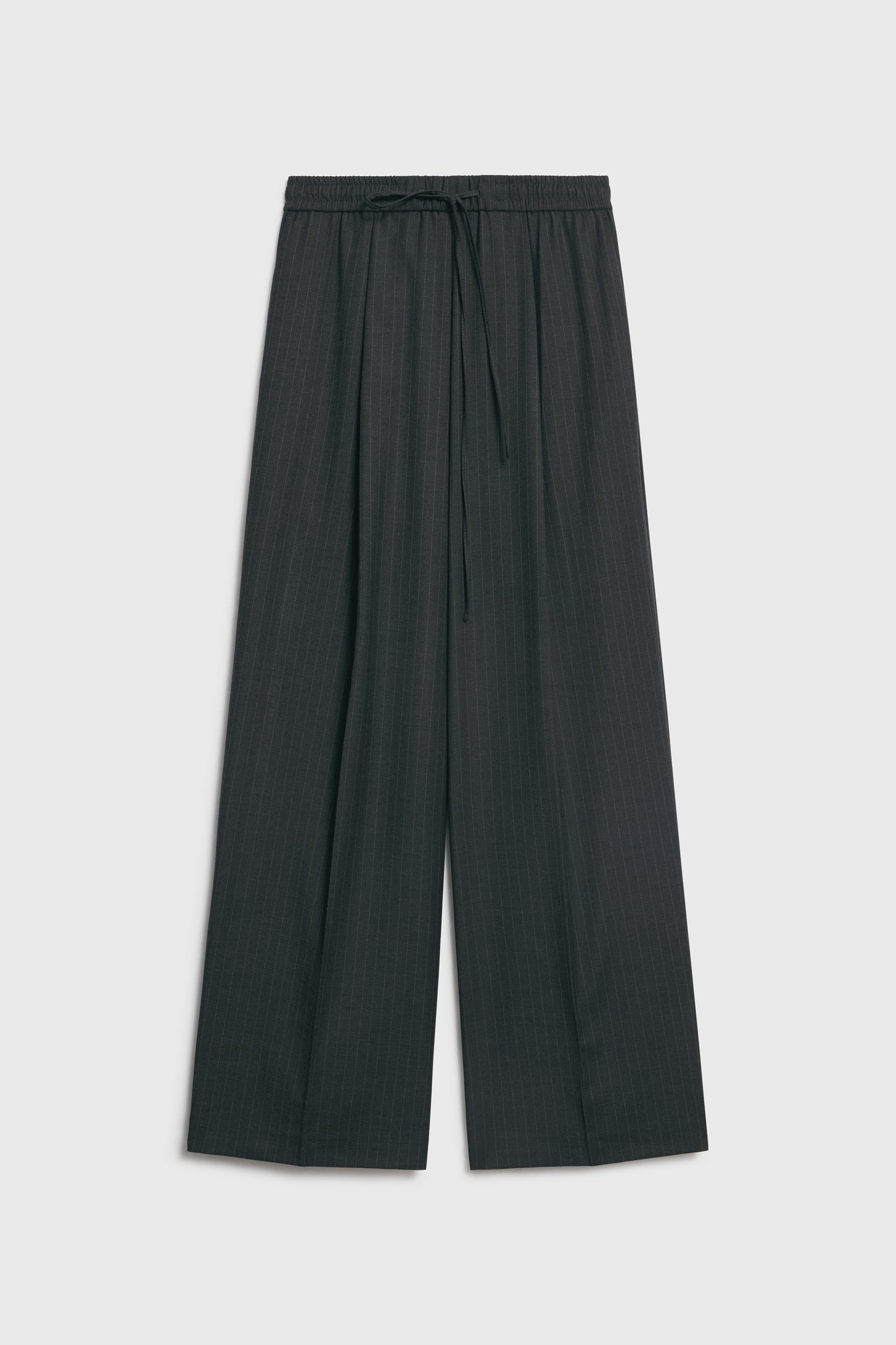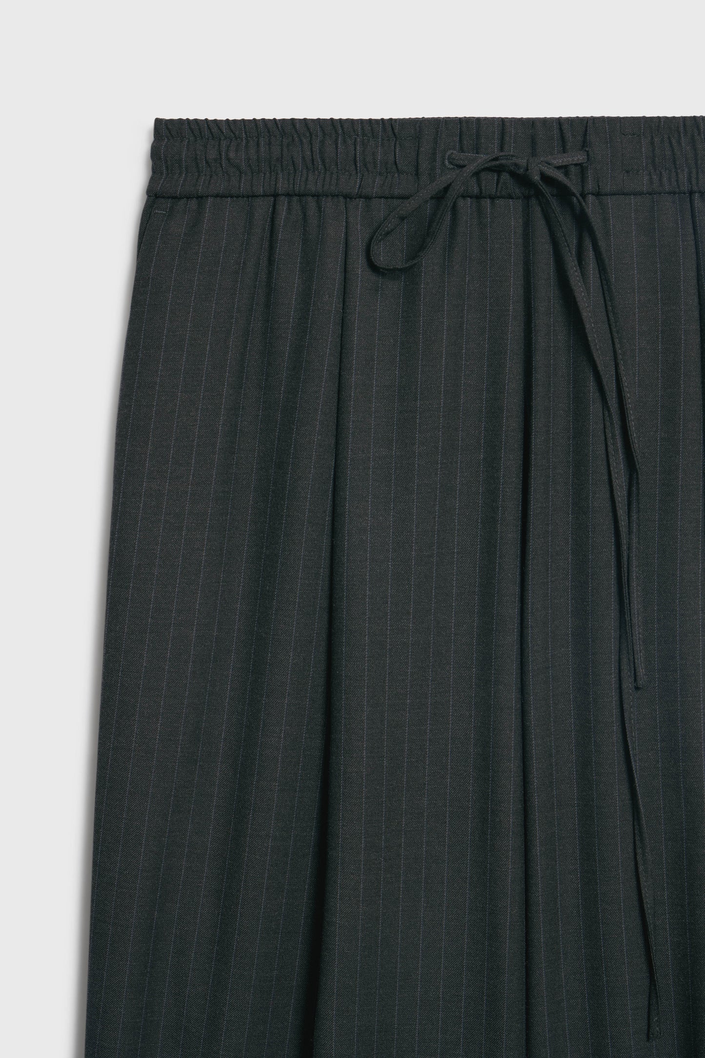 Straight trousers made of a viscose blend yarn with some wool. Drawstring at waistband. Side pockets. Pleat detail and pressed front crease.