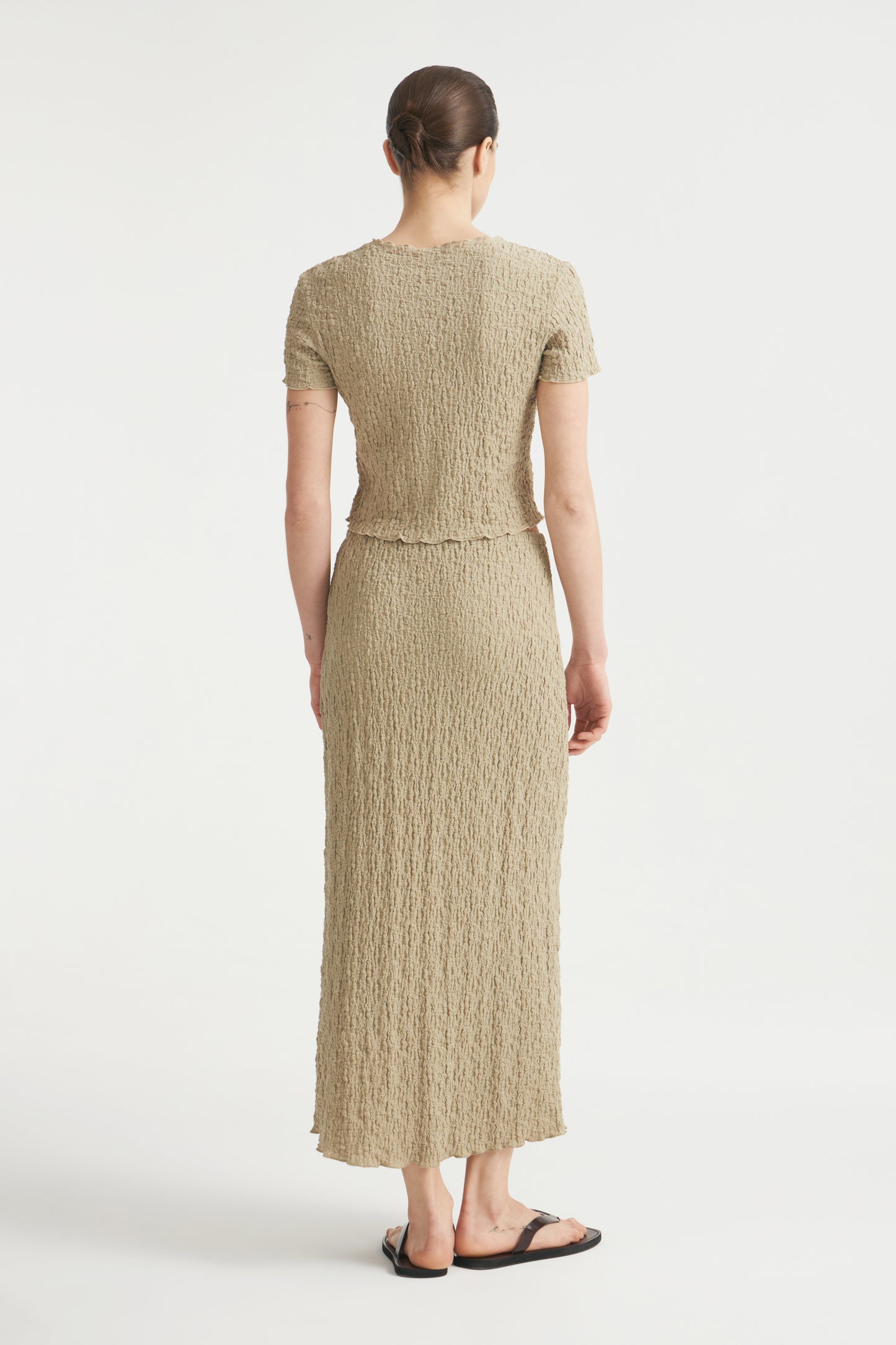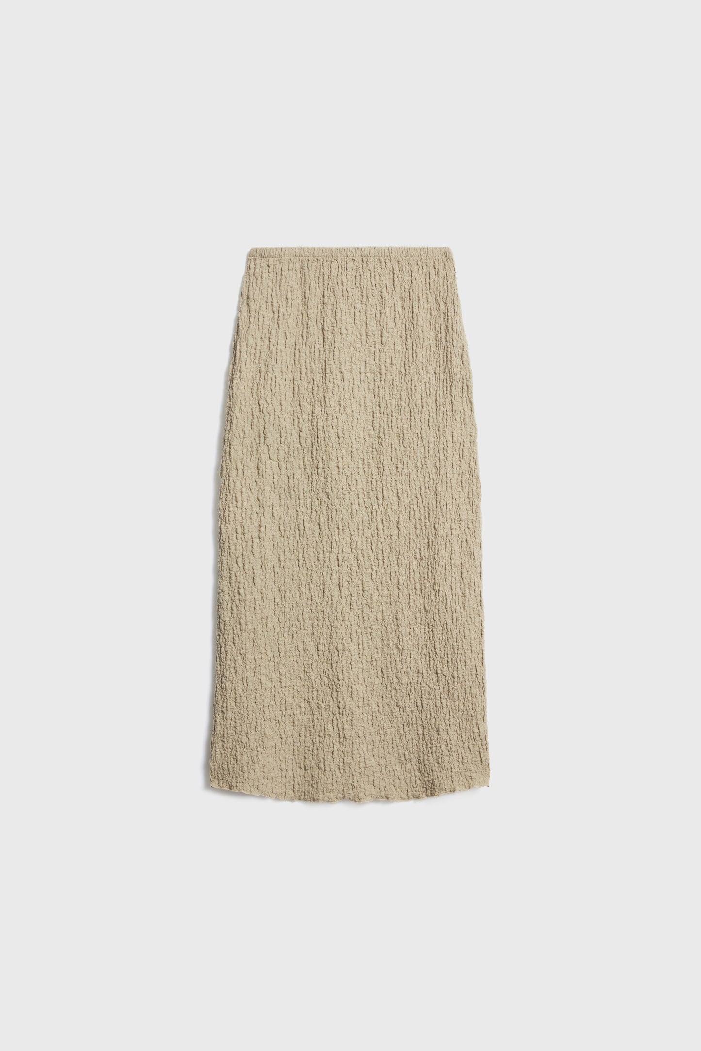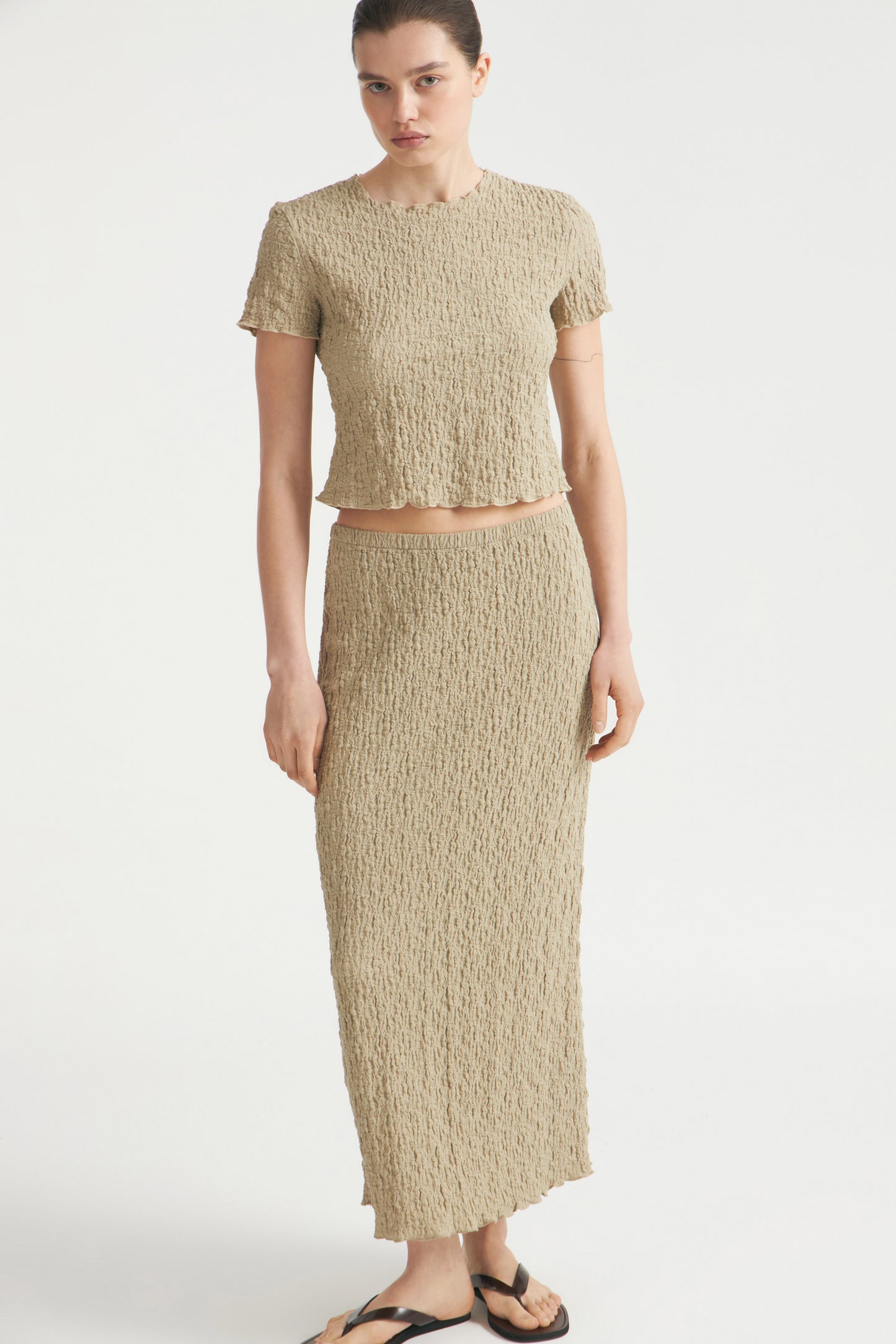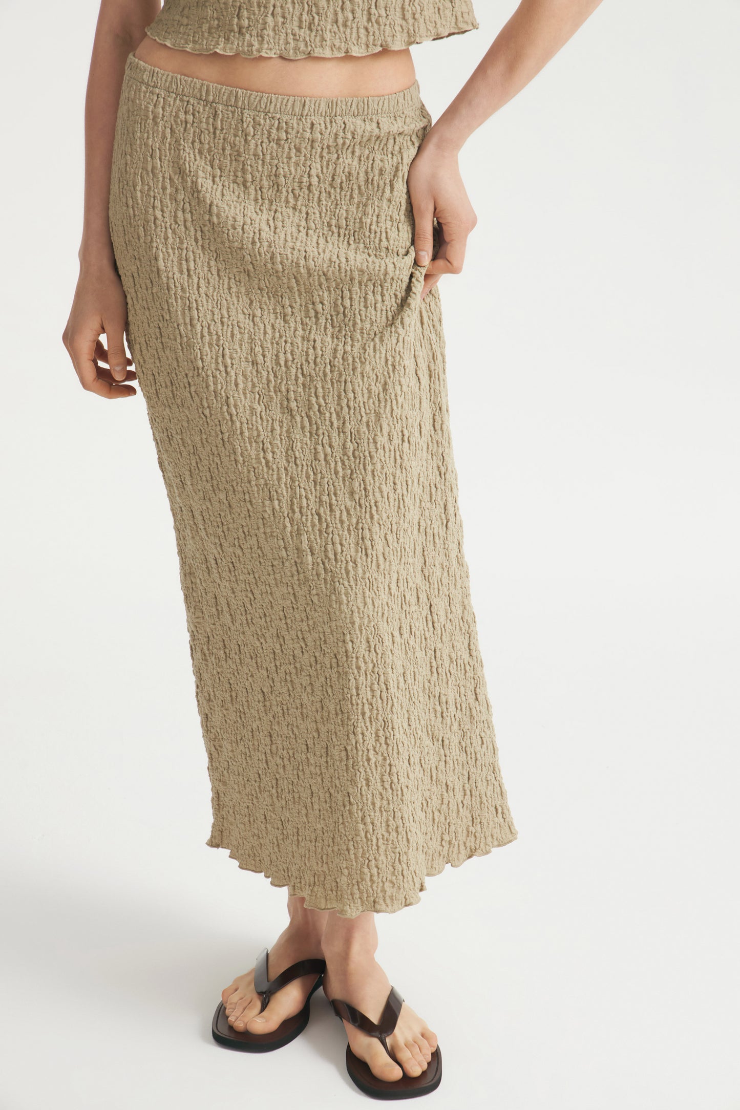 A maxi-length skirt crafted from crinkled cotton blend jersey. Elasticated waistband, fitted silhouette and overlocked slightly frilled hem.