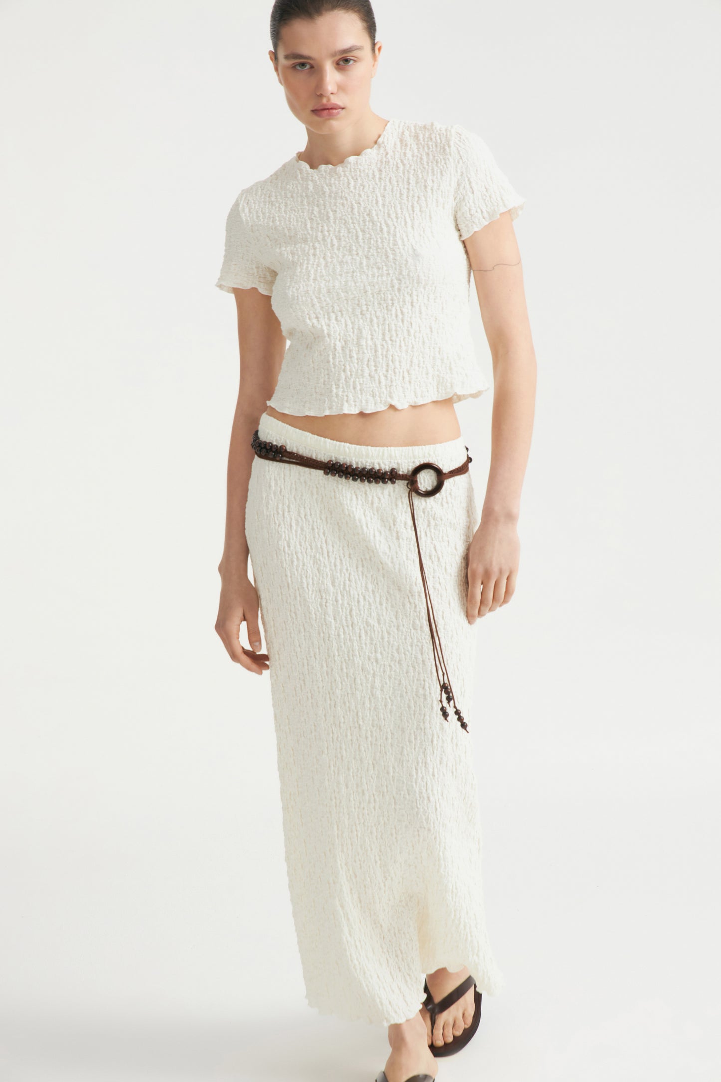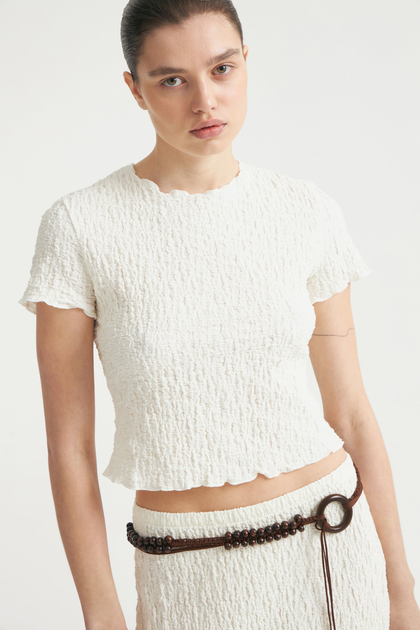 Fitted T-shirt crafted from crinkled cotton blend jersey. Round neck and short sleeves with overlocked edges.