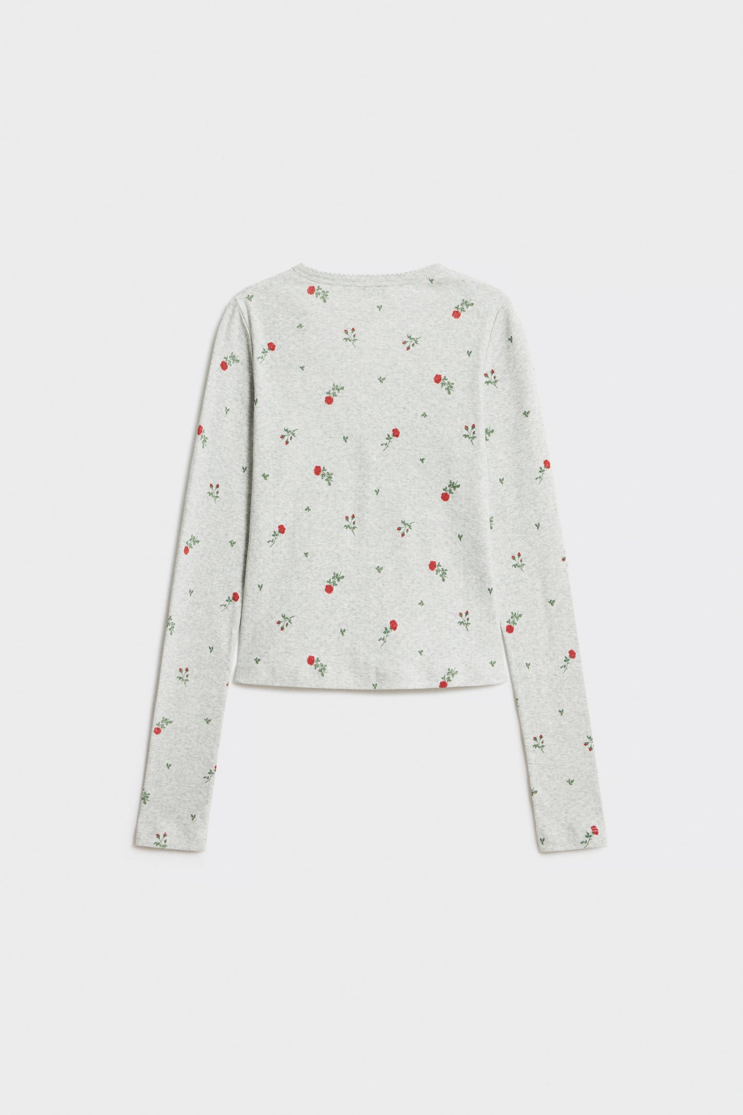 Fitted T-shirt in supersoft pointelle jersey cotton with a round neckline and buttons at front. Long sleeves. Lace trim.