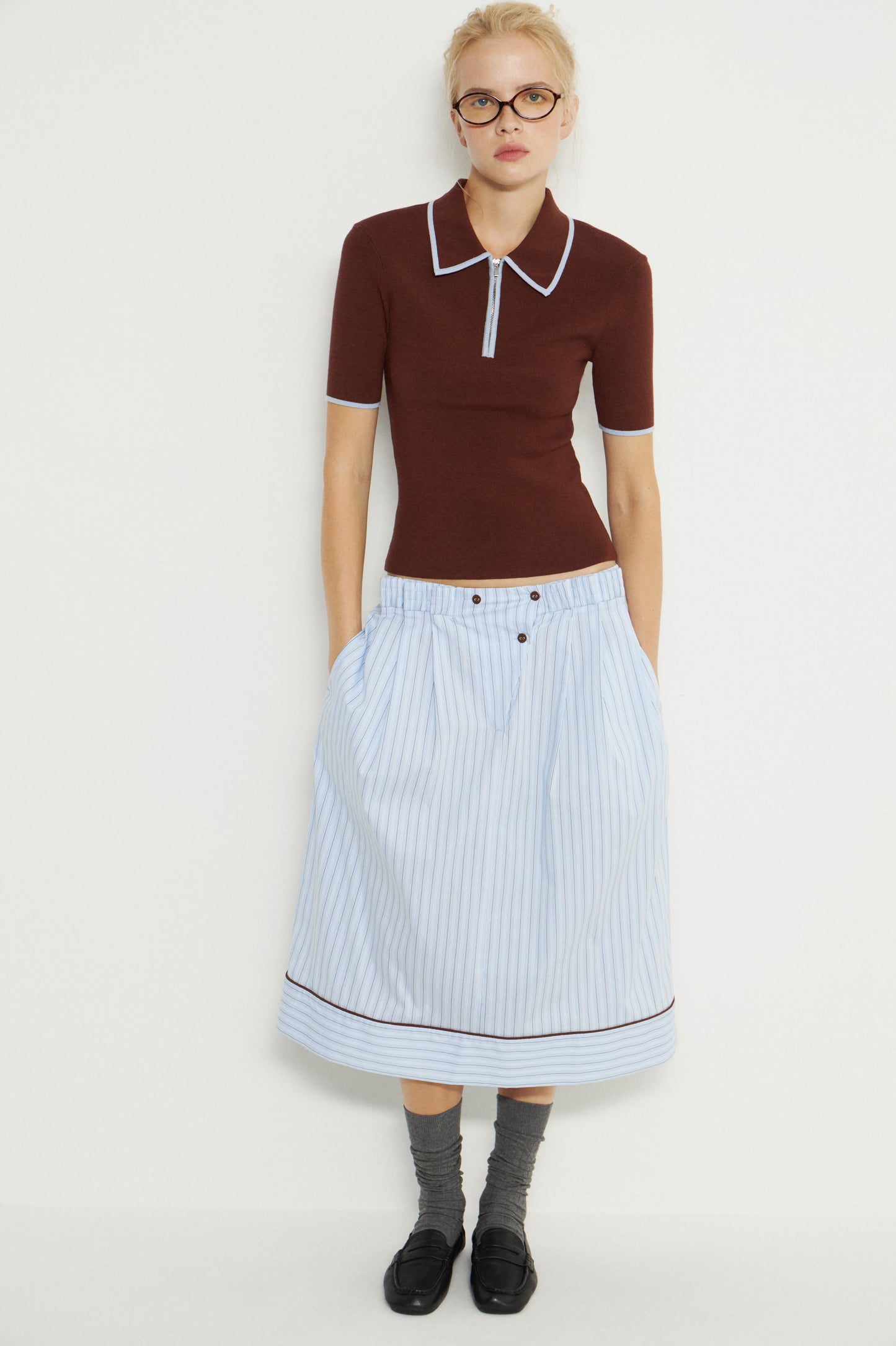 Fitted retro-style sweater with short sleeves and contrast trims. Polo collar with a zip fastening.