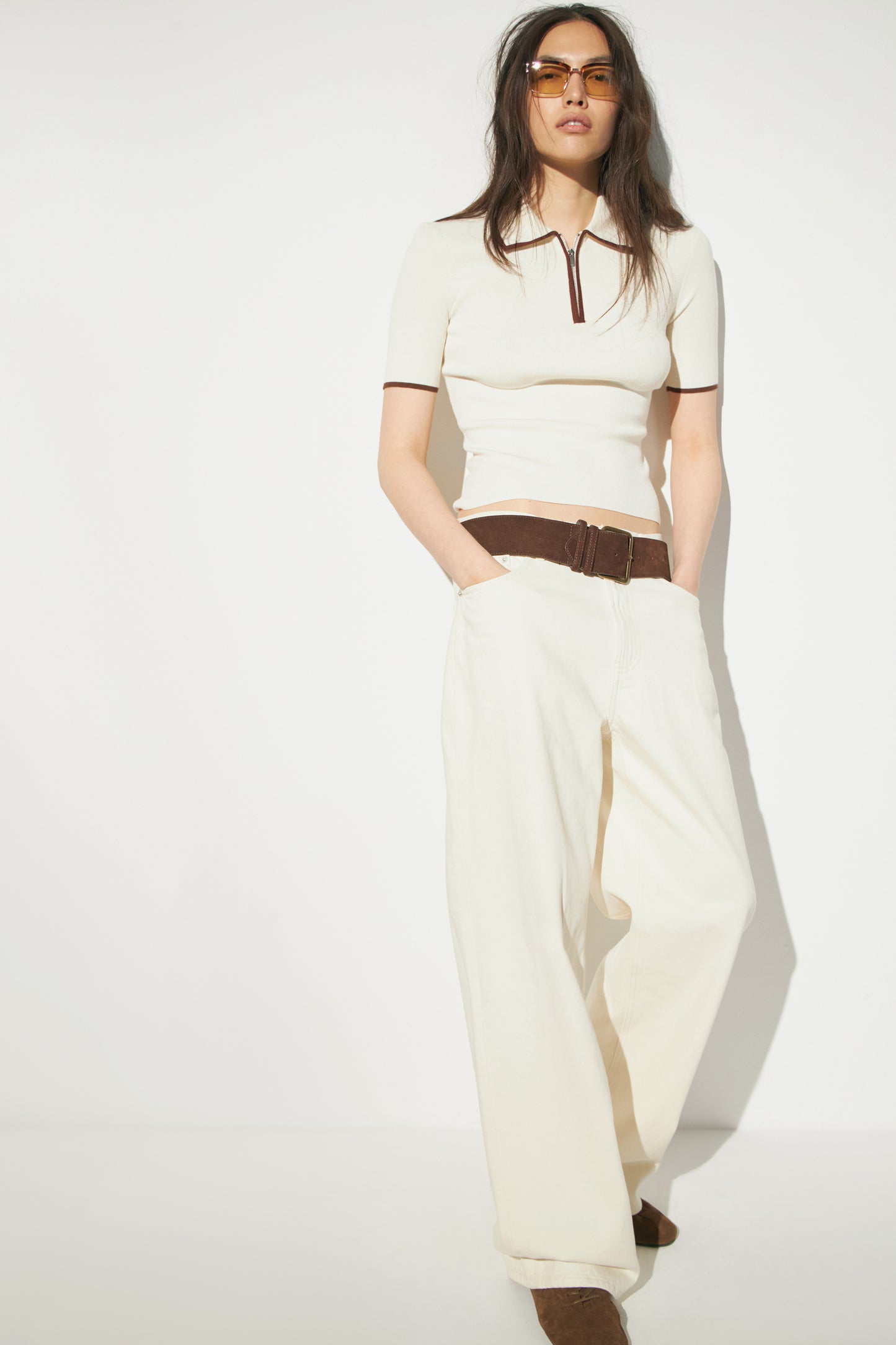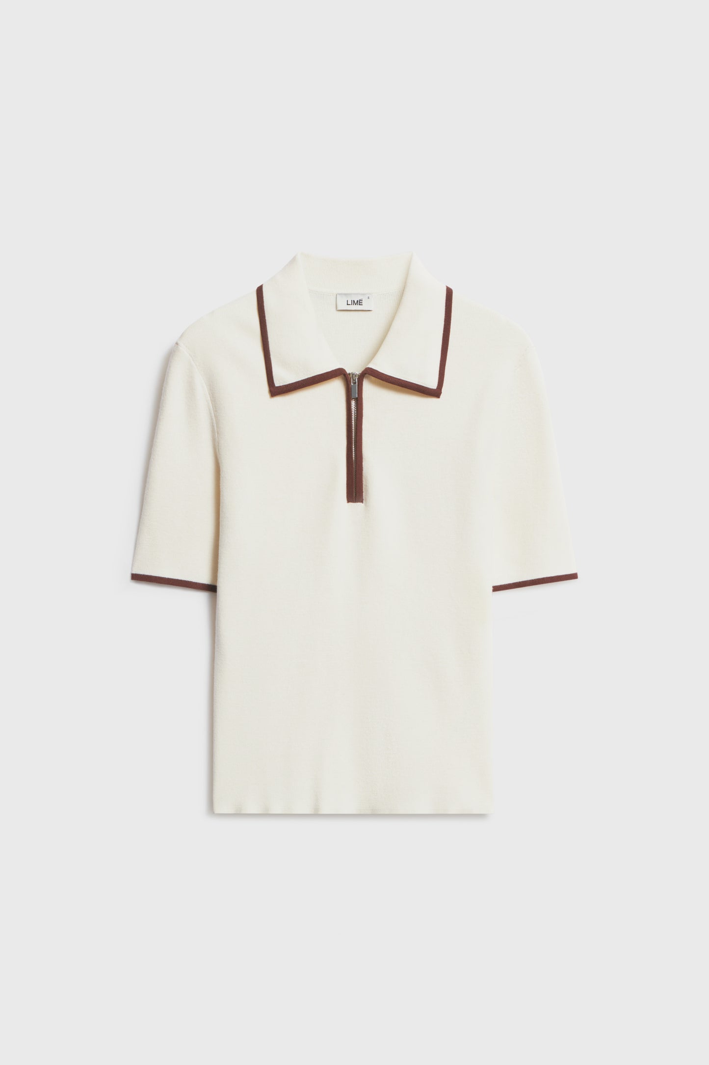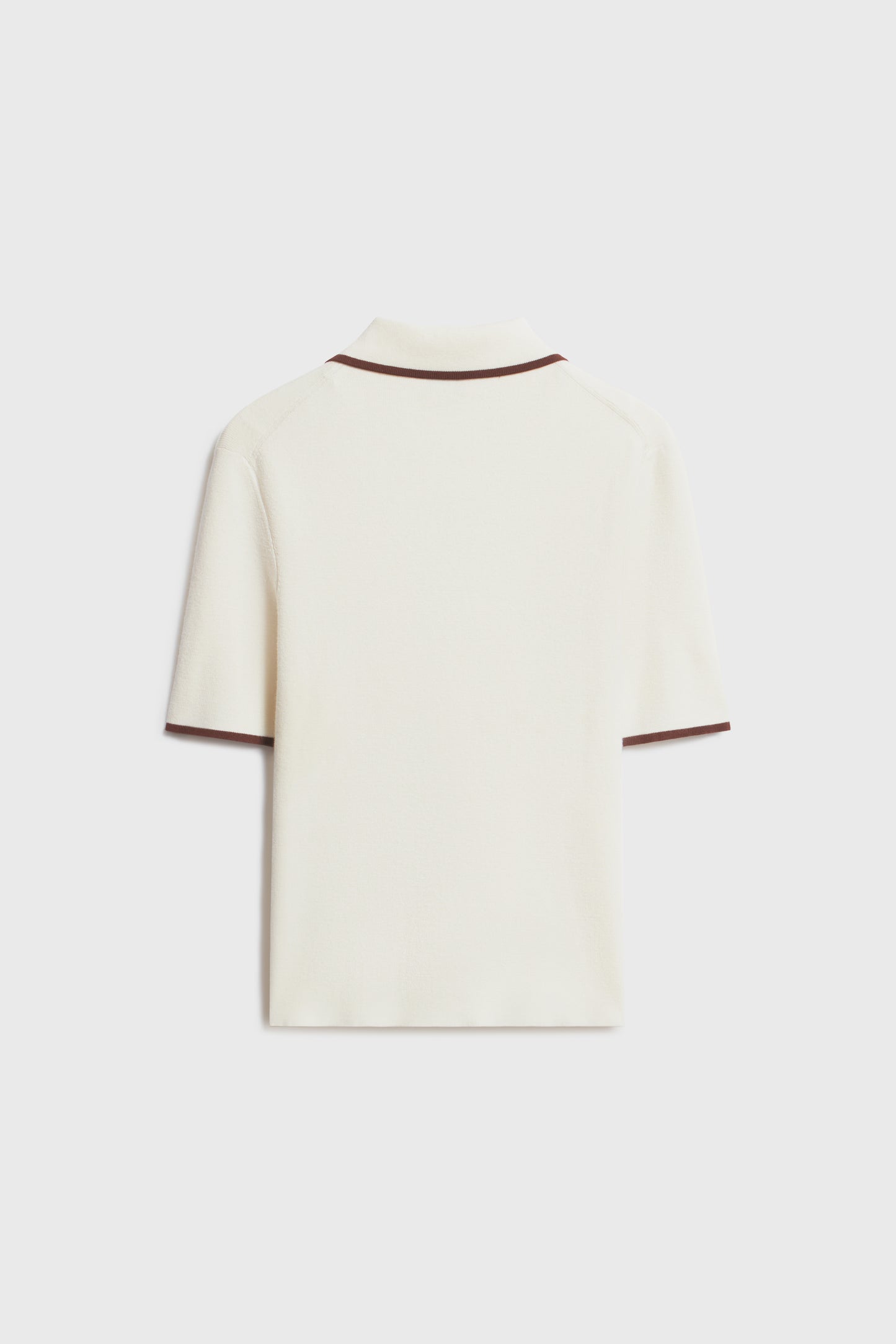 Fitted retro-style sweater with short sleeves and contrast trims. Polo collar with a zip fastening.