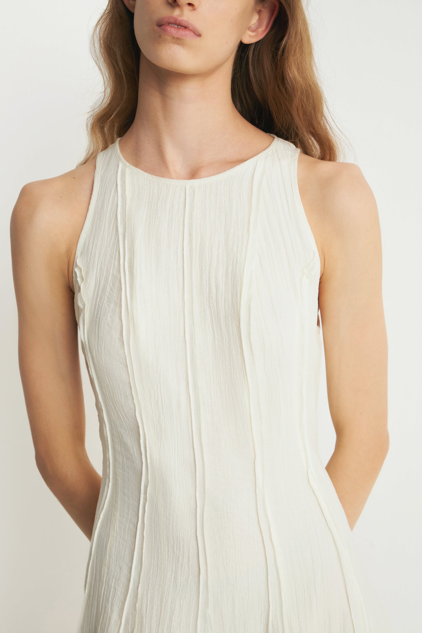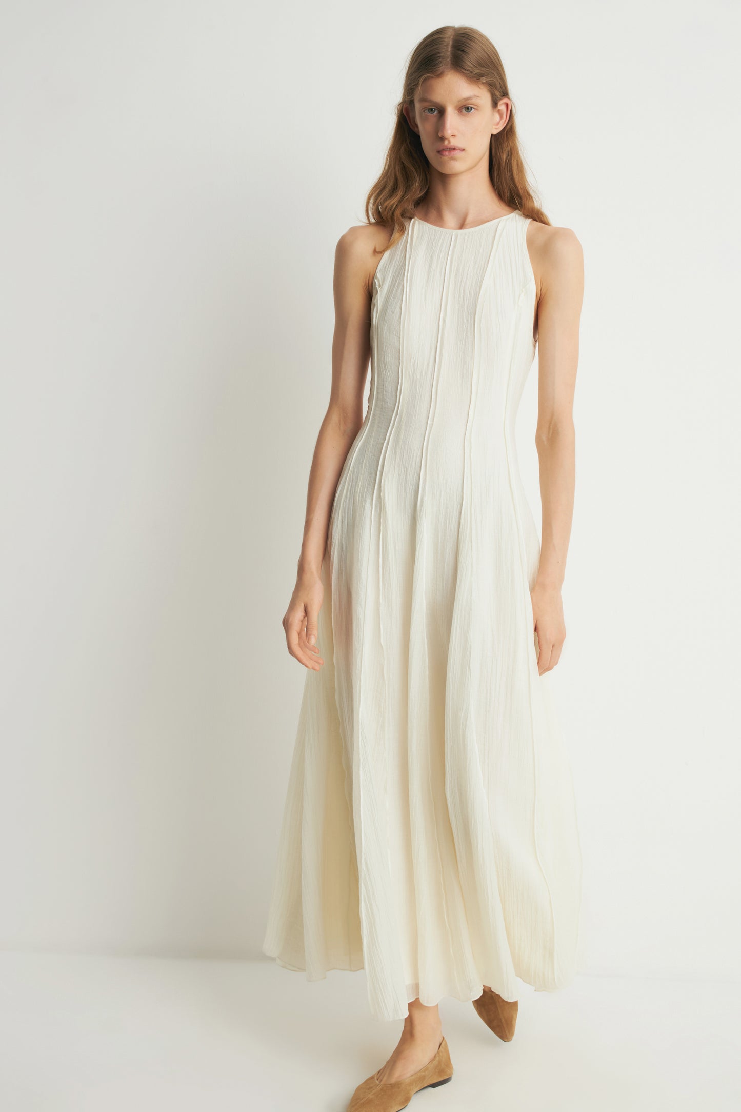 Long, flared dress in soft textured lyocell. Marked seam detail. Round neckline and a concealed back zipper with hook-and-eye fastener. Fitted bodice. Lined.