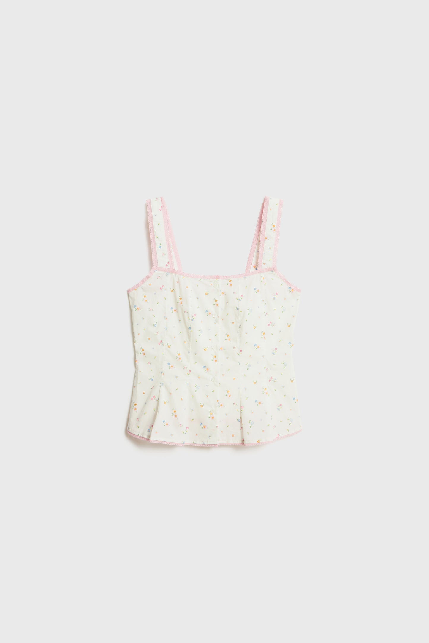 Short, fitted top in a printed cotton. Adjustable wide straps with button. Fitted bodice with two pairs of narrow ties at back, visible seams at front and button fastening.