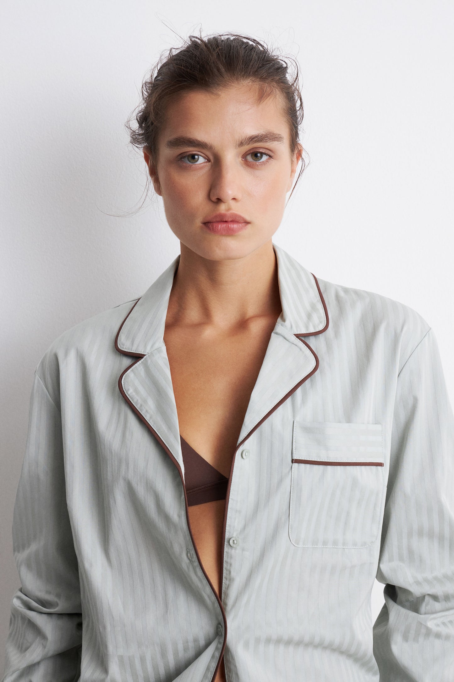 Long-sleeved shirt in soft cotton with contrasting color piping. Features a resort collar, buttons down the front, and an open chest pocket.